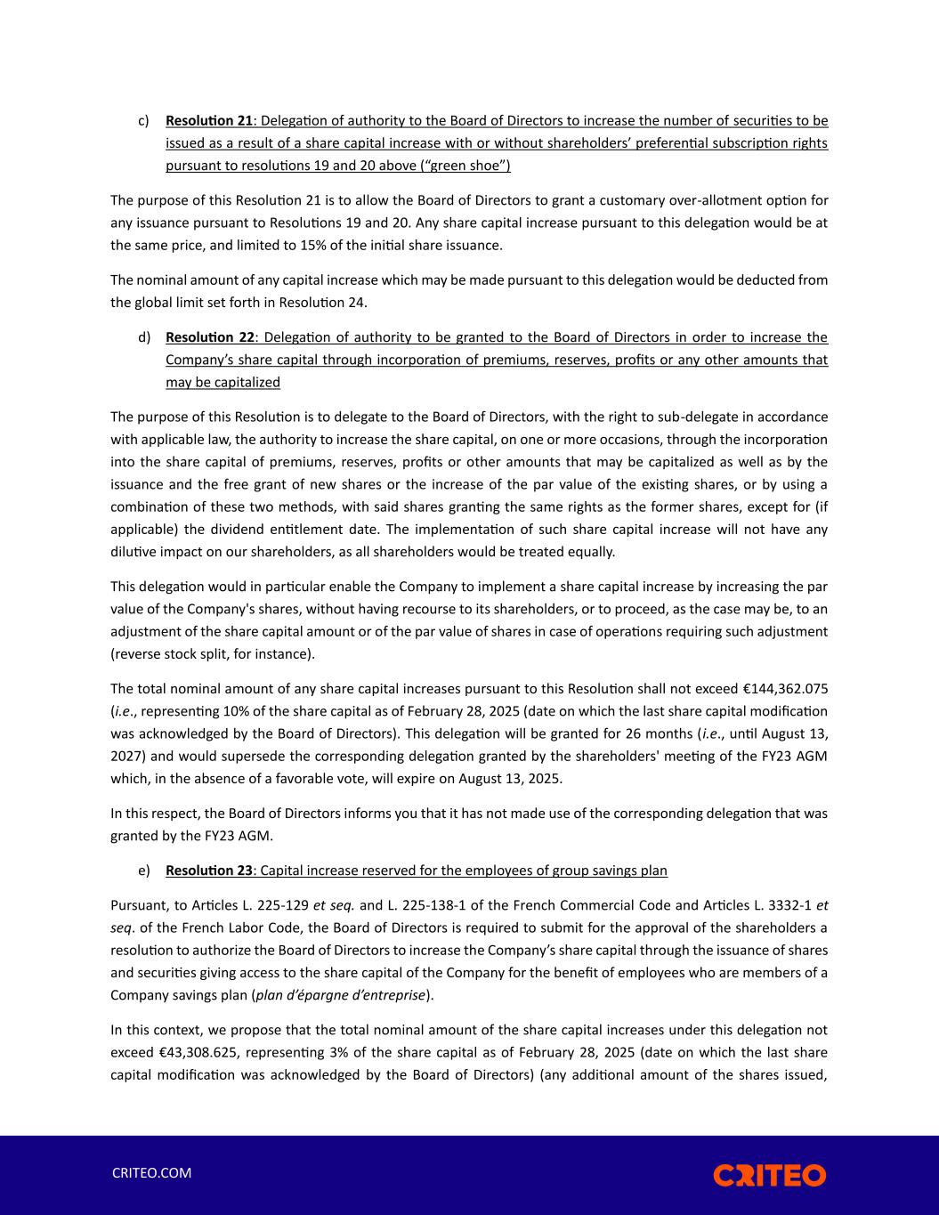 CRITEO.COM c) Resolution 21: Delegation of authority to the Board of Directors to increase the number of securities to be issued as a result of a share capital increase with or without shareholders’ preferential subscription rights pursuant to resolutions 19 and 20 above (“green shoe”) The purpose of this Resolution 21 is to allow the Board of Directors to grant a customary over-allotment option for any issuance pursuant to Resolutions 19 and 20. Any share capital increase pursuant to this delegation would be at the same price, and limited to 15% of the initial share issuance. The nominal amount of any capital increase which may be made pursuant to this delegation would be deducted from the global limit set forth in Resolution 24. d) Resolution 22: Delegation of authority to be granted to the Board of Directors in order to increase the Company’s share capital through incorporation of premiums, reserves, profits or any other amounts that may be capitalized The purpose of this Resolution is to delegate to the Board of Directors, with the right to sub-delegate in accordance with applicable law, the authority to increase the share capital, on one or more occasions, through the incorporation into the share capital of premiums, reserves, profits or other amounts that may be capitalized as well as by the issuance and the free grant of new shares or the increase of the par value of the existing shares, or by using a combination of these two methods, with said shares granting the same rights as the former shares, except for (if applicable) the dividend entitlement date. The implementation of such share capital increase will not have any dilutive impact on our shareholders, as all shareholders would be treated equally. This delegation would in particular enable the Company to implement a share capital increase by increasing the par value of the Company's shares, without having recourse to its shareholders, or to proceed, as the case may be, to an adjustment of the share capital amount or of the par value of shares in case of operations requiring such adjustment (reverse stock split, for instance). The total nominal amount of any share capital increases pursuant to this Resolution shall not exceed €144,362.075 (i.e., representing 10% of the share capital as of February 28, 2025 (date on which the last share capital modification was acknowledged by the Board of Directors). This delegation will be granted for 26 months (i.e., until August 13, 2027) and would supersede the corresponding delegation granted by the shareholders' meeting of the FY23 AGM which, in the absence of a favorable vote, will expire on August 13, 2025. In this respect, the Board of Directors informs you that it has not made use of the corresponding delegation that was granted by the FY23 AGM. e) Resolution 23: Capital increase reserved for the employees of group savings plan Pursuant, to Articles L. 225-129 et seq. and L. 225-138-1 of the French Commercial Code and Articles L. 3332-1 et seq. of the French Labor Code, the Board of Directors is required to submit for the approval of the shareholders a resolution to authorize the Board of Directors to increase the Company’s share capital through the issuance of shares and securities giving access to the share capital of the Company for the benefit of employees who are members of a Company savings plan (plan d’épargne d’entreprise). In this context, we propose that the total nominal amount of the share capital increases under this delegation not exceed €43,308.625, representing 3% of the share capital as of February 28, 2025 (date on which the last share capital modification was acknowledged by the Board of Directors) (any additional amount of the shares issued,