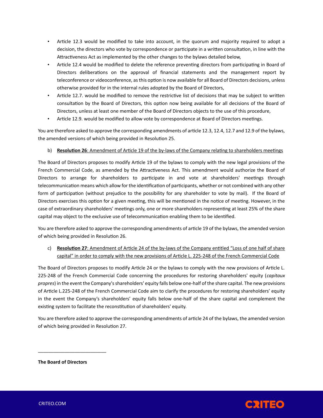 CRITEO.COM • Article 12.3 would be modified to take into account, in the quorum and majority required to adopt a decision, the directors who vote by correspondence or participate in a written consultation, in line with the Attractiveness Act as implemented by the other changes to the bylaws detailed below, • Article 12.4 would be modified to delete the reference preventing directors from participating in Board of Directors deliberations on the approval of financial statements and the management report by teleconference or videoconference, as this option is now available for all Board of Directors decisions, unless otherwise provided for in the internal rules adopted by the Board of Directors, • Article 12.7. would be modified to remove the restrictive list of decisions that may be subject to written consultation by the Board of Directors, this option now being available for all decisions of the Board of Directors, unless at least one member of the Board of Directors objects to the use of this procedure, • Article 12.9. would be modified to allow vote by correspondence at Board of Directors meetings. You are therefore asked to approve the corresponding amendments of article 12.3, 12.4, 12.7 and 12.9 of the bylaws, the amended versions of which being provided in Resolution 25. b) Resolution 26: Amendment of Article 19 of the by-laws of the Company relating to shareholders meetings The Board of Directors proposes to modify Article 19 of the bylaws to comply with the new legal provisions of the French Commercial Code, as amended by the Attractiveness Act. This amendment would authorize the Board of Directors to arrange for shareholders to participate in and vote at shareholders' meetings through telecommunication means which allow for the identification of participants, whether or not combined with any other form of participation (without prejudice to the possibility for any shareholder to vote by mail). If the Board of Directors exercises this option for a given meeting, this will be mentioned in the notice of meeting. However, in the case of extraordinary shareholders' meetings only, one or more shareholders representing at least 25% of the share capital may object to the exclusive use of telecommunication enabling them to be identified. You are therefore asked to approve the corresponding amendments of article 19 of the bylaws, the amended version of which being provided in Resolution 26. c) Resolution 27: Amendment of Article 24 of the by-laws of the Company entitled “Loss of one half of share capital” in order to comply with the new provisions of Article L. 225-248 of the French Commercial Code The Board of Directors proposes to modify Article 24 or the bylaws to comply with the new provisions of Article L. 225-248 of the French Commercial Code concerning the procedures for restoring shareholders' equity (capitaux propres) in the event the Company's shareholders' equity falls below one-half of the share capital. The new provisions of Article L.225-248 of the French Commercial Code aim to clarify the procedures for restoring shareholders’ equity in the event the Company’s shareholders’ equity falls below one-half of the share capital and complement the existing system to facilitate the reconstitution of shareholders' equity. You are therefore asked to approve the corresponding amendments of article 24 of the bylaws, the amended version of which being provided in Resolution 27. __________________________ The Board of Directors