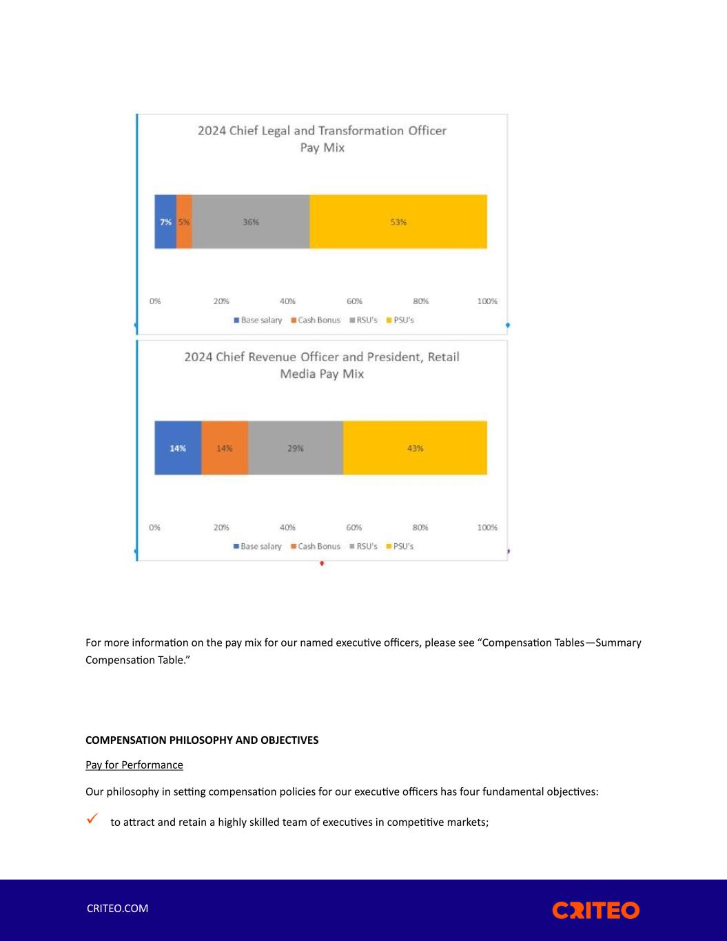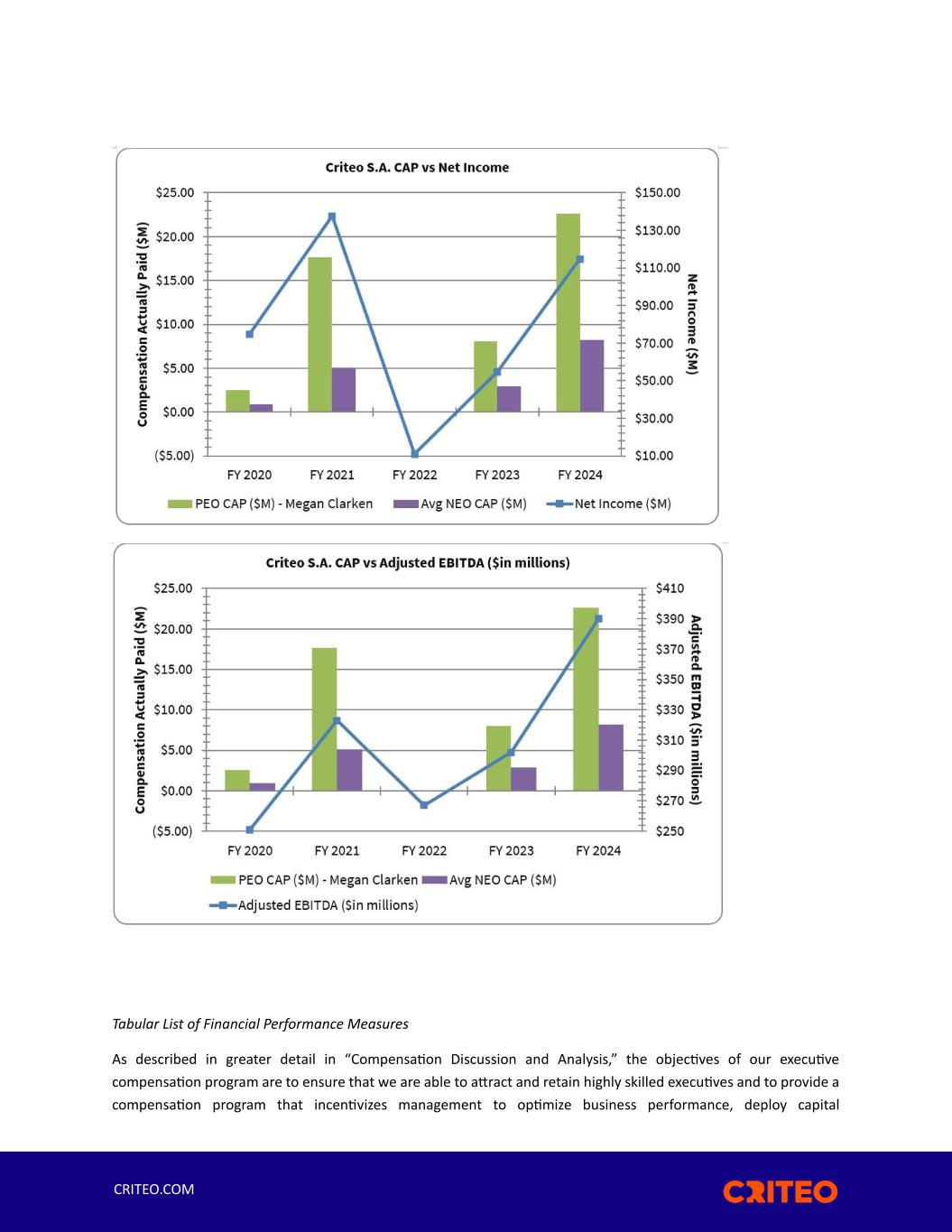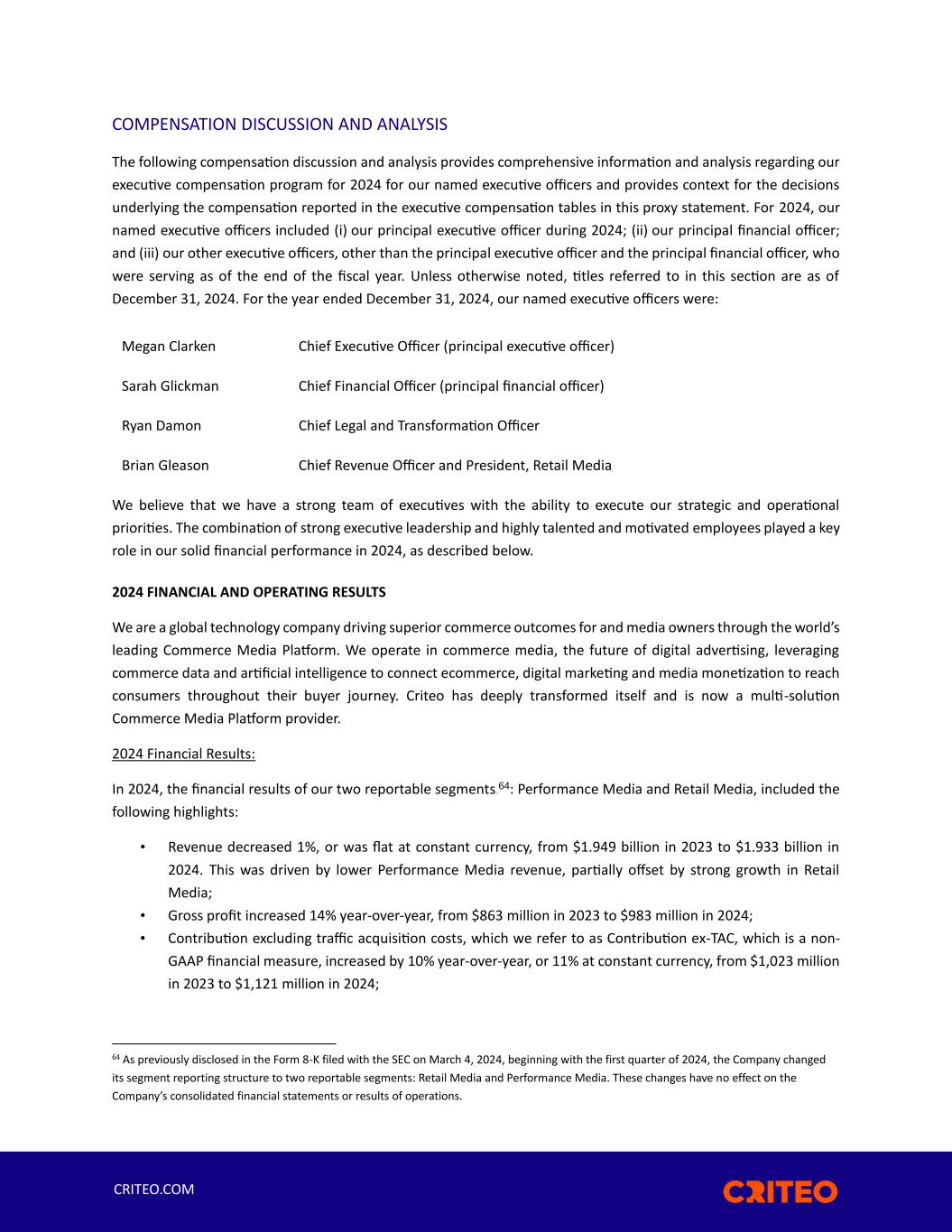 CRITEO.COM COMPENSATION DISCUSSION AND ANALYSIS The following compensation discussion and analysis provides comprehensive information and analysis regarding our executive compensation program for 2024 for our named executive officers and provides context for the decisions underlying the compensation reported in the executive compensation tables in this proxy statement. For 2024, our named executive officers included (i) our principal executive officer during 2024; (ii) our principal financial officer; and (iii) our other executive officers, other than the principal executive officer and the principal financial officer, who were serving as of the end of the fiscal year. Unless otherwise noted, titles referred to in this section are as of December 31, 2024. For the year ended December 31, 2024, our named executive officers were: Megan Clarken Chief Executive Officer (principal executive officer) Sarah Glickman Chief Financial Officer (principal financial officer) Ryan Damon Chief Legal and Transformation Officer Brian Gleason Chief Revenue Officer and President, Retail Media We believe that we have a strong team of executives with the ability to execute our strategic and operational priorities. The combination of strong executive leadership and highly talented and motivated employees played a key role in our solid financial performance in 2024, as described below. 2024 FINANCIAL AND OPERATING RESULTS We are a global technology company driving superior commerce outcomes for and media owners through the world’s leading Commerce Media Platform. We operate in commerce media, the future of digital advertising, leveraging commerce data and artificial intelligence to connect ecommerce, digital marketing and media monetization to reach consumers throughout their buyer journey. Criteo has deeply transformed itself and is now a multi-solution Commerce Media Platform provider. 2024 Financial Results: In 2024, the financial results of our two reportable segments 63F 64: Performance Media and Retail Media, included the following highlights: • Revenue decreased 1%, or was flat at constant currency, from $1.949 billion in 2023 to $1.933 billion in 2024. This was driven by lower Performance Media revenue, partially offset by strong growth in Retail Media; • Gross profit increased 14% year-over-year, from $863 million in 2023 to $983 million in 2024; • Contribution excluding traffic acquisition costs, which we refer to as Contribution ex-TAC, which is a non- GAAP financial measure, increased by 10% year-over-year, or 11% at constant currency, from $1,023 million in 2023 to $1,121 million in 2024; 64 As previously disclosed in the Form 8-K filed with the SEC on March 4, 2024, beginning with the first quarter of 2024, the Company changed its segment reporting structure to two reportable segments: Retail Media and Performance Media. These changes have no effect on the Company’s consolidated financial statements or results of operations.