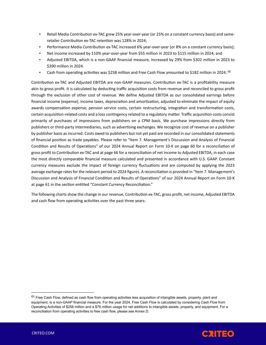 CRITEO.COM • Retail Media Contribution ex-TAC grew 25% year-over-year (or 25% on a constant currency basis) and same- retailer Contribution ex-TAC retention was 128% in 2024; • Performance Media Contribution ex-TAC increased 6% year-over-year (or 8% on a constant currency basis); • Net income increased by 110% year-over-year from $55 million in 2023 to $115 million in 2024; and • Adjusted EBITDA, which is a non-GAAP financial measure, increased by 29% from $302 million in 2023 to $390 million in 2024. • Cash from operating activities was $258 million and Free Cash Flow amounted to $182 million in 2024. 64F 65 Contribution ex-TAC and Adjusted EBITDA are non-GAAP measures. Contribution ex-TAC is a profitability measure akin to gross profit. It is calculated by deducting traffic acquisition costs from revenue and reconciled to gross profit through the exclusion of other cost of revenue. We define Adjusted EBITDA as our consolidated earnings before financial income (expense), income taxes, depreciation and amortization, adjusted to eliminate the impact of equity awards compensation expense, pension service costs, certain restructuring, integration and transformation costs, certain acquisition-related costs and a loss contingency related to a regulatory matter. Traffic acquisition costs consist primarily of purchases of impressions from publishers on a CPM basis. We purchase impressions directly from publishers or third-party intermediaries, such as advertising exchanges. We recognize cost of revenue on a publisher by publisher basis as incurred. Costs owed to publishers but not yet paid are recorded in our consolidated statements of financial position as trade payables. Please refer to “Item 7. Management’s Discussion and Analysis of Financial Condition and Results of Operations” of our 2024 Annual Report on Form 10-K on page 60 for a reconciliation of gross profit to Contribution ex-TAC and at page 66 for a reconciliation of net income to Adjusted EBITDA, in each case the most directly comparable financial measure calculated and presented in accordance with U.S. GAAP. Constant currency measures exclude the impact of foreign currency fluctuations and are computed by applying the 2023 average exchange rates for the relevant period to 2024 figures. A reconciliation is provided in “Item 7. Management’s Discussion and Analysis of Financial Condition and Results of Operations” of our 2024 Annual Report on Form 10-K at page 61 in the section entitled “Constant Currency Reconciliation.” The following charts show the change in our revenue, Contribution ex-TAC, gross profit, net income, Adjusted EBITDA and cash flow from operating activities over the past three years: 65 Free Cash Flow, defined as cash flow from operating activities less acquisition of intangible assets, property, plant and equipment, is a non-GAAP financial measure. For the year 2024, Free Cash Flow is calculated by considering Cash Flow from Operating Activities of $258 million and a $76 million usage for net additions to intangible assets, property, and equipment. For a reconciliation from operating activities to free cash flow, please see Annex D.