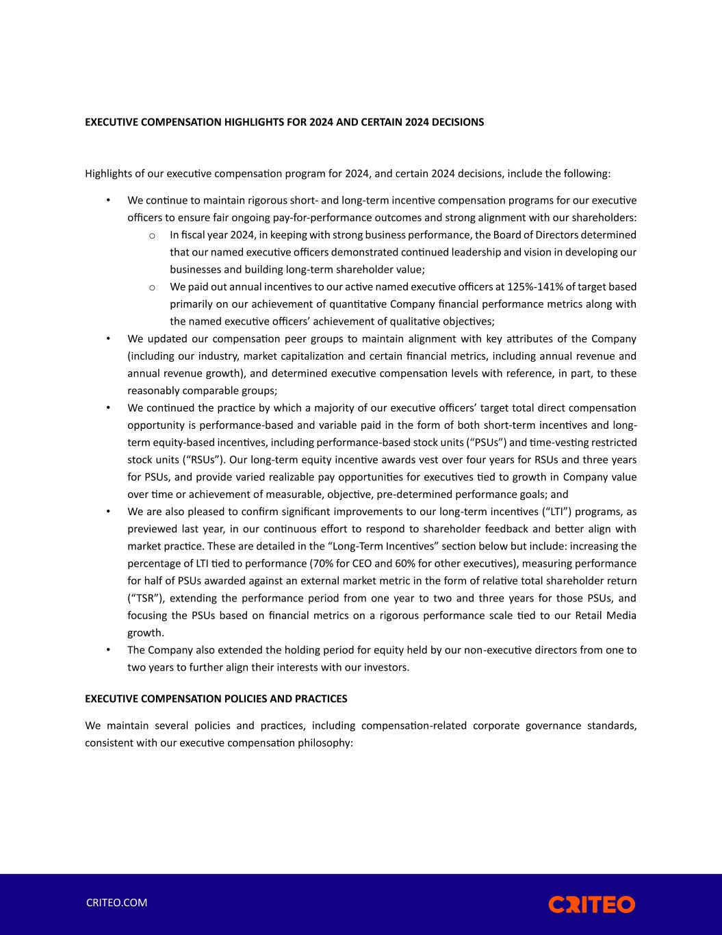 CRITEO.COM EXECUTIVE COMPENSATION HIGHLIGHTS FOR 2024 AND CERTAIN 2024 DECISIONS Highlights of our executive compensation program for 2024, and certain 2024 decisions, include the following: • We continue to maintain rigorous short- and long-term incentive compensation programs for our executive officers to ensure fair ongoing pay-for-performance outcomes and strong alignment with our shareholders: o In fiscal year 2024, in keeping with strong business performance, the Board of Directors determined that our named executive officers demonstrated continued leadership and vision in developing our businesses and building long-term shareholder value; o We paid out annual incentives to our active named executive officers at 125%-141% of target based primarily on our achievement of quantitative Company financial performance metrics along with the named executive officers’ achievement of qualitative objectives; • We updated our compensation peer groups to maintain alignment with key attributes of the Company (including our industry, market capitalization and certain financial metrics, including annual revenue and annual revenue growth), and determined executive compensation levels with reference, in part, to these reasonably comparable groups; • We continued the practice by which a majority of our executive officers’ target total direct compensation opportunity is performance-based and variable paid in the form of both short-term incentives and long- term equity-based incentives, including performance-based stock units (“PSUs”) and time-vesting restricted stock units (“RSUs”). Our long-term equity incentive awards vest over four years for RSUs and three years for PSUs, and provide varied realizable pay opportunities for executives tied to growth in Company value over time or achievement of measurable, objective, pre-determined performance goals; and • We are also pleased to confirm significant improvements to our long-term incentives (“LTI”) programs, as previewed last year, in our continuous effort to respond to shareholder feedback and better align with market practice. These are detailed in the “Long-Term Incentives” section below but include: increasing the percentage of LTI tied to performance (70% for CEO and 60% for other executives), measuring performance for half of PSUs awarded against an external market metric in the form of relative total shareholder return (“TSR”), extending the performance period from one year to two and three years for those PSUs, and focusing the PSUs based on financial metrics on a rigorous performance scale tied to our Retail Media growth. • The Company also extended the holding period for equity held by our non-executive directors from one to two years to further align their interests with our investors. EXECUTIVE COMPENSATION POLICIES AND PRACTICES We maintain several policies and practices, including compensation-related corporate governance standards, consistent with our executive compensation philosophy: