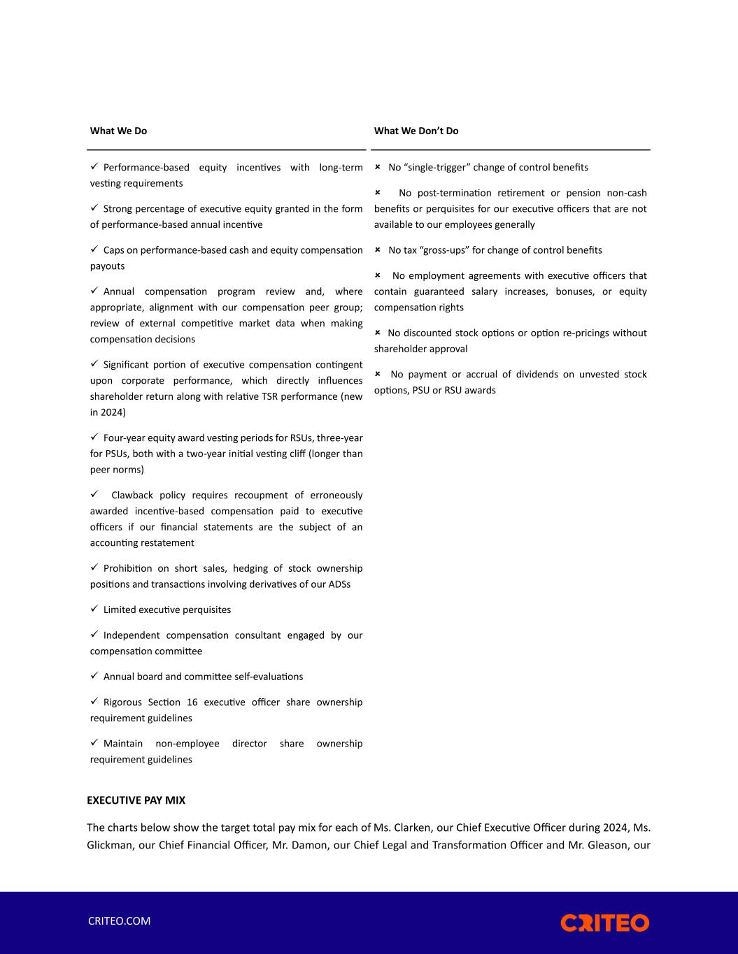 CRITEO.COM What We Do What We Don’t Do ✓ Performance-based equity incentives with long-term vesting requirements ✓ Strong percentage of executive equity granted in the form of performance-based annual incentive ✓ Caps on performance-based cash and equity compensation payouts ✓ Annual compensation program review and, where appropriate, alignment with our compensation peer group; review of external competitive market data when making compensation decisions ✓ Significant portion of executive compensation contingent upon corporate performance, which directly influences shareholder return along with relative TSR performance (new in 2024) ✓ Four-year equity award vesting periods for RSUs, three-year for PSUs, both with a two-year initial vesting cliff (longer than peer norms) ✓ Clawback policy requires recoupment of erroneously awarded incentive-based compensation paid to executive officers if our financial statements are the subject of an accounting restatement ✓ Prohibition on short sales, hedging of stock ownership positions and transactions involving derivatives of our ADSs ✓ Limited executive perquisites ✓ Independent compensation consultant engaged by our compensation committee ✓ Annual board and committee self-evaluations ✓ Rigorous Section 16 executive officer share ownership requirement guidelines ✓ Maintain non-employee director share ownership requirement guidelines No “single-trigger” change of control benefits No post-termination retirement or pension non-cash benefits or perquisites for our executive officers that are not available to our employees generally No tax “gross-ups” for change of control benefits No employment agreements with executive officers that contain guaranteed salary increases, bonuses, or equity compensation rights No discounted stock options or option re-pricings without shareholder approval No payment or accrual of dividends on unvested stock options, PSU or RSU awards EXECUTIVE PAY MIX The charts below show the target total pay mix for each of Ms. Clarken, our Chief Executive Officer during 2024, Ms. Glickman, our Chief Financial Officer, Mr. Damon, our Chief Legal and Transformation Officer and Mr. Gleason, our
