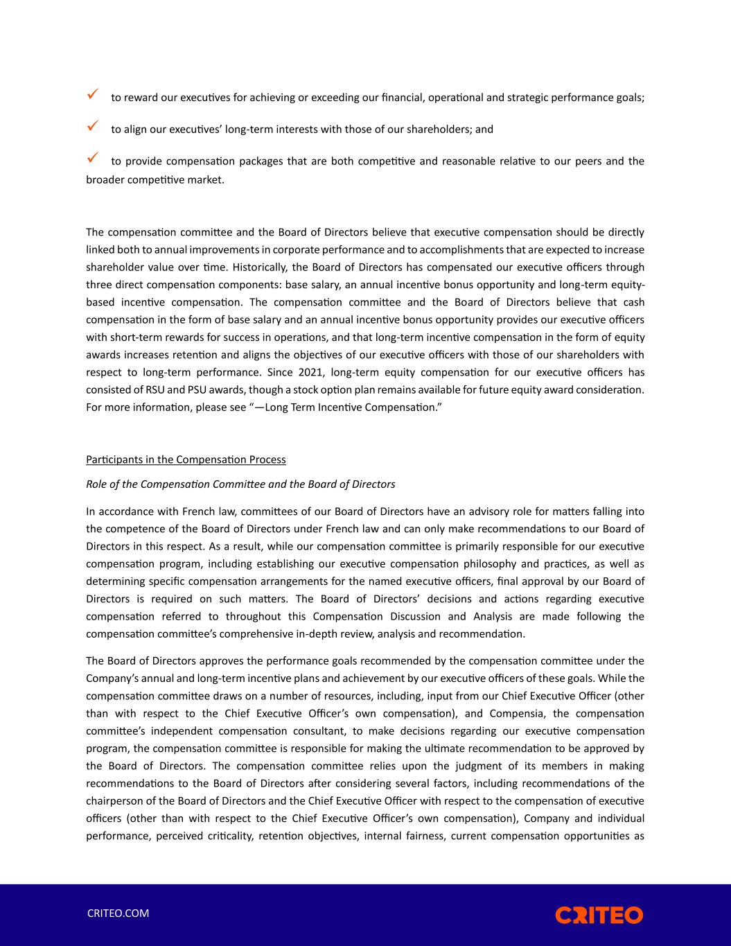 CRITEO.COM ✓ to reward our executives for achieving or exceeding our financial, operational and strategic performance goals; ✓ to align our executives’ long-term interests with those of our shareholders; and ✓ to provide compensation packages that are both competitive and reasonable relative to our peers and the broader competitive market. The compensation committee and the Board of Directors believe that executive compensation should be directly linked both to annual improvements in corporate performance and to accomplishments that are expected to increase shareholder value over time. Historically, the Board of Directors has compensated our executive officers through three direct compensation components: base salary, an annual incentive bonus opportunity and long-term equity- based incentive compensation. The compensation committee and the Board of Directors believe that cash compensation in the form of base salary and an annual incentive bonus opportunity provides our executive officers with short-term rewards for success in operations, and that long-term incentive compensation in the form of equity awards increases retention and aligns the objectives of our executive officers with those of our shareholders with respect to long-term performance. Since 2021, long-term equity compensation for our executive officers has consisted of RSU and PSU awards, though a stock option plan remains available for future equity award consideration. For more information, please see “—Long Term Incentive Compensation.” Participants in the Compensation Process Role of the Compensation Committee and the Board of Directors In accordance with French law, committees of our Board of Directors have an advisory role for matters falling into the competence of the Board of Directors under French law and can only make recommendations to our Board of Directors in this respect. As a result, while our compensation committee is primarily responsible for our executive compensation program, including establishing our executive compensation philosophy and practices, as well as determining specific compensation arrangements for the named executive officers, final approval by our Board of Directors is required on such matters. The Board of Directors’ decisions and actions regarding executive compensation referred to throughout this Compensation Discussion and Analysis are made following the compensation committee’s comprehensive in-depth review, analysis and recommendation. The Board of Directors approves the performance goals recommended by the compensation committee under the Company’s annual and long-term incentive plans and achievement by our executive officers of these goals. While the compensation committee draws on a number of resources, including, input from our Chief Executive Officer (other than with respect to the Chief Executive Officer’s own compensation), and Compensia, the compensation committee’s independent compensation consultant, to make decisions regarding our executive compensation program, the compensation committee is responsible for making the ultimate recommendation to be approved by the Board of Directors. The compensation committee relies upon the judgment of its members in making recommendations to the Board of Directors after considering several factors, including recommendations of the chairperson of the Board of Directors and the Chief Executive Officer with respect to the compensation of executive officers (other than with respect to the Chief Executive Officer’s own compensation), Company and individual performance, perceived criticality, retention objectives, internal fairness, current compensation opportunities as