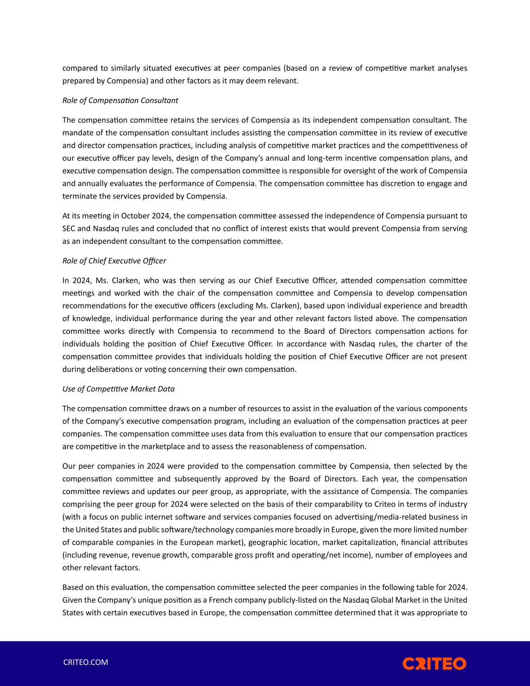 CRITEO.COM compared to similarly situated executives at peer companies (based on a review of competitive market analyses prepared by Compensia) and other factors as it may deem relevant. Role of Compensation Consultant The compensation committee retains the services of Compensia as its independent compensation consultant. The mandate of the compensation consultant includes assisting the compensation committee in its review of executive and director compensation practices, including analysis of competitive market practices and the competitiveness of our executive officer pay levels, design of the Company’s annual and long-term incentive compensation plans, and executive compensation design. The compensation committee is responsible for oversight of the work of Compensia and annually evaluates the performance of Compensia. The compensation committee has discretion to engage and terminate the services provided by Compensia. At its meeting in October 2024, the compensation committee assessed the independence of Compensia pursuant to SEC and Nasdaq rules and concluded that no conflict of interest exists that would prevent Compensia from serving as an independent consultant to the compensation committee. Role of Chief Executive Officer In 2024, Ms. Clarken, who was then serving as our Chief Executive Officer, attended compensation committee meetings and worked with the chair of the compensation committee and Compensia to develop compensation recommendations for the executive officers (excluding Ms. Clarken), based upon individual experience and breadth of knowledge, individual performance during the year and other relevant factors listed above. The compensation committee works directly with Compensia to recommend to the Board of Directors compensation actions for individuals holding the position of Chief Executive Officer. In accordance with Nasdaq rules, the charter of the compensation committee provides that individuals holding the position of Chief Executive Officer are not present during deliberations or voting concerning their own compensation. Use of Competitive Market Data The compensation committee draws on a number of resources to assist in the evaluation of the various components of the Company’s executive compensation program, including an evaluation of the compensation practices at peer companies. The compensation committee uses data from this evaluation to ensure that our compensation practices are competitive in the marketplace and to assess the reasonableness of compensation. Our peer companies in 2024 were provided to the compensation committee by Compensia, then selected by the compensation committee and subsequently approved by the Board of Directors. Each year, the compensation committee reviews and updates our peer group, as appropriate, with the assistance of Compensia. The companies comprising the peer group for 2024 were selected on the basis of their comparability to Criteo in terms of industry (with a focus on public internet software and services companies focused on advertising/media-related business in the United States and public software/technology companies more broadly in Europe, given the more limited number of comparable companies in the European market), geographic location, market capitalization, financial attributes (including revenue, revenue growth, comparable gross profit and operating/net income), number of employees and other relevant factors. Based on this evaluation, the compensation committee selected the peer companies in the following table for 2024. Given the Company’s unique position as a French company publicly-listed on the Nasdaq Global Market in the United States with certain executives based in Europe, the compensation committee determined that it was appropriate to