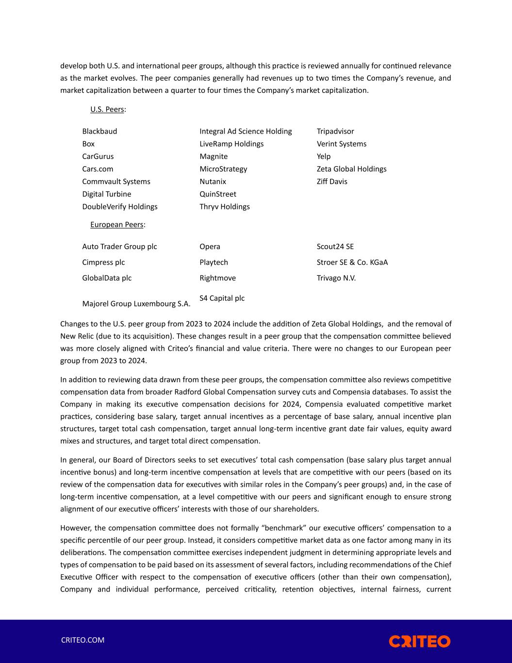 CRITEO.COM develop both U.S. and international peer groups, although this practice is reviewed annually for continued relevance as the market evolves. The peer companies generally had revenues up to two times the Company’s revenue, and market capitalization between a quarter to four times the Company’s market capitalization. U.S. Peers: Blackbaud Integral Ad Science Holding Tripadvisor Box LiveRamp Holdings Verint Systems CarGurus Magnite Yelp Cars.com MicroStrategy Zeta Global Holdings Commvault Systems Nutanix Ziff Davis Digital Turbine QuinStreet DoubleVerify Holdings Thryv Holdings European Peers: Auto Trader Group plc Opera Scout24 SE Cimpress plc Playtech Stroer SE & Co. KGaA GlobalData plc Rightmove Trivago N.V. Majorel Group Luxembourg S.A. S4 Capital plc Changes to the U.S. peer group from 2023 to 2024 include the addition of Zeta Global Holdings, and the removal of New Relic (due to its acquisition). These changes result in a peer group that the compensation committee believed was more closely aligned with Criteo’s financial and value criteria. There were no changes to our European peer group from 2023 to 2024. In addition to reviewing data drawn from these peer groups, the compensation committee also reviews competitive compensation data from broader Radford Global Compensation survey cuts and Compensia databases. To assist the Company in making its executive compensation decisions for 2024, Compensia evaluated competitive market practices, considering base salary, target annual incentives as a percentage of base salary, annual incentive plan structures, target total cash compensation, target annual long-term incentive grant date fair values, equity award mixes and structures, and target total direct compensation. In general, our Board of Directors seeks to set executives’ total cash compensation (base salary plus target annual incentive bonus) and long-term incentive compensation at levels that are competitive with our peers (based on its review of the compensation data for executives with similar roles in the Company’s peer groups) and, in the case of long-term incentive compensation, at a level competitive with our peers and significant enough to ensure strong alignment of our executive officers’ interests with those of our shareholders. However, the compensation committee does not formally “benchmark” our executive officers’ compensation to a specific percentile of our peer group. Instead, it considers competitive market data as one factor among many in its deliberations. The compensation committee exercises independent judgment in determining appropriate levels and types of compensation to be paid based on its assessment of several factors, including recommendations of the Chief Executive Officer with respect to the compensation of executive officers (other than their own compensation), Company and individual performance, perceived criticality, retention objectives, internal fairness, current