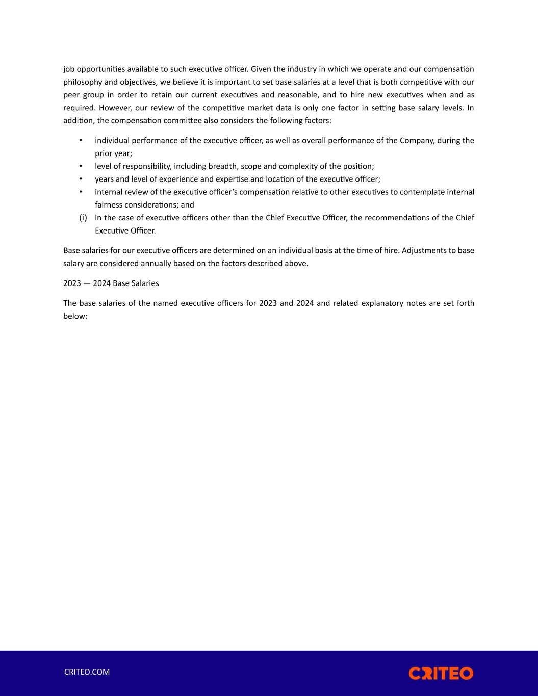 CRITEO.COM job opportunities available to such executive officer. Given the industry in which we operate and our compensation philosophy and objectives, we believe it is important to set base salaries at a level that is both competitive with our peer group in order to retain our current executives and reasonable, and to hire new executives when and as required. However, our review of the competitive market data is only one factor in setting base salary levels. In addition, the compensation committee also considers the following factors: • individual performance of the executive officer, as well as overall performance of the Company, during the prior year; • level of responsibility, including breadth, scope and complexity of the position; • years and level of experience and expertise and location of the executive officer; • internal review of the executive officer’s compensation relative to other executives to contemplate internal fairness considerations; and (i) in the case of executive officers other than the Chief Executive Officer, the recommendations of the Chief Executive Officer. Base salaries for our executive officers are determined on an individual basis at the time of hire. Adjustments to base salary are considered annually based on the factors described above. 2023 — 2024 Base Salaries The base salaries of the named executive officers for 2023 and 2024 and related explanatory notes are set forth below: