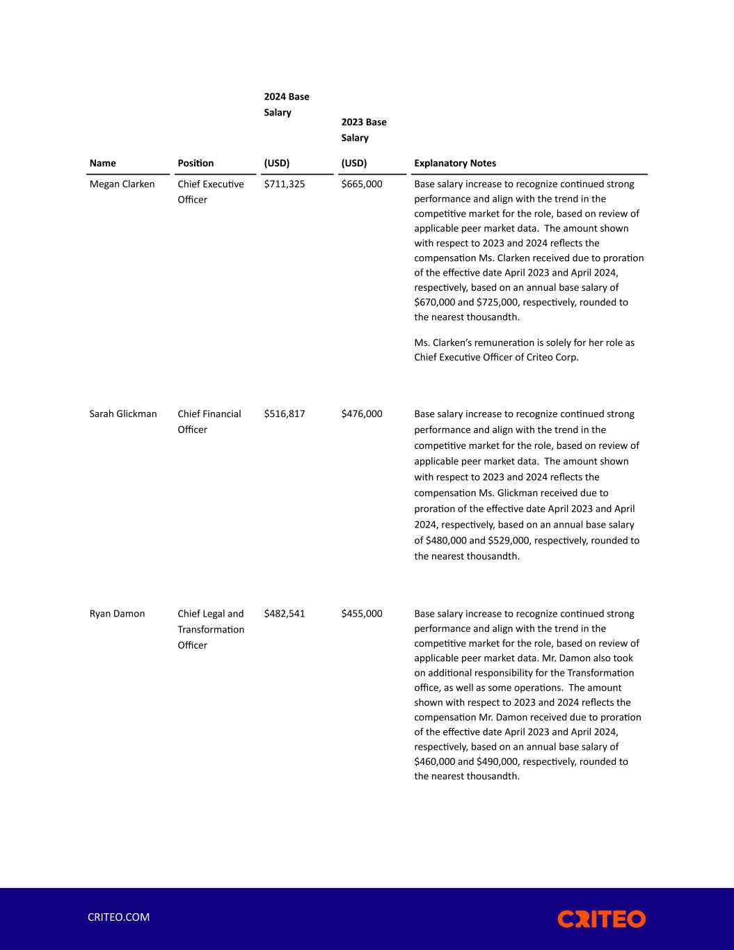 CRITEO.COM Name Position 2024 Base Salary (USD) 2023 Base Salary (USD) Explanatory Notes Megan Clarken Chief Executive Officer $711,325 $665,000 Base salary increase to recognize continued strong performance and align with the trend in the competitive market for the role, based on review of applicable peer market data. The amount shown with respect to 2023 and 2024 reflects the compensation Ms. Clarken received due to proration of the effective date April 2023 and April 2024, respectively, based on an annual base salary of $670,000 and $725,000, respectively, rounded to the nearest thousandth. Ms. Clarken’s remuneration is solely for her role as Chief Executive Officer of Criteo Corp. Sarah Glickman Chief Financial Officer $516,817 $476,000 Base salary increase to recognize continued strong performance and align with the trend in the competitive market for the role, based on review of applicable peer market data. The amount shown with respect to 2023 and 2024 reflects the compensation Ms. Glickman received due to proration of the effective date April 2023 and April 2024, respectively, based on an annual base salary of $480,000 and $529,000, respectively, rounded to the nearest thousandth. Ryan Damon Chief Legal and Transformation Officer $482,541 $455,000 Base salary increase to recognize continued strong performance and align with the trend in the competitive market for the role, based on review of applicable peer market data. Mr. Damon also took on additional responsibility for the Transformation office, as well as some operations. The amount shown with respect to 2023 and 2024 reflects the compensation Mr. Damon received due to proration of the effective date April 2023 and April 2024, respectively, based on an annual base salary of $460,000 and $490,000, respectively, rounded to the nearest thousandth.