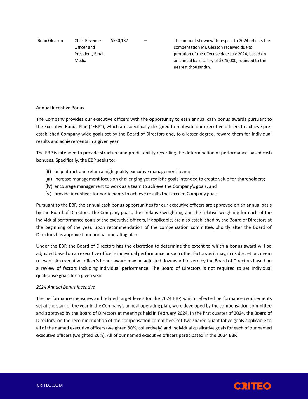 CRITEO.COM Brian Gleason Chief Revenue Officer and President, Retail Media $550,137 — The amount shown with respect to 2024 reflects the compensation Mr. Gleason received due to proration of the effective date July 2024, based on an annual base salary of $575,000, rounded to the nearest thousandth. Annual Incentive Bonus The Company provides our executive officers with the opportunity to earn annual cash bonus awards pursuant to the Executive Bonus Plan (“EBP”), which are specifically designed to motivate our executive officers to achieve pre- established Company-wide goals set by the Board of Directors and, to a lesser degree, reward them for individual results and achievements in a given year. The EBP is intended to provide structure and predictability regarding the determination of performance-based cash bonuses. Specifically, the EBP seeks to: (ii) help attract and retain a high quality executive management team; (iii) increase management focus on challenging yet realistic goals intended to create value for shareholders; (iv) encourage management to work as a team to achieve the Company’s goals; and (v) provide incentives for participants to achieve results that exceed Company goals. Pursuant to the EBP, the annual cash bonus opportunities for our executive officers are approved on an annual basis by the Board of Directors. The Company goals, their relative weighting, and the relative weighting for each of the individual performance goals of the executive officers, if applicable, are also established by the Board of Directors at the beginning of the year, upon recommendation of the compensation committee, shortly after the Board of Directors has approved our annual operating plan. Under the EBP, the Board of Directors has the discretion to determine the extent to which a bonus award will be adjusted based on an executive officer’s individual performance or such other factors as it may, in its discretion, deem relevant. An executive officer’s bonus award may be adjusted downward to zero by the Board of Directors based on a review of factors including individual performance. The Board of Directors is not required to set individual qualitative goals for a given year. 2024 Annual Bonus Incentive The performance measures and related target levels for the 2024 EBP, which reflected performance requirements set at the start of the year in the Company’s annual operating plan, were developed by the compensation committee and approved by the Board of Directors at meetings held in February 2024. In the first quarter of 2024, the Board of Directors, on the recommendation of the compensation committee, set two shared quantitative goals applicable to all of the named executive officers (weighted 80%, collectively) and individual qualitative goals for each of our named executive officers (weighted 20%). All of our named executive officers participated in the 2024 EBP.