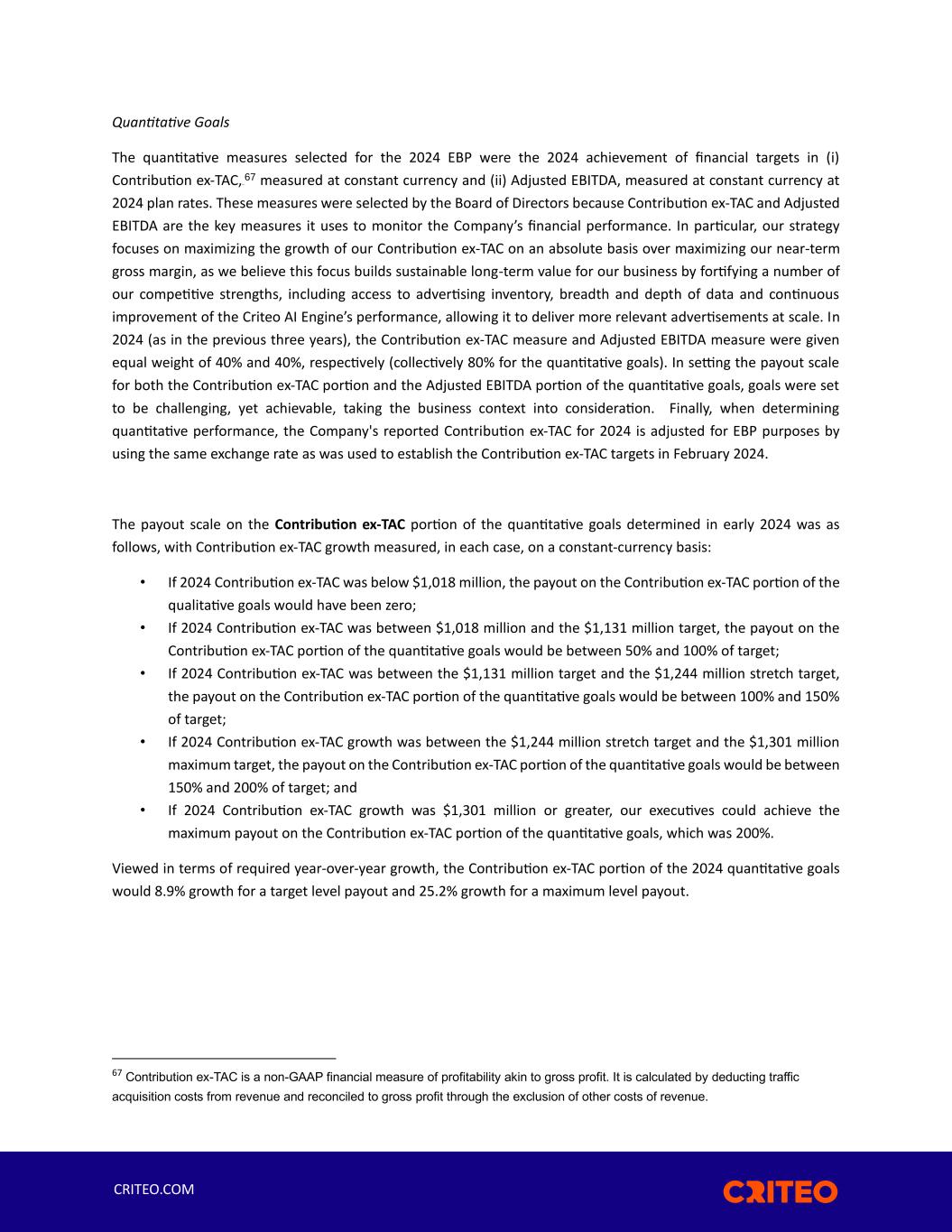 CRITEO.COM Quantitative Goals The quantitative measures selected for the 2024 EBP were the 2024 achievement of financial targets in (i) Contribution ex-TAC,66F 67 measured at constant currency and (ii) Adjusted EBITDA, measured at constant currency at 2024 plan rates. These measures were selected by the Board of Directors because Contribution ex-TAC and Adjusted EBITDA are the key measures it uses to monitor the Company’s financial performance. In particular, our strategy focuses on maximizing the growth of our Contribution ex-TAC on an absolute basis over maximizing our near-term gross margin, as we believe this focus builds sustainable long-term value for our business by fortifying a number of our competitive strengths, including access to advertising inventory, breadth and depth of data and continuous improvement of the Criteo AI Engine’s performance, allowing it to deliver more relevant advertisements at scale. In 2024 (as in the previous three years), the Contribution ex-TAC measure and Adjusted EBITDA measure were given equal weight of 40% and 40%, respectively (collectively 80% for the quantitative goals). In setting the payout scale for both the Contribution ex-TAC portion and the Adjusted EBITDA portion of the quantitative goals, goals were set to be challenging, yet achievable, taking the business context into consideration. Finally, when determining quantitative performance, the Company's reported Contribution ex-TAC for 2024 is adjusted for EBP purposes by using the same exchange rate as was used to establish the Contribution ex-TAC targets in February 2024. The payout scale on the Contribution ex-TAC portion of the quantitative goals determined in early 2024 was as follows, with Contribution ex-TAC growth measured, in each case, on a constant-currency basis: • If 2024 Contribution ex-TAC was below $1,018 million, the payout on the Contribution ex-TAC portion of the qualitative goals would have been zero; • If 2024 Contribution ex-TAC was between $1,018 million and the $1,131 million target, the payout on the Contribution ex-TAC portion of the quantitative goals would be between 50% and 100% of target; • If 2024 Contribution ex-TAC was between the $1,131 million target and the $1,244 million stretch target, the payout on the Contribution ex-TAC portion of the quantitative goals would be between 100% and 150% of target; • If 2024 Contribution ex-TAC growth was between the $1,244 million stretch target and the $1,301 million maximum target, the payout on the Contribution ex-TAC portion of the quantitative goals would be between 150% and 200% of target; and • If 2024 Contribution ex-TAC growth was $1,301 million or greater, our executives could achieve the maximum payout on the Contribution ex-TAC portion of the quantitative goals, which was 200%. Viewed in terms of required year-over-year growth, the Contribution ex-TAC portion of the 2024 quantitative goals would 8.9% growth for a target level payout and 25.2% growth for a maximum level payout. 67 Contribution ex-TAC is a non-GAAP financial measure of profitability akin to gross profit. It is calculated by deducting traffic acquisition costs from revenue and reconciled to gross profit through the exclusion of other costs of revenue.