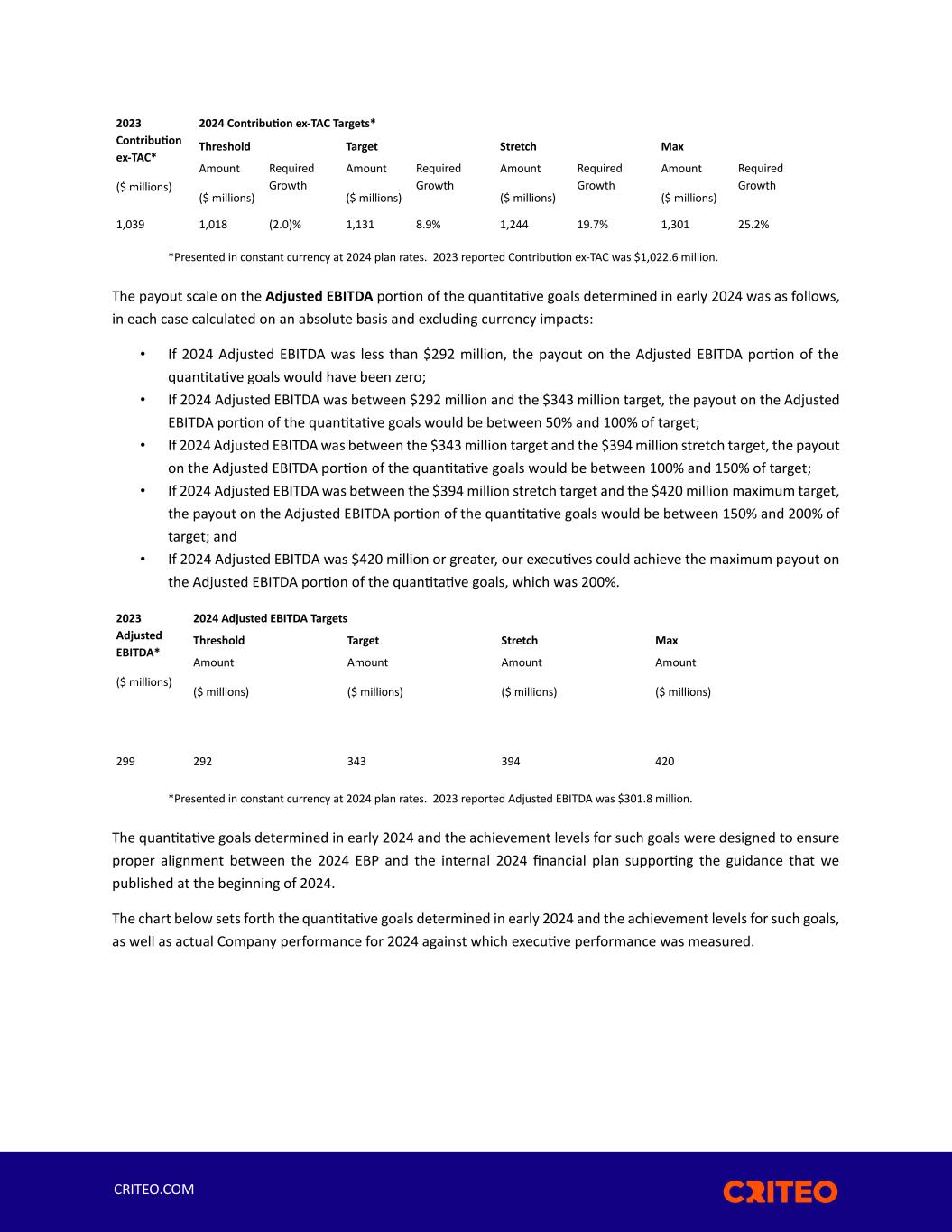 CRITEO.COM 2023 Contribution ex-TAC* ($ millions) 2024 Contribution ex-TAC Targets* Threshold Target Stretch Max Amount ($ millions) Required Growth Amount ($ millions) Required Growth Amount ($ millions) Required Growth Amount ($ millions) Required Growth 1,039 1,018 (2.0)% 1,131 8.9% 1,244 19.7% 1,301 25.2% *Presented in constant currency at 2024 plan rates. 2023 reported Contribution ex-TAC was $1,022.6 million. The payout scale on the Adjusted EBITDA portion of the quantitative goals determined in early 2024 was as follows, in each case calculated on an absolute basis and excluding currency impacts: • If 2024 Adjusted EBITDA was less than $292 million, the payout on the Adjusted EBITDA portion of the quantitative goals would have been zero; • If 2024 Adjusted EBITDA was between $292 million and the $343 million target, the payout on the Adjusted EBITDA portion of the quantitative goals would be between 50% and 100% of target; • If 2024 Adjusted EBITDA was between the $343 million target and the $394 million stretch target, the payout on the Adjusted EBITDA portion of the quantitative goals would be between 100% and 150% of target; • If 2024 Adjusted EBITDA was between the $394 million stretch target and the $420 million maximum target, the payout on the Adjusted EBITDA portion of the quantitative goals would be between 150% and 200% of target; and • If 2024 Adjusted EBITDA was $420 million or greater, our executives could achieve the maximum payout on the Adjusted EBITDA portion of the quantitative goals, which was 200%. 2023 Adjusted EBITDA* ($ millions) 2024 Adjusted EBITDA Targets Threshold Target Stretch Max Amount ($ millions) Amount ($ millions) Amount ($ millions) Amount ($ millions) 299 292 343 394 420 *Presented in constant currency at 2024 plan rates. 2023 reported Adjusted EBITDA was $301.8 million. The quantitative goals determined in early 2024 and the achievement levels for such goals were designed to ensure proper alignment between the 2024 EBP and the internal 2024 financial plan supporting the guidance that we published at the beginning of 2024. The chart below sets forth the quantitative goals determined in early 2024 and the achievement levels for such goals, as well as actual Company performance for 2024 against which executive performance was measured.