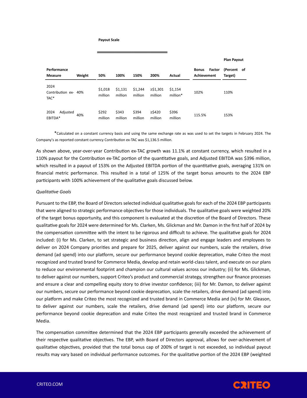 CRITEO.COM Payout Scale Performance Measure Weight 50% 100% 150% 200% Actual Bonus Factor Achievement Plan Payout (Percent of Target) 2024 Contribution ex- TAC* 40% $1,018 million $1,131 million $1,244 million ≥$1,301 million $1,154 million* 102% 110% 2024 Adjusted EBITDA* 40% $292 million $343 million $394 million ≥$420 million $396 million 115.5% 153% *Calculated on a constant currency basis and using the same exchange rate as was used to set the targets in February 2024. The Company's as reported constant currency Contribution ex-TAC was $1,136.5 million. As shown above, year-over-year Contribution ex-TAC growth was 11.1% at constant currency, which resulted in a 110% payout for the Contribution ex-TAC portion of the quantitative goals, and Adjusted EBITDA was $396 million, which resulted in a payout of 153% on the Adjusted EBITDA portion of the quantitative goals, averaging 131% on financial metric performance. This resulted in a total of 125% of the target bonus amounts to the 2024 EBP participants with 100% achievement of the qualitative goals discussed below. Qualitative Goals Pursuant to the EBP, the Board of Directors selected individual qualitative goals for each of the 2024 EBP participants that were aligned to strategic performance objectives for those individuals. The qualitative goals were weighted 20% of the target bonus opportunity, and this component is evaluated at the discretion of the Board of Directors. These qualitative goals for 2024 were determined for Ms. Clarken, Ms. Glickman and Mr. Damon in the first half of 2024 by the compensation committee with the intent to be rigorous and difficult to achieve. The qualitative goals for 2024 included: (i) for Ms. Clarken, to set strategic and business direction, align and engage leaders and employees to deliver on 2024 Company priorities and prepare for 2025, deliver against our numbers, scale the retailers, drive demand (ad spend) into our platform, secure our performance beyond cookie deprecation, make Criteo the most recognized and trusted brand for Commerce Media, develop and retain world-class talent, and execute on our plans to reduce our environmental footprint and champion our cultural values across our industry; (ii) for Ms. Glickman, to deliver against our numbers, support Criteo’s product and commercial strategy, strengthen our finance processes and ensure a clear and compelling equity story to drive investor confidence; (iii) for Mr. Damon, to deliver against our numbers, secure our performance beyond cookie deprecation, scale the retailers, drive demand (ad spend) into our platform and make Criteo the most recognized and trusted brand in Commerce Media and (iv) for Mr. Gleason, to deliver against our numbers, scale the retailers, drive demand (ad spend) into our platform, secure our performance beyond cookie deprecation and make Criteo the most recognized and trusted brand in Commerce Media. The compensation committee determined that the 2024 EBP participants generally exceeded the achievement of their respective qualitative objectives. The EBP, with Board of Directors approval, allows for over-achievement of qualitative objectives, provided that the total bonus cap of 200% of target is not exceeded, so individual payout results may vary based on individual performance outcomes. For the qualitative portion of the 2024 EBP (weighted