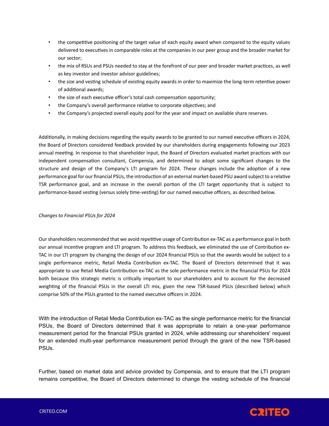 CRITEO.COM • the competitive positioning of the target value of each equity award when compared to the equity values delivered to executives in comparable roles at the companies in our peer group and the broader market for our sector; • the mix of RSUs and PSUs needed to stay at the forefront of our peer and broader market practices, as well as key investor and investor advisor guidelines; • the size and vesting schedule of existing equity awards in order to maximize the long-term retentive power of additional awards; • the size of each executive officer’s total cash compensation opportunity; • the Company’s overall performance relative to corporate objectives; and • the Company’s projected overall equity pool for the year and impact on available share reserves. Additionally, in making decisions regarding the equity awards to be granted to our named executive officers in 2024, the Board of Directors considered feedback provided by our shareholders during engagements following our 2023 annual meeting. In response to that shareholder input, the Board of Directors evaluated market practices with our independent compensation consultant, Compensia, and determined to adopt some significant changes to the structure and design of the Company's LTI program for 2024. These changes include the adoption of a new performance goal for our financial PSUs, the introduction of an external market-based PSU award subject to a relative TSR performance goal, and an increase in the overall portion of the LTI target opportunity that is subject to performance-based vesting (versus solely time-vesting) for our named executive officers, as described below. Changes to Financial PSUs for 2024 Our shareholders recommended that we avoid repetitive usage of Contribution ex-TAC as a performance goal in both our annual incentive program and LTI program. To address this feedback, we eliminated the use of Contribution ex- TAC in our LTI program by changing the design of our 2024 financial PSUs so that the awards would be subject to a single performance metric, Retail Media Contribution ex-TAC. The Board of Directors determined that it was appropriate to use Retail Media Contribution ex-TAC as the sole performance metric in the financial PSUs for 2024 both because this strategic metric is critically important to our shareholders and to account for the decreased weighting of the financial PSUs in the overall LTI mix, given the new TSR-based PSUs (described below) which comprise 50% of the PSUs granted to the named executive officers in 2024. With the introduction of Retail Media Contribution ex-TAC as the single performance metric for the financial PSUs, the Board of Directors determined that it was appropriate to retain a one-year performance measurement period for the financial PSUs granted in 2024, while addressing our shareholders' request for an extended multi-year performance measurement period through the grant of the new TSR-based PSUs. Further, based on market data and advice provided by Compensia, and to ensure that the LTI program remains competitive, the Board of Directors determined to change the vesting schedule of the financial
