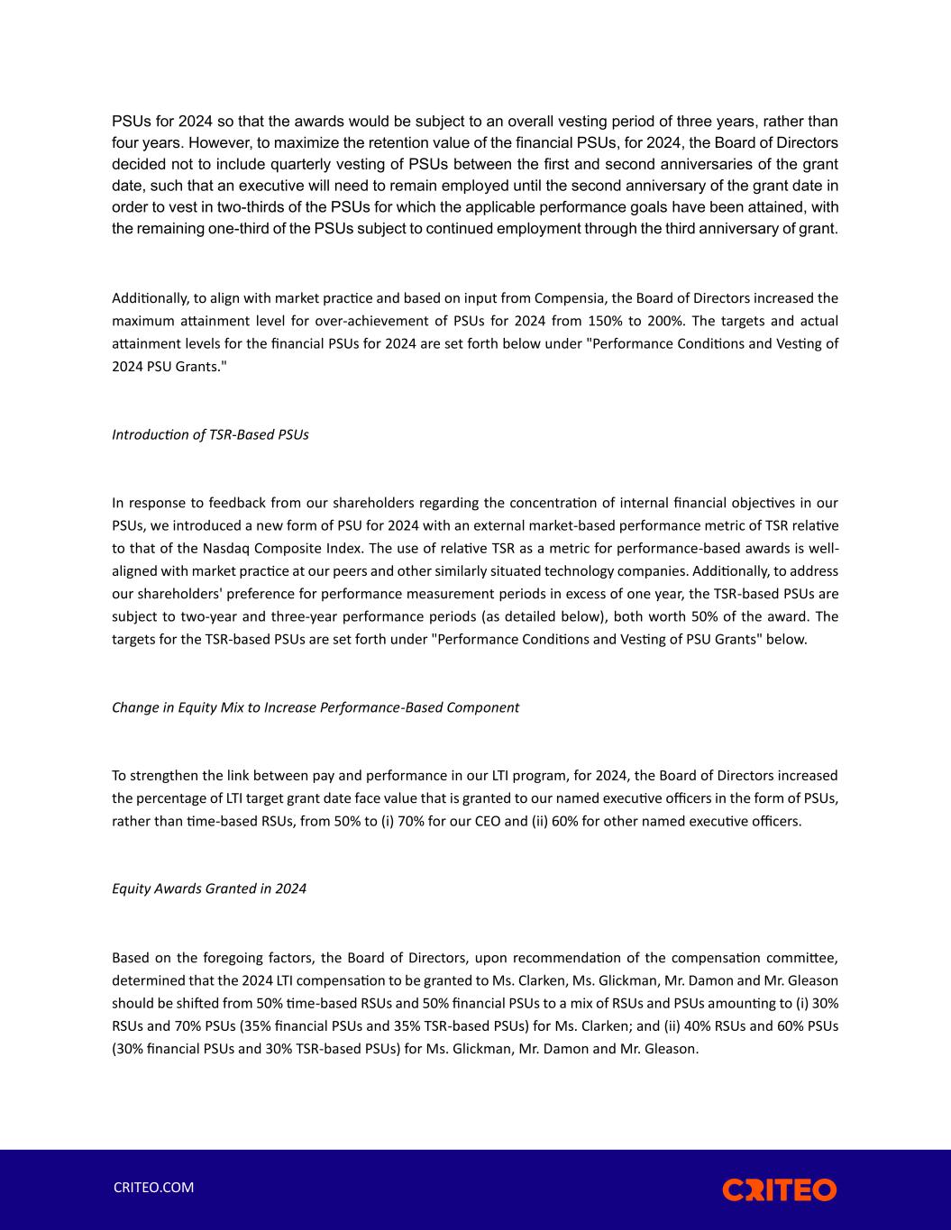 CRITEO.COM PSUs for 2024 so that the awards would be subject to an overall vesting period of three years, rather than four years. However, to maximize the retention value of the financial PSUs, for 2024, the Board of Directors decided not to include quarterly vesting of PSUs between the first and second anniversaries of the grant date, such that an executive will need to remain employed until the second anniversary of the grant date in order to vest in two-thirds of the PSUs for which the applicable performance goals have been attained, with the remaining one-third of the PSUs subject to continued employment through the third anniversary of grant. Additionally, to align with market practice and based on input from Compensia, the Board of Directors increased the maximum attainment level for over-achievement of PSUs for 2024 from 150% to 200%. The targets and actual attainment levels for the financial PSUs for 2024 are set forth below under "Performance Conditions and Vesting of 2024 PSU Grants." Introduction of TSR-Based PSUs In response to feedback from our shareholders regarding the concentration of internal financial objectives in our PSUs, we introduced a new form of PSU for 2024 with an external market-based performance metric of TSR relative to that of the Nasdaq Composite Index. The use of relative TSR as a metric for performance-based awards is well- aligned with market practice at our peers and other similarly situated technology companies. Additionally, to address our shareholders' preference for performance measurement periods in excess of one year, the TSR-based PSUs are subject to two-year and three-year performance periods (as detailed below), both worth 50% of the award. The targets for the TSR-based PSUs are set forth under "Performance Conditions and Vesting of PSU Grants" below. Change in Equity Mix to Increase Performance-Based Component To strengthen the link between pay and performance in our LTI program, for 2024, the Board of Directors increased the percentage of LTI target grant date face value that is granted to our named executive officers in the form of PSUs, rather than time-based RSUs, from 50% to (i) 70% for our CEO and (ii) 60% for other named executive officers. Equity Awards Granted in 2024 Based on the foregoing factors, the Board of Directors, upon recommendation of the compensation committee, determined that the 2024 LTI compensation to be granted to Ms. Clarken, Ms. Glickman, Mr. Damon and Mr. Gleason should be shifted from 50% time-based RSUs and 50% financial PSUs to a mix of RSUs and PSUs amounting to (i) 30% RSUs and 70% PSUs (35% financial PSUs and 35% TSR-based PSUs) for Ms. Clarken; and (ii) 40% RSUs and 60% PSUs (30% financial PSUs and 30% TSR-based PSUs) for Ms. Glickman, Mr. Damon and Mr. Gleason.