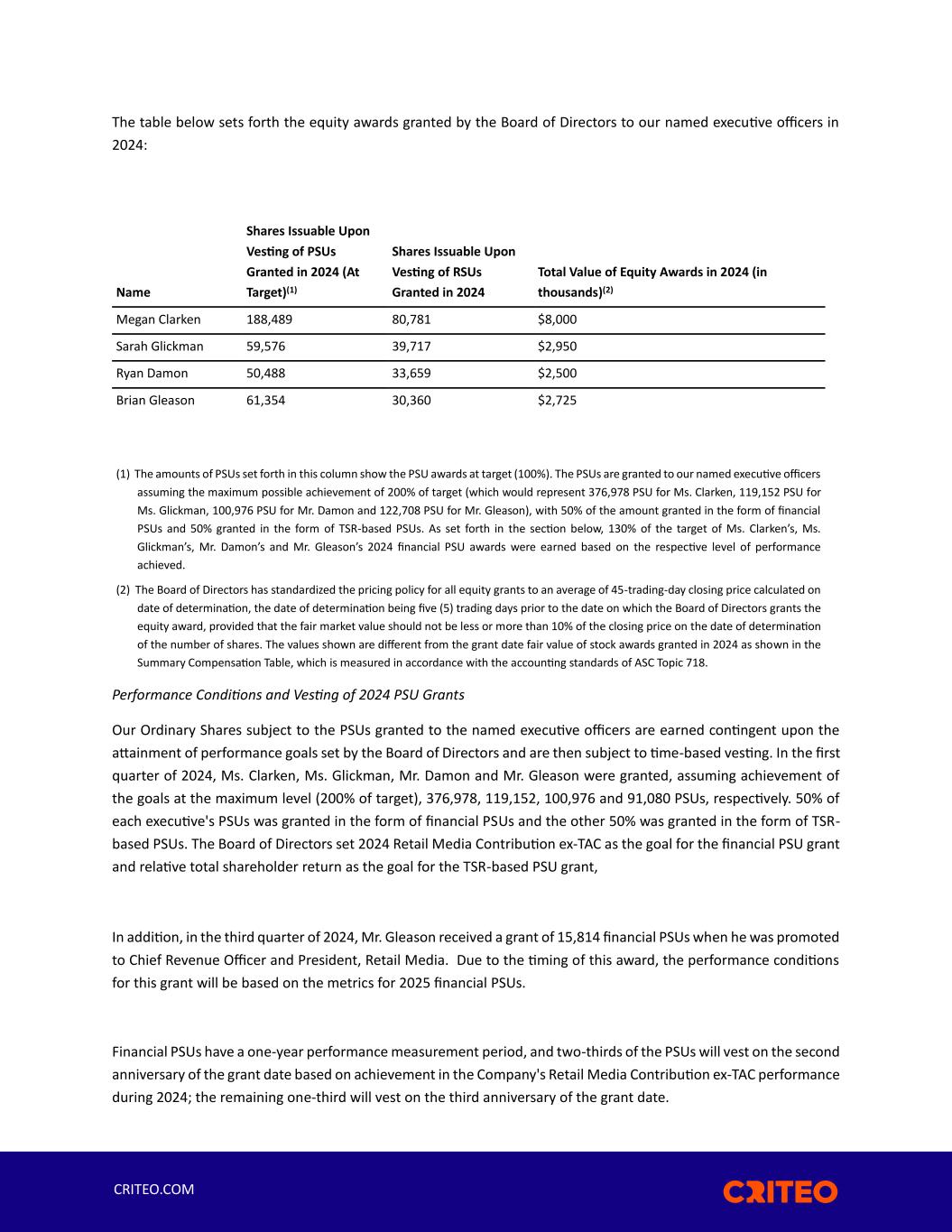 CRITEO.COM The table below sets forth the equity awards granted by the Board of Directors to our named executive officers in 2024: Name Shares Issuable Upon Vesting of PSUs Granted in 2024 (At Target)(1) Shares Issuable Upon Vesting of RSUs Granted in 2024 Total Value of Equity Awards in 2024 (in thousands)(2) Megan Clarken 188,489 80,781 $8,000 Sarah Glickman 59,576 39,717 $2,950 Ryan Damon 50,488 33,659 $2,500 Brian Gleason 61,354 30,360 $2,725 (1) The amounts of PSUs set forth in this column show the PSU awards at target (100%). The PSUs are granted to our named executive officers assuming the maximum possible achievement of 200% of target (which would represent 376,978 PSU for Ms. Clarken, 119,152 PSU for Ms. Glickman, 100,976 PSU for Mr. Damon and 122,708 PSU for Mr. Gleason), with 50% of the amount granted in the form of financial PSUs and 50% granted in the form of TSR-based PSUs. As set forth in the section below, 130% of the target of Ms. Clarken’s, Ms. Glickman’s, Mr. Damon’s and Mr. Gleason’s 2024 financial PSU awards were earned based on the respective level of performance achieved. (2) The Board of Directors has standardized the pricing policy for all equity grants to an average of 45-trading-day closing price calculated on date of determination, the date of determination being five (5) trading days prior to the date on which the Board of Directors grants the equity award, provided that the fair market value should not be less or more than 10% of the closing price on the date of determination of the number of shares. The values shown are different from the grant date fair value of stock awards granted in 2024 as shown in the Summary Compensation Table, which is measured in accordance with the accounting standards of ASC Topic 718. Performance Conditions and Vesting of 2024 PSU Grants Our Ordinary Shares subject to the PSUs granted to the named executive officers are earned contingent upon the attainment of performance goals set by the Board of Directors and are then subject to time-based vesting. In the first quarter of 2024, Ms. Clarken, Ms. Glickman, Mr. Damon and Mr. Gleason were granted, assuming achievement of the goals at the maximum level (200% of target), 376,978, 119,152, 100,976 and 91,080 PSUs, respectively. 50% of each executive's PSUs was granted in the form of financial PSUs and the other 50% was granted in the form of TSR- based PSUs. The Board of Directors set 2024 Retail Media Contribution ex-TAC as the goal for the financial PSU grant and relative total shareholder return as the goal for the TSR-based PSU grant, In addition, in the third quarter of 2024, Mr. Gleason received a grant of 15,814 financial PSUs when he was promoted to Chief Revenue Officer and President, Retail Media. Due to the timing of this award, the performance conditions for this grant will be based on the metrics for 2025 financial PSUs. Financial PSUs have a one-year performance measurement period, and two-thirds of the PSUs will vest on the second anniversary of the grant date based on achievement in the Company's Retail Media Contribution ex-TAC performance during 2024; the remaining one-third will vest on the third anniversary of the grant date.