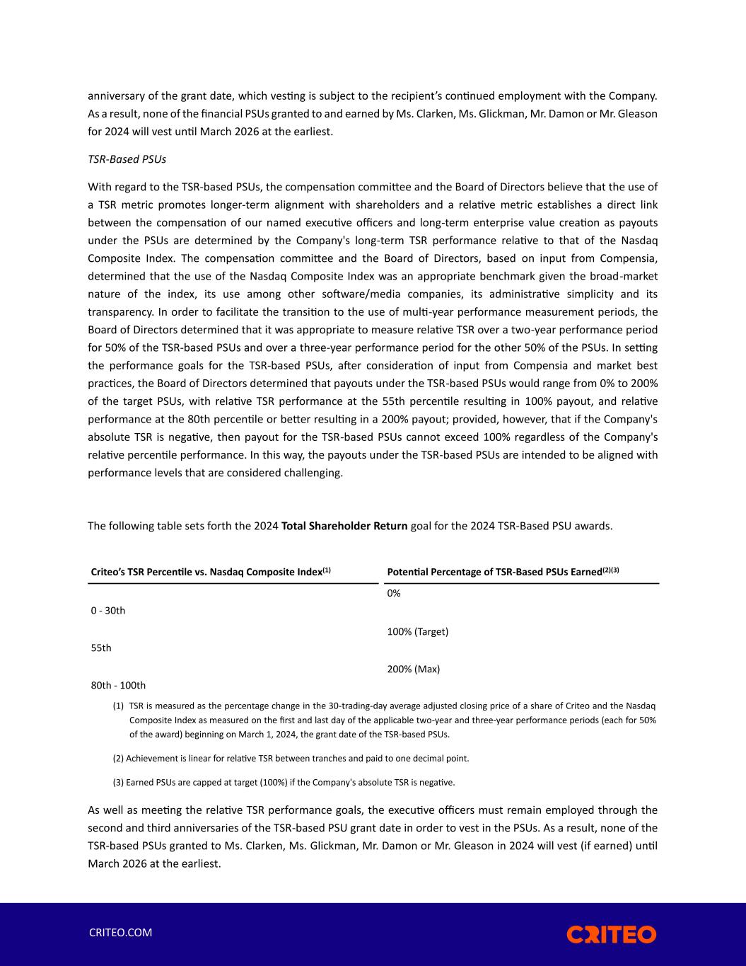 CRITEO.COM anniversary of the grant date, which vesting is subject to the recipient’s continued employment with the Company. As a result, none of the financial PSUs granted to and earned by Ms. Clarken, Ms. Glickman, Mr. Damon or Mr. Gleason for 2024 will vest until March 2026 at the earliest. TSR-Based PSUs With regard to the TSR-based PSUs, the compensation committee and the Board of Directors believe that the use of a TSR metric promotes longer-term alignment with shareholders and a relative metric establishes a direct link between the compensation of our named executive officers and long-term enterprise value creation as payouts under the PSUs are determined by the Company's long-term TSR performance relative to that of the Nasdaq Composite Index. The compensation committee and the Board of Directors, based on input from Compensia, determined that the use of the Nasdaq Composite Index was an appropriate benchmark given the broad-market nature of the index, its use among other software/media companies, its administrative simplicity and its transparency. In order to facilitate the transition to the use of multi-year performance measurement periods, the Board of Directors determined that it was appropriate to measure relative TSR over a two-year performance period for 50% of the TSR-based PSUs and over a three-year performance period for the other 50% of the PSUs. In setting the performance goals for the TSR-based PSUs, after consideration of input from Compensia and market best practices, the Board of Directors determined that payouts under the TSR-based PSUs would range from 0% to 200% of the target PSUs, with relative TSR performance at the 55th percentile resulting in 100% payout, and relative performance at the 80th percentile or better resulting in a 200% payout; provided, however, that if the Company's absolute TSR is negative, then payout for the TSR-based PSUs cannot exceed 100% regardless of the Company's relative percentile performance. In this way, the payouts under the TSR-based PSUs are intended to be aligned with performance levels that are considered challenging. The following table sets forth the 2024 Total Shareholder Return goal for the 2024 TSR-Based PSU awards. Criteo’s TSR Percentile vs. Nasdaq Composite Index(1) Potential Percentage of TSR-Based PSUs Earned(2)(3) 0 - 30th 0% 55th 100% (Target) 80th - 100th 200% (Max) (1) TSR is measured as the percentage change in the 30-trading-day average adjusted closing price of a share of Criteo and the Nasdaq Composite Index as measured on the first and last day of the applicable two-year and three-year performance periods (each for 50% of the award) beginning on March 1, 2024, the grant date of the TSR-based PSUs. (2) Achievement is linear for relative TSR between tranches and paid to one decimal point. (3) Earned PSUs are capped at target (100%) if the Company's absolute TSR is negative. As well as meeting the relative TSR performance goals, the executive officers must remain employed through the second and third anniversaries of the TSR-based PSU grant date in order to vest in the PSUs. As a result, none of the TSR-based PSUs granted to Ms. Clarken, Ms. Glickman, Mr. Damon or Mr. Gleason in 2024 will vest (if earned) until March 2026 at the earliest.