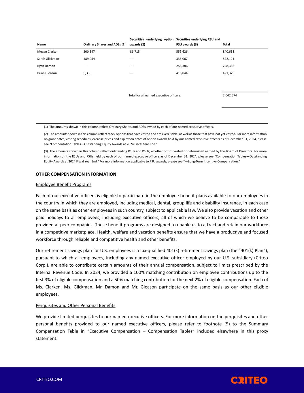 CRITEO.COM Name Ordinary Shares and ADSs (1) Securities underlying option awards (2) Securities underlying RSU and PSU awards (3) Total Megan Clarken 200,347 86,715 553,626 840,688 Sarah Glickman 189,054 — 333,067 522,121 Ryan Damon — — 258,386 258,386 Brian Gleason 5,335 — 416,044 421,379 Total for all named executive officers: 2,042,574 (1) The amounts shown in this column reflect Ordinary Shares and ADSs owned by each of our named executive officers. (2) The amounts shown in this column reflect stock options that have vested and are exercisable, as well as those that have not yet vested. For more information on grant dates, vesting schedules, exercise prices and expiration dates of option awards held by our named executive officers as of December 31, 2024, please see “Compensation Tables—Outstanding Equity Awards at 2024 Fiscal Year End.” (3) The amounts shown in this column reflect outstanding RSUs and PSUs, whether or not vested or determined earned by the Board of Directors. For more information on the RSUs and PSUs held by each of our named executive officers as of December 31, 2024, please see “Compensation Tables—Outstanding Equity Awards at 2024 Fiscal Year End.” For more information applicable to PSU awards, please see “—Long-Term Incentive Compensation.” OTHER COMPENSATION INFORMATION Employee Benefit Programs Each of our executive officers is eligible to participate in the employee benefit plans available to our employees in the country in which they are employed, including medical, dental, group life and disability insurance, in each case on the same basis as other employees in such country, subject to applicable law. We also provide vacation and other paid holidays to all employees, including executive officers, all of which we believe to be comparable to those provided at peer companies. These benefit programs are designed to enable us to attract and retain our workforce in a competitive marketplace. Health, welfare and vacation benefits ensure that we have a productive and focused workforce through reliable and competitive health and other benefits. Our retirement savings plan for U.S. employees is a tax-qualified 401(k) retirement savings plan (the “401(k) Plan”), pursuant to which all employees, including any named executive officer employed by our U.S. subsidiary (Criteo Corp.), are able to contribute certain amounts of their annual compensation, subject to limits prescribed by the Internal Revenue Code. In 2024, we provided a 100% matching contribution on employee contributions up to the first 3% of eligible compensation and a 50% matching contribution for the next 2% of eligible compensation. Each of Ms. Clarken, Ms. Glickman, Mr. Damon and Mr. Gleason participate on the same basis as our other eligible employees. Perquisites and Other Personal Benefits We provide limited perquisites to our named executive officers. For more information on the perquisites and other personal benefits provided to our named executive officers, please refer to footnote (5) to the Summary Compensation Table in “Executive Compensation – Compensation Tables” included elsewhere in this proxy statement.