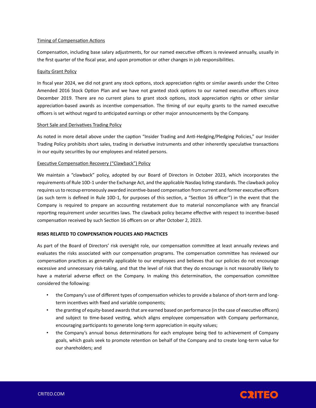 CRITEO.COM Timing of Compensation Actions Compensation, including base salary adjustments, for our named executive officers is reviewed annually, usually in the first quarter of the fiscal year, and upon promotion or other changes in job responsibilities. Equity Grant Policy In fiscal year 2024, we did not grant any stock options, stock appreciation rights or similar awards under the Criteo Amended 2016 Stock Option Plan and we have not granted stock options to our named executive officers since December 2019. There are no current plans to grant stock options, stock appreciation rights or other similar appreciation-based awards as incentive compensation. The timing of our equity grants to the named executive officers is set without regard to anticipated earnings or other major announcements by the Company. Short Sale and Derivatives Trading Policy As noted in more detail above under the caption “Insider Trading and Anti-Hedging/Pledging Policies,” our Insider Trading Policy prohibits short sales, trading in derivative instruments and other inherently speculative transactions in our equity securities by our employees and related persons. Executive Compensation Recovery (“Clawback”) Policy We maintain a “clawback” policy, adopted by our Board of Directors in October 2023, which incorporates the requirements of Rule 10D-1 under the Exchange Act, and the applicable Nasdaq listing standards. The clawback policy requires us to recoup erroneously awarded incentive-based compensation from current and former executive officers (as such term is defined in Rule 10D-1, for purposes of this section, a “Section 16 officer”) in the event that the Company is required to prepare an accounting restatement due to material noncompliance with any financial reporting requirement under securities laws. The clawback policy became effective with respect to incentive-based compensation received by such Section 16 officers on or after October 2, 2023. RISKS RELATED TO COMPENSATION POLICIES AND PRACTICES As part of the Board of Directors’ risk oversight role, our compensation committee at least annually reviews and evaluates the risks associated with our compensation programs. The compensation committee has reviewed our compensation practices as generally applicable to our employees and believes that our policies do not encourage excessive and unnecessary risk-taking, and that the level of risk that they do encourage is not reasonably likely to have a material adverse effect on the Company. In making this determination, the compensation committee considered the following: • the Company’s use of different types of compensation vehicles to provide a balance of short-term and long- term incentives with fixed and variable components; • the granting of equity-based awards that are earned based on performance (in the case of executive officers) and subject to time-based vesting, which aligns employee compensation with Company performance, encouraging participants to generate long-term appreciation in equity values; • the Company’s annual bonus determinations for each employee being tied to achievement of Company goals, which goals seek to promote retention on behalf of the Company and to create long-term value for our shareholders; and
