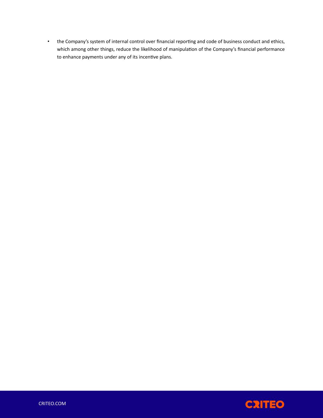 CRITEO.COM • the Company’s system of internal control over financial reporting and code of business conduct and ethics, which among other things, reduce the likelihood of manipulation of the Company’s financial performance to enhance payments under any of its incentive plans.