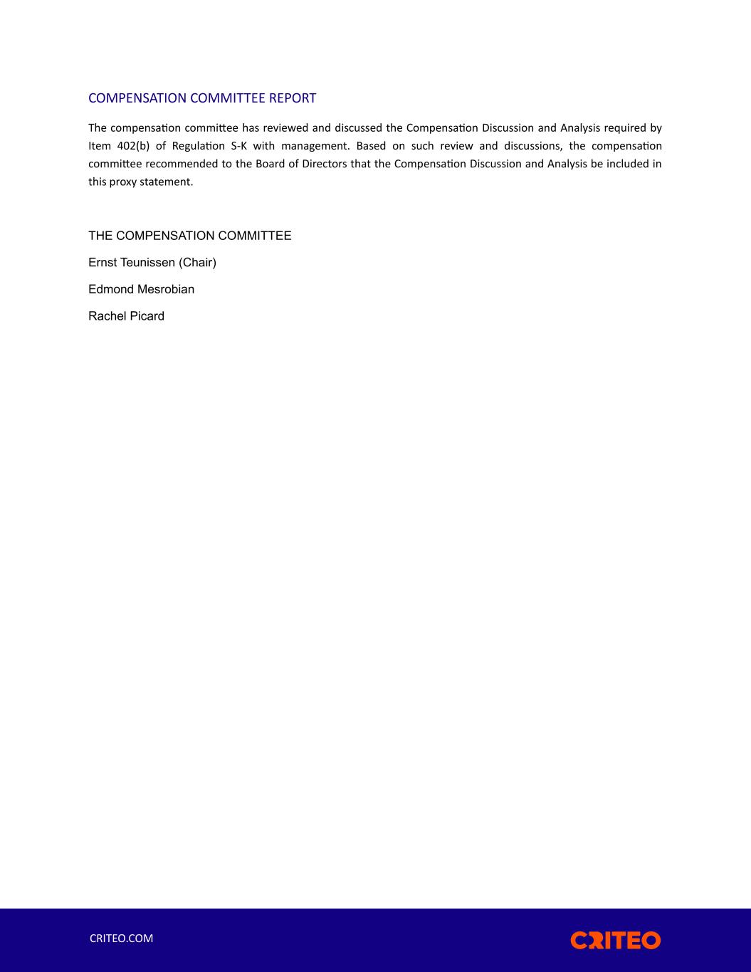 CRITEO.COM COMPENSATION COMMITTEE REPORT The compensation committee has reviewed and discussed the Compensation Discussion and Analysis required by Item 402(b) of Regulation S-K with management. Based on such review and discussions, the compensation committee recommended to the Board of Directors that the Compensation Discussion and Analysis be included in this proxy statement. THE COMPENSATION COMMITTEE Ernst Teunissen (Chair) Edmond Mesrobian Rachel Picard