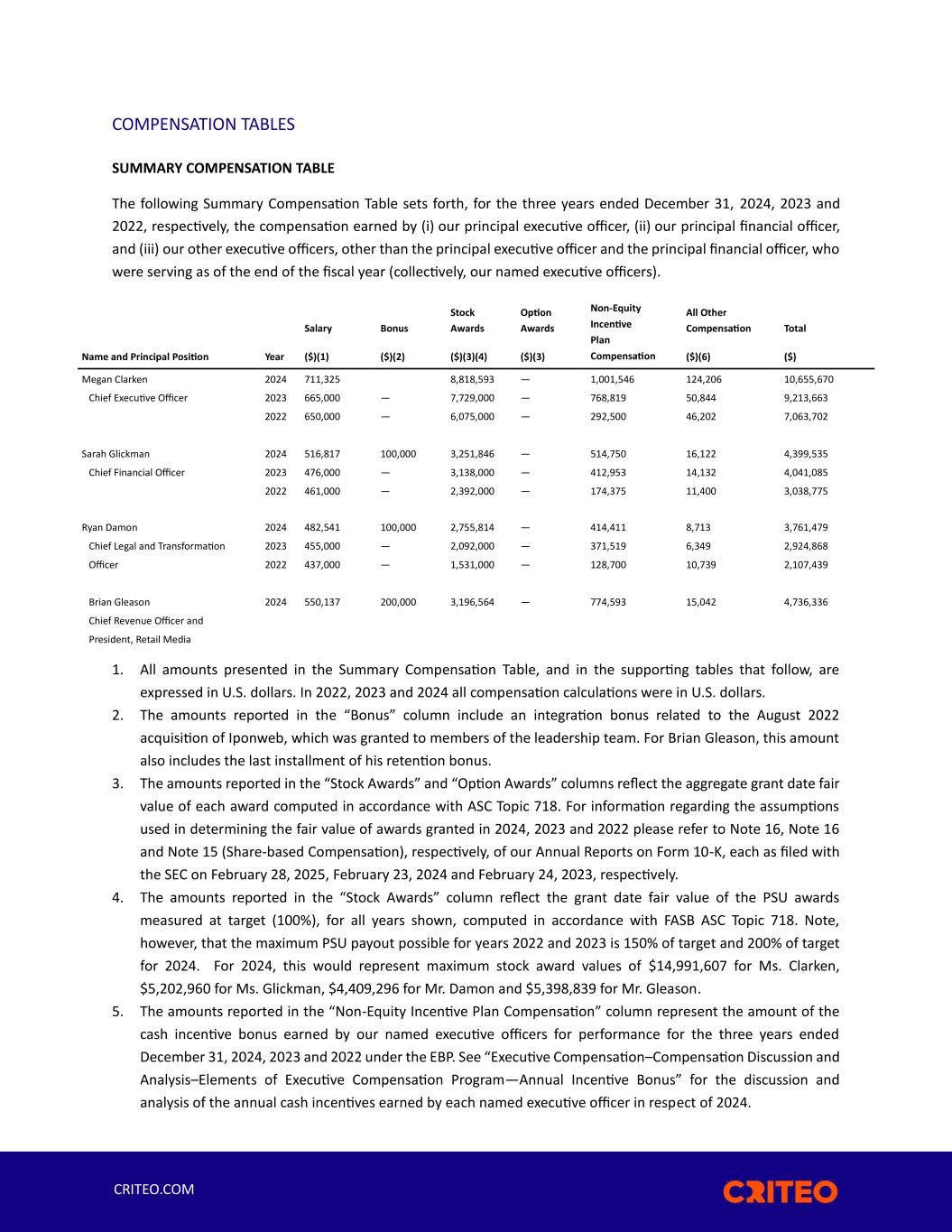 CRITEO.COM COMPENSATION TABLES SUMMARY COMPENSATION TABLE The following Summary Compensation Table sets forth, for the three years ended December 31, 2024, 2023 and 2022, respectively, the compensation earned by (i) our principal executive officer, (ii) our principal financial officer, and (iii) our other executive officers, other than the principal executive officer and the principal financial officer, who were serving as of the end of the fiscal year (collectively, our named executive officers). Name and Principal Position Year Salary ($)(1) Bonus ($)(2) Stock Awards ($)(3)(4) Option Awards ($)(3) Non-Equity Incentive Plan Compensation ($)(5) All Other Compensation ($)(6) Total ($) Megan Clarken 2024 711,325 8,818,593 — 1,001,546 124,206 10,655,670 Chief Executive Officer 2023 665,000 — 7,729,000 — 768,819 50,844 9,213,663 2022 650,000 — 6,075,000 — 292,500 46,202 7,063,702 Sarah Glickman 2024 516,817 100,000 3,251,846 — 514,750 16,122 4,399,535 Chief Financial Officer 2023 476,000 — 3,138,000 — 412,953 14,132 4,041,085 2022 461,000 — 2,392,000 — 174,375 11,400 3,038,775 Ryan Damon 2024 482,541 100,000 2,755,814 — 414,411 8,713 3,761,479 Chief Legal and Transformation 2023 455,000 — 2,092,000 — 371,519 6,349 2,924,868 Officer 2022 437,000 — 1,531,000 — 128,700 10,739 2,107,439 Brian Gleason 2024 550,137 200,000 3,196,564 — 774,593 15,042 4,736,336 Chief Revenue Officer and President, Retail Media 1. All amounts presented in the Summary Compensation Table, and in the supporting tables that follow, are expressed in U.S. dollars. In 2022, 2023 and 2024 all compensation calculations were in U.S. dollars. 2. The amounts reported in the “Bonus” column include an integration bonus related to the August 2022 acquisition of Iponweb, which was granted to members of the leadership team. For Brian Gleason, this amount also includes the last installment of his retention bonus. 3. The amounts reported in the “Stock Awards” and “Option Awards” columns reflect the aggregate grant date fair value of each award computed in accordance with ASC Topic 718. For information regarding the assumptions used in determining the fair value of awards granted in 2024, 2023 and 2022 please refer to Note 16, Note 16 and Note 15 (Share-based Compensation), respectively, of our Annual Reports on Form 10-K, each as filed with the SEC on February 28, 2025, February 23, 2024 and February 24, 2023, respectively. 4. The amounts reported in the “Stock Awards” column reflect the grant date fair value of the PSU awards measured at target (100%), for all years shown, computed in accordance with FASB ASC Topic 718. Note, however, that the maximum PSU payout possible for years 2022 and 2023 is 150% of target and 200% of target for 2024. For 2024, this would represent maximum stock award values of $14,991,607 for Ms. Clarken, $5,202,960 for Ms. Glickman, $4,409,296 for Mr. Damon and $5,398,839 for Mr. Gleason. 5. The amounts reported in the “Non-Equity Incentive Plan Compensation” column represent the amount of the cash incentive bonus earned by our named executive officers for performance for the three years ended December 31, 2024, 2023 and 2022 under the EBP. See “Executive Compensation–Compensation Discussion and Analysis–Elements of Executive Compensation Program—Annual Incentive Bonus” for the discussion and analysis of the annual cash incentives earned by each named executive officer in respect of 2024.
