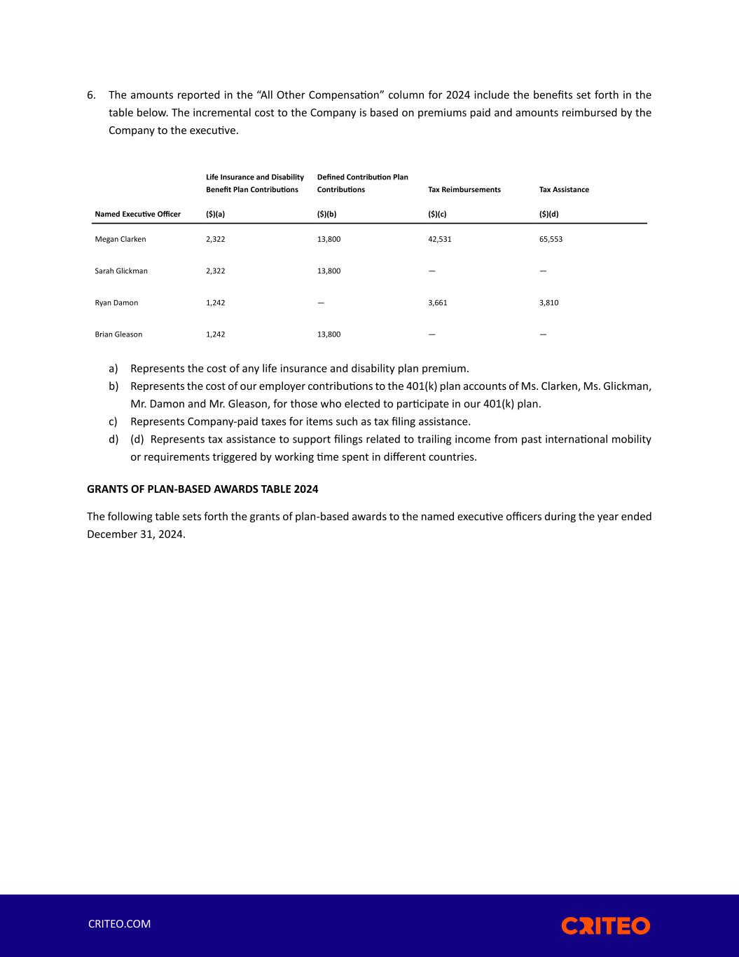 CRITEO.COM 6. The amounts reported in the “All Other Compensation” column for 2024 include the benefits set forth in the table below. The incremental cost to the Company is based on premiums paid and amounts reimbursed by the Company to the executive. Named Executive Officer Life Insurance and Disability Benefit Plan Contributions ($)(a) Defined Contribution Plan Contributions ($)(b) Tax Reimbursements ($)(c) Tax Assistance ($)(d) Megan Clarken 2,322 13,800 42,531 65,553 Sarah Glickman 2,322 13,800 — — Ryan Damon 1,242 — 3,661 3,810 Brian Gleason 1,242 13,800 — — a) Represents the cost of any life insurance and disability plan premium. b) Represents the cost of our employer contributions to the 401(k) plan accounts of Ms. Clarken, Ms. Glickman, Mr. Damon and Mr. Gleason, for those who elected to participate in our 401(k) plan. c) Represents Company-paid taxes for items such as tax filing assistance. d) (d) Represents tax assistance to support filings related to trailing income from past international mobility or requirements triggered by working time spent in different countries. GRANTS OF PLAN-BASED AWARDS TABLE 2024 The following table sets forth the grants of plan-based awards to the named executive officers during the year ended December 31, 2024.