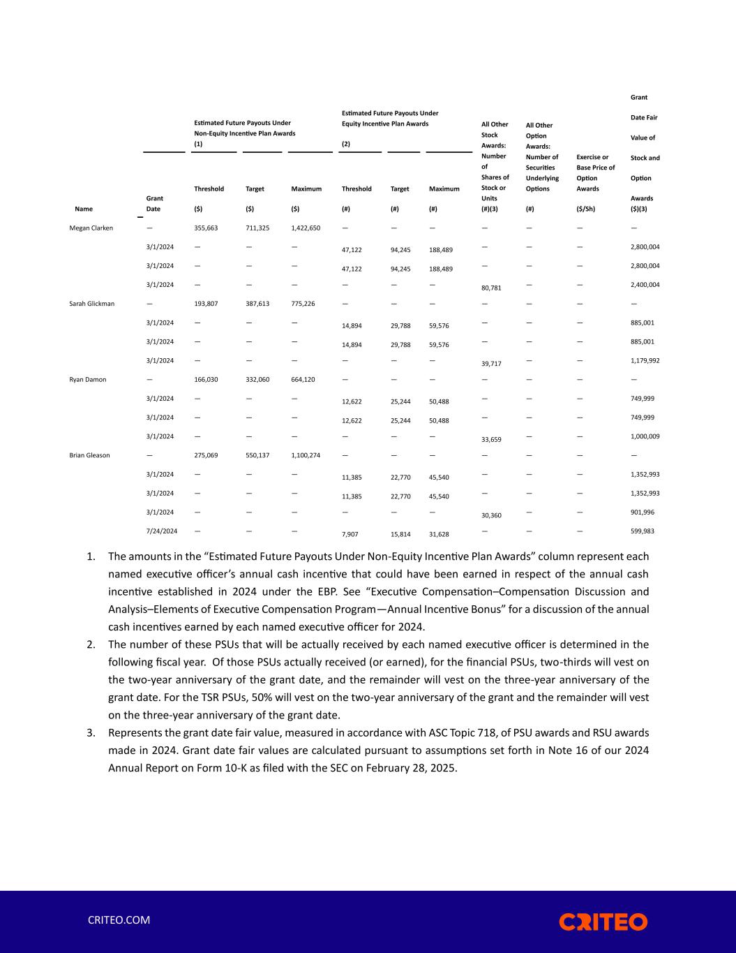 CRITEO.COM Name Estimated Future Payouts Under Non-Equity Incentive Plan Awards (1) Estimated Future Payouts Under Equity Incentive Plan Awards (2) All Other Stock Awards: Number of Shares of Stock or Units (#)(3) All Other Option Awards: Number of Securities Underlying Options (#) Exercise or Base Price of Option Awards ($/Sh) Grant Date Fair Value of Stock and Option Awards ($)(3) Grant Date Threshold ($) Target ($) Maximum ($) Threshold (#) Target (#) Maximum (#) Megan Clarken — 355,663 711,325 1,422,650 — — — — — — — 3/1/2024 — — — 47,122 94,245 188,489 — — — 2,800,004 3/1/2024 — — — 47,122 94,245 188,489 — — — 2,800,004 3/1/2024 — — — — — — 80,781 — — 2,400,004 Sarah Glickman — 193,807 387,613 775,226 — — — — — — — 3/1/2024 — — — 14,894 29,788 59,576 — — — 885,001 3/1/2024 — — — 14,894 29,788 59,576 — — — 885,001 3/1/2024 — — — — — — 39,717 — — 1,179,992 Ryan Damon — 166,030 332,060 664,120 — — — — — — — 3/1/2024 — — — 12,622 25,244 50,488 — — — 749,999 3/1/2024 — — — 12,622 25,244 50,488 — — — 749,999 3/1/2024 — — — — — — 33,659 — — 1,000,009 Brian Gleason — 275,069 550,137 1,100,274 — — — — — — — 3/1/2024 — — — 11,385 22,770 45,540 — — — 1,352,993 3/1/2024 — — — 11,385 22,770 45,540 — — — 1,352,993 3/1/2024 — — — — — — 30,360 — — 901,996 7/24/2024 — — — 7,907 15,814 31,628 — — — 599,983 1. The amounts in the “Estimated Future Payouts Under Non-Equity Incentive Plan Awards” column represent each named executive officer’s annual cash incentive that could have been earned in respect of the annual cash incentive established in 2024 under the EBP. See “Executive Compensation–Compensation Discussion and Analysis–Elements of Executive Compensation Program—Annual Incentive Bonus” for a discussion of the annual cash incentives earned by each named executive officer for 2024. 2. The number of these PSUs that will be actually received by each named executive officer is determined in the following fiscal year. Of those PSUs actually received (or earned), for the financial PSUs, two-thirds will vest on the two-year anniversary of the grant date, and the remainder will vest on the three-year anniversary of the grant date. For the TSR PSUs, 50% will vest on the two-year anniversary of the grant and the remainder will vest on the three-year anniversary of the grant date. 3. Represents the grant date fair value, measured in accordance with ASC Topic 718, of PSU awards and RSU awards made in 2024. Grant date fair values are calculated pursuant to assumptions set forth in Note 16 of our 2024 Annual Report on Form 10-K as filed with the SEC on February 28, 2025.
