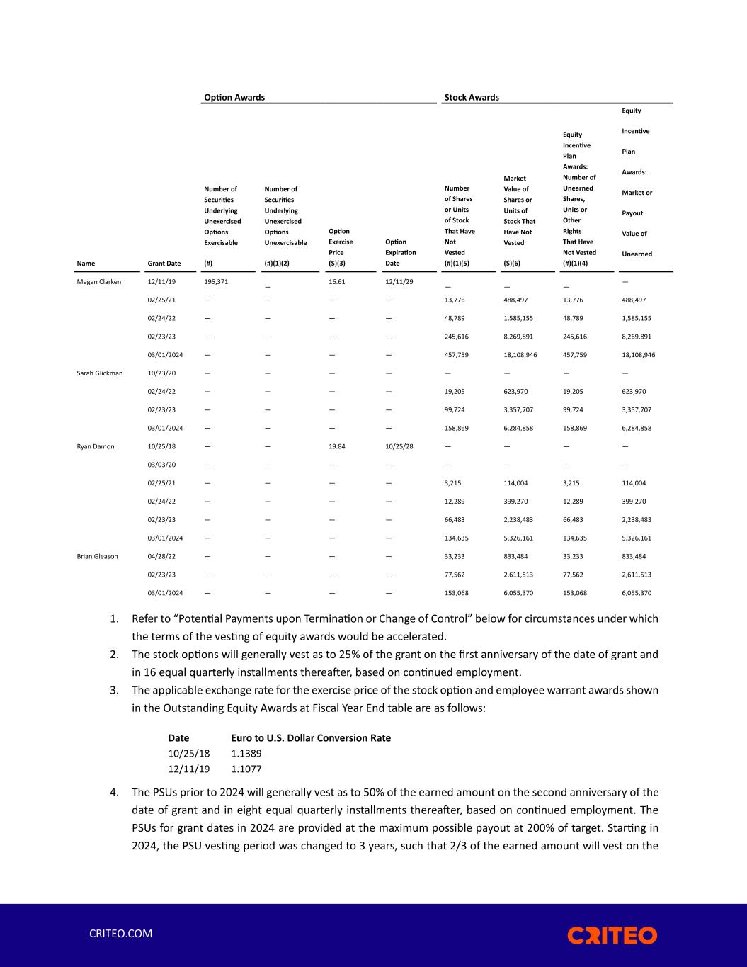 CRITEO.COM Option Awards Stock Awards Name Grant Date Number of Securities Underlying Unexercised Options Exercisable (#) Number of Securities Underlying Unexercised Options Unexercisable (#)(1)(2) Option Exercise Price ($)(3) Option Expiration Date Number of Shares or Units of Stock That Have Not Vested (#)(1)(5) Market Value of Shares or Units of Stock That Have Not Vested ($)(6) Equity Incentive Plan Awards: Number of Unearned Shares, Units or Other Rights That Have Not Vested (#)(1)(4) Equity Incentive Plan Awards: Market or Payout Value of Unearned Shares, Units or Other Rights That Have Not Vested ($)(6) Megan Clarken 12/11/19 195,371 — 16.61 12/11/29 — — — — 02/25/21 — — — — 13,776 488,497 13,776 488,497 02/24/22 — — — — 48,789 1,585,155 48,789 1,585,155 02/23/23 — — — — 245,616 8,269,891 245,616 8,269,891 03/01/2024 — — — — 457,759 18,108,946 457,759 18,108,946 Sarah Glickman 10/23/20 — — — — — — — — 02/24/22 — — — — 19,205 623,970 19,205 623,970 02/23/23 — — — — 99,724 3,357,707 99,724 3,357,707 03/01/2024 — — — — 158,869 6,284,858 158,869 6,284,858 Ryan Damon 10/25/18 — — 19.84 10/25/28 — — — — 03/03/20 — — — — — — — — 02/25/21 — — — — 3,215 114,004 3,215 114,004 02/24/22 — — — — 12,289 399,270 12,289 399,270 02/23/23 — — — — 66,483 2,238,483 66,483 2,238,483 03/01/2024 — — — — 134,635 5,326,161 134,635 5,326,161 Brian Gleason 04/28/22 — — — — 33,233 833,484 33,233 833,484 02/23/23 — — — — 77,562 2,611,513 77,562 2,611,513 03/01/2024 — — — — 153,068 6,055,370 153,068 6,055,370 1. Refer to “Potential Payments upon Termination or Change of Control” below for circumstances under which the terms of the vesting of equity awards would be accelerated. 2. The stock options will generally vest as to 25% of the grant on the first anniversary of the date of grant and in 16 equal quarterly installments thereafter, based on continued employment. 3. The applicable exchange rate for the exercise price of the stock option and employee warrant awards shown in the Outstanding Equity Awards at Fiscal Year End table are as follows: Date Euro to U.S. Dollar Conversion Rate 10/25/18 1.1389 12/11/19 1.1077 4. The PSUs prior to 2024 will generally vest as to 50% of the earned amount on the second anniversary of the date of grant and in eight equal quarterly installments thereafter, based on continued employment. The PSUs for grant dates in 2024 are provided at the maximum possible payout at 200% of target. Starting in 2024, the PSU vesting period was changed to 3 years, such that 2/3 of the earned amount will vest on the