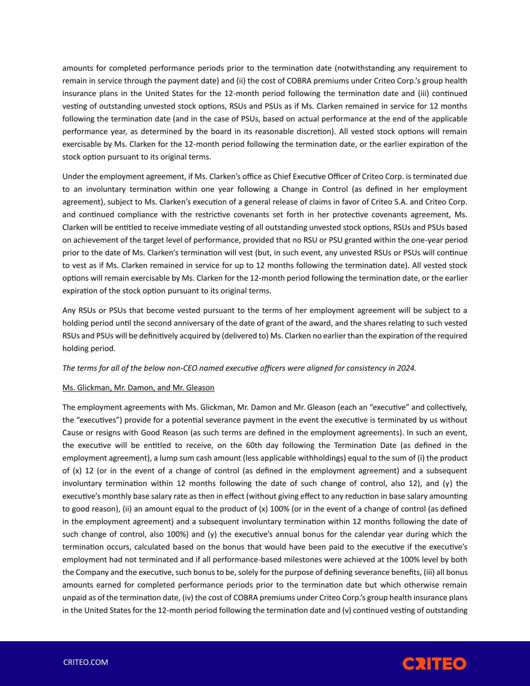 CRITEO.COM amounts for completed performance periods prior to the termination date (notwithstanding any requirement to remain in service through the payment date) and (ii) the cost of COBRA premiums under Criteo Corp.’s group health insurance plans in the United States for the 12-month period following the termination date and (iii) continued vesting of outstanding unvested stock options, RSUs and PSUs as if Ms. Clarken remained in service for 12 months following the termination date (and in the case of PSUs, based on actual performance at the end of the applicable performance year, as determined by the board in its reasonable discretion). All vested stock options will remain exercisable by Ms. Clarken for the 12-month period following the termination date, or the earlier expiration of the stock option pursuant to its original terms. Under the employment agreement, if Ms. Clarken’s office as Chief Executive Officer of Criteo Corp. is terminated due to an involuntary termination within one year following a Change in Control (as defined in her employment agreement), subject to Ms. Clarken’s execution of a general release of claims in favor of Criteo S.A. and Criteo Corp. and continued compliance with the restrictive covenants set forth in her protective covenants agreement, Ms. Clarken will be entitled to receive immediate vesting of all outstanding unvested stock options, RSUs and PSUs based on achievement of the target level of performance, provided that no RSU or PSU granted within the one-year period prior to the date of Ms. Clarken’s termination will vest (but, in such event, any unvested RSUs or PSUs will continue to vest as if Ms. Clarken remained in service for up to 12 months following the termination date). All vested stock options will remain exercisable by Ms. Clarken for the 12-month period following the termination date, or the earlier expiration of the stock option pursuant to its original terms. Any RSUs or PSUs that become vested pursuant to the terms of her employment agreement will be subject to a holding period until the second anniversary of the date of grant of the award, and the shares relating to such vested RSUs and PSUs will be definitively acquired by (delivered to) Ms. Clarken no earlier than the expiration of the required holding period. The terms for all of the below non-CEO named executive officers were aligned for consistency in 2024. Ms. Glickman, Mr. Damon, and Mr. Gleason The employment agreements with Ms. Glickman, Mr. Damon and Mr. Gleason (each an “executive” and collectively, the “executives”) provide for a potential severance payment in the event the executive is terminated by us without Cause or resigns with Good Reason (as such terms are defined in the employment agreements). In such an event, the executive will be entitled to receive, on the 60th day following the Termination Date (as defined in the employment agreement), a lump sum cash amount (less applicable withholdings) equal to the sum of (i) the product of (x) 12 (or in the event of a change of control (as defined in the employment agreement) and a subsequent involuntary termination within 12 months following the date of such change of control, also 12), and (y) the executive’s monthly base salary rate as then in effect (without giving effect to any reduction in base salary amounting to good reason), (ii) an amount equal to the product of (x) 100% (or in the event of a change of control (as defined in the employment agreement) and a subsequent involuntary termination within 12 months following the date of such change of control, also 100%) and (y) the executive’s annual bonus for the calendar year during which the termination occurs, calculated based on the bonus that would have been paid to the executive if the executive’s employment had not terminated and if all performance-based milestones were achieved at the 100% level by both the Company and the executive, such bonus to be, solely for the purpose of defining severance benefits, (iii) all bonus amounts earned for completed performance periods prior to the termination date but which otherwise remain unpaid as of the termination date, (iv) the cost of COBRA premiums under Criteo Corp.’s group health insurance plans in the United States for the 12-month period following the termination date and (v) continued vesting of outstanding