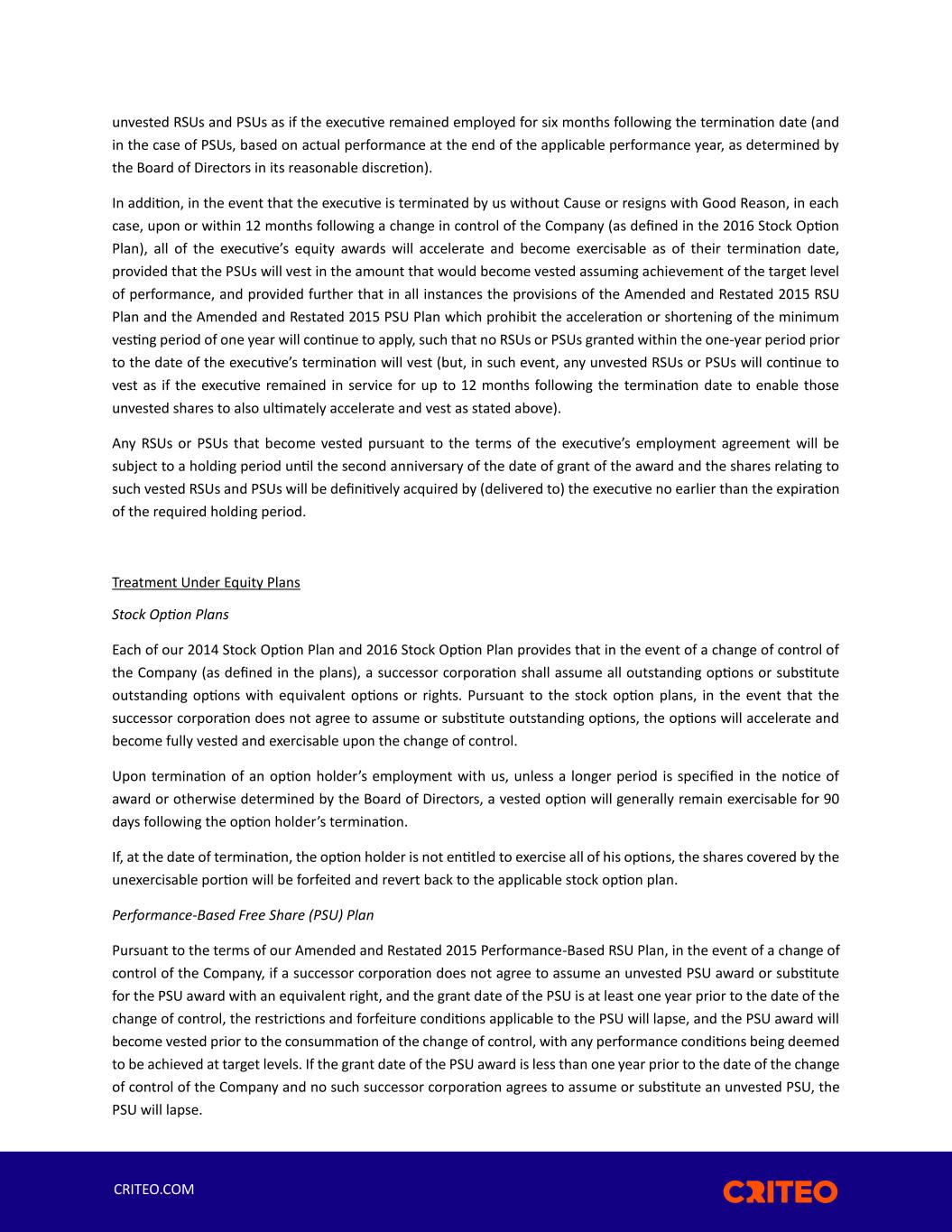 CRITEO.COM unvested RSUs and PSUs as if the executive remained employed for six months following the termination date (and in the case of PSUs, based on actual performance at the end of the applicable performance year, as determined by the Board of Directors in its reasonable discretion). In addition, in the event that the executive is terminated by us without Cause or resigns with Good Reason, in each case, upon or within 12 months following a change in control of the Company (as defined in the 2016 Stock Option Plan), all of the executive’s equity awards will accelerate and become exercisable as of their termination date, provided that the PSUs will vest in the amount that would become vested assuming achievement of the target level of performance, and provided further that in all instances the provisions of the Amended and Restated 2015 RSU Plan and the Amended and Restated 2015 PSU Plan which prohibit the acceleration or shortening of the minimum vesting period of one year will continue to apply, such that no RSUs or PSUs granted within the one-year period prior to the date of the executive’s termination will vest (but, in such event, any unvested RSUs or PSUs will continue to vest as if the executive remained in service for up to 12 months following the termination date to enable those unvested shares to also ultimately accelerate and vest as stated above). Any RSUs or PSUs that become vested pursuant to the terms of the executive’s employment agreement will be subject to a holding period until the second anniversary of the date of grant of the award and the shares relating to such vested RSUs and PSUs will be definitively acquired by (delivered to) the executive no earlier than the expiration of the required holding period. Treatment Under Equity Plans Stock Option Plans Each of our 2014 Stock Option Plan and 2016 Stock Option Plan provides that in the event of a change of control of the Company (as defined in the plans), a successor corporation shall assume all outstanding options or substitute outstanding options with equivalent options or rights. Pursuant to the stock option plans, in the event that the successor corporation does not agree to assume or substitute outstanding options, the options will accelerate and become fully vested and exercisable upon the change of control. Upon termination of an option holder’s employment with us, unless a longer period is specified in the notice of award or otherwise determined by the Board of Directors, a vested option will generally remain exercisable for 90 days following the option holder’s termination. If, at the date of termination, the option holder is not entitled to exercise all of his options, the shares covered by the unexercisable portion will be forfeited and revert back to the applicable stock option plan. Performance-Based Free Share (PSU) Plan Pursuant to the terms of our Amended and Restated 2015 Performance-Based RSU Plan, in the event of a change of control of the Company, if a successor corporation does not agree to assume an unvested PSU award or substitute for the PSU award with an equivalent right, and the grant date of the PSU is at least one year prior to the date of the change of control, the restrictions and forfeiture conditions applicable to the PSU will lapse, and the PSU award will become vested prior to the consummation of the change of control, with any performance conditions being deemed to be achieved at target levels. If the grant date of the PSU award is less than one year prior to the date of the change of control of the Company and no such successor corporation agrees to assume or substitute an unvested PSU, the PSU will lapse.