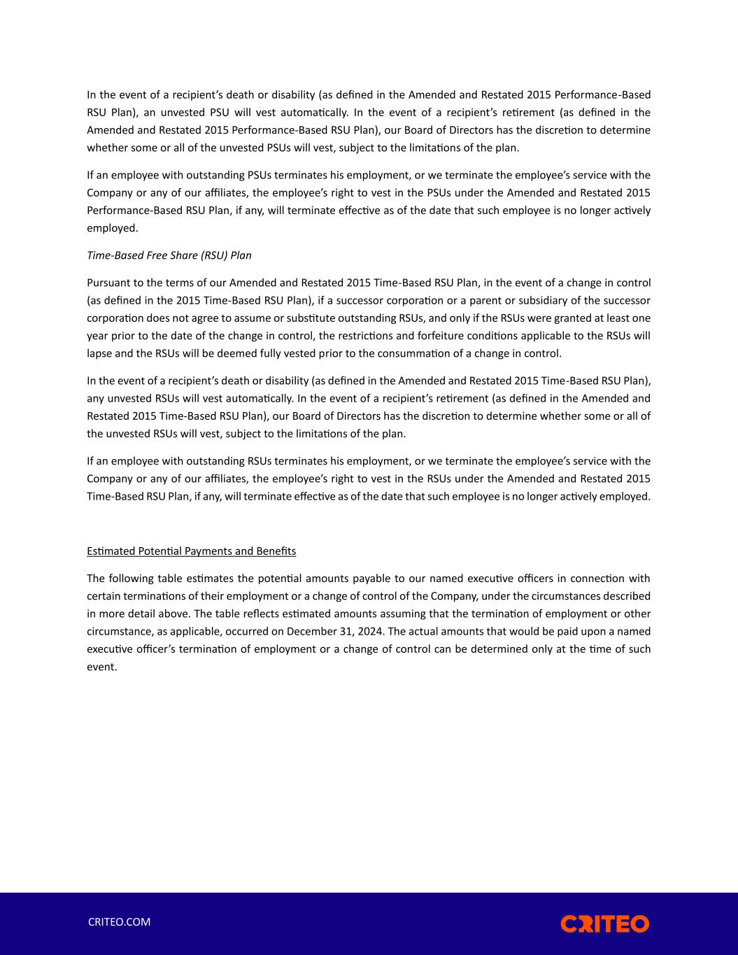 CRITEO.COM In the event of a recipient’s death or disability (as defined in the Amended and Restated 2015 Performance-Based RSU Plan), an unvested PSU will vest automatically. In the event of a recipient’s retirement (as defined in the Amended and Restated 2015 Performance-Based RSU Plan), our Board of Directors has the discretion to determine whether some or all of the unvested PSUs will vest, subject to the limitations of the plan. If an employee with outstanding PSUs terminates his employment, or we terminate the employee’s service with the Company or any of our affiliates, the employee’s right to vest in the PSUs under the Amended and Restated 2015 Performance-Based RSU Plan, if any, will terminate effective as of the date that such employee is no longer actively employed. Time-Based Free Share (RSU) Plan Pursuant to the terms of our Amended and Restated 2015 Time-Based RSU Plan, in the event of a change in control (as defined in the 2015 Time-Based RSU Plan), if a successor corporation or a parent or subsidiary of the successor corporation does not agree to assume or substitute outstanding RSUs, and only if the RSUs were granted at least one year prior to the date of the change in control, the restrictions and forfeiture conditions applicable to the RSUs will lapse and the RSUs will be deemed fully vested prior to the consummation of a change in control. In the event of a recipient’s death or disability (as defined in the Amended and Restated 2015 Time-Based RSU Plan), any unvested RSUs will vest automatically. In the event of a recipient’s retirement (as defined in the Amended and Restated 2015 Time-Based RSU Plan), our Board of Directors has the discretion to determine whether some or all of the unvested RSUs will vest, subject to the limitations of the plan. If an employee with outstanding RSUs terminates his employment, or we terminate the employee’s service with the Company or any of our affiliates, the employee’s right to vest in the RSUs under the Amended and Restated 2015 Time-Based RSU Plan, if any, will terminate effective as of the date that such employee is no longer actively employed. Estimated Potential Payments and Benefits The following table estimates the potential amounts payable to our named executive officers in connection with certain terminations of their employment or a change of control of the Company, under the circumstances described in more detail above. The table reflects estimated amounts assuming that the termination of employment or other circumstance, as applicable, occurred on December 31, 2024. The actual amounts that would be paid upon a named executive officer’s termination of employment or a change of control can be determined only at the time of such event.