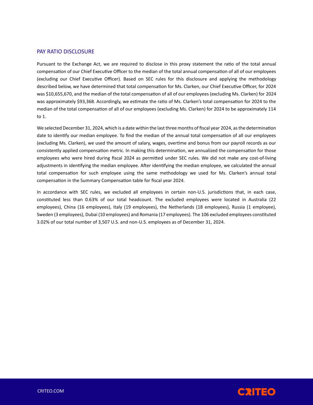 CRITEO.COM PAY RATIO DISCLOSURE Pursuant to the Exchange Act, we are required to disclose in this proxy statement the ratio of the total annual compensation of our Chief Executive Officer to the median of the total annual compensation of all of our employees (excluding our Chief Executive Officer). Based on SEC rules for this disclosure and applying the methodology described below, we have determined that total compensation for Ms. Clarken, our Chief Executive Officer, for 2024 was $10,655,670, and the median of the total compensation of all of our employees (excluding Ms. Clarken) for 2024 was approximately $93,368. Accordingly, we estimate the ratio of Ms. Clarken’s total compensation for 2024 to the median of the total compensation of all of our employees (excluding Ms. Clarken) for 2024 to be approximately 114 to 1. We selected December 31, 2024, which is a date within the last three months of fiscal year 2024, as the determination date to identify our median employee. To find the median of the annual total compensation of all our employees (excluding Ms. Clarken), we used the amount of salary, wages, overtime and bonus from our payroll records as our consistently applied compensation metric. In making this determination, we annualized the compensation for those employees who were hired during fiscal 2024 as permitted under SEC rules. We did not make any cost-of-living adjustments in identifying the median employee. After identifying the median employee, we calculated the annual total compensation for such employee using the same methodology we used for Ms. Clarken’s annual total compensation in the Summary Compensation table for fiscal year 2024. In accordance with SEC rules, we excluded all employees in certain non-U.S. jurisdictions that, in each case, constituted less than 0.63% of our total headcount. The excluded employees were located in Australia (22 employees), China (16 employees), Italy (19 employees), the Netherlands (18 employees), Russia (1 employee), Sweden (3 employees), Dubai (10 employees) and Romania (17 employees). The 106 excluded employees constituted 3.02% of our total number of 3,507 U.S. and non-U.S. employees as of December 31, 2024.