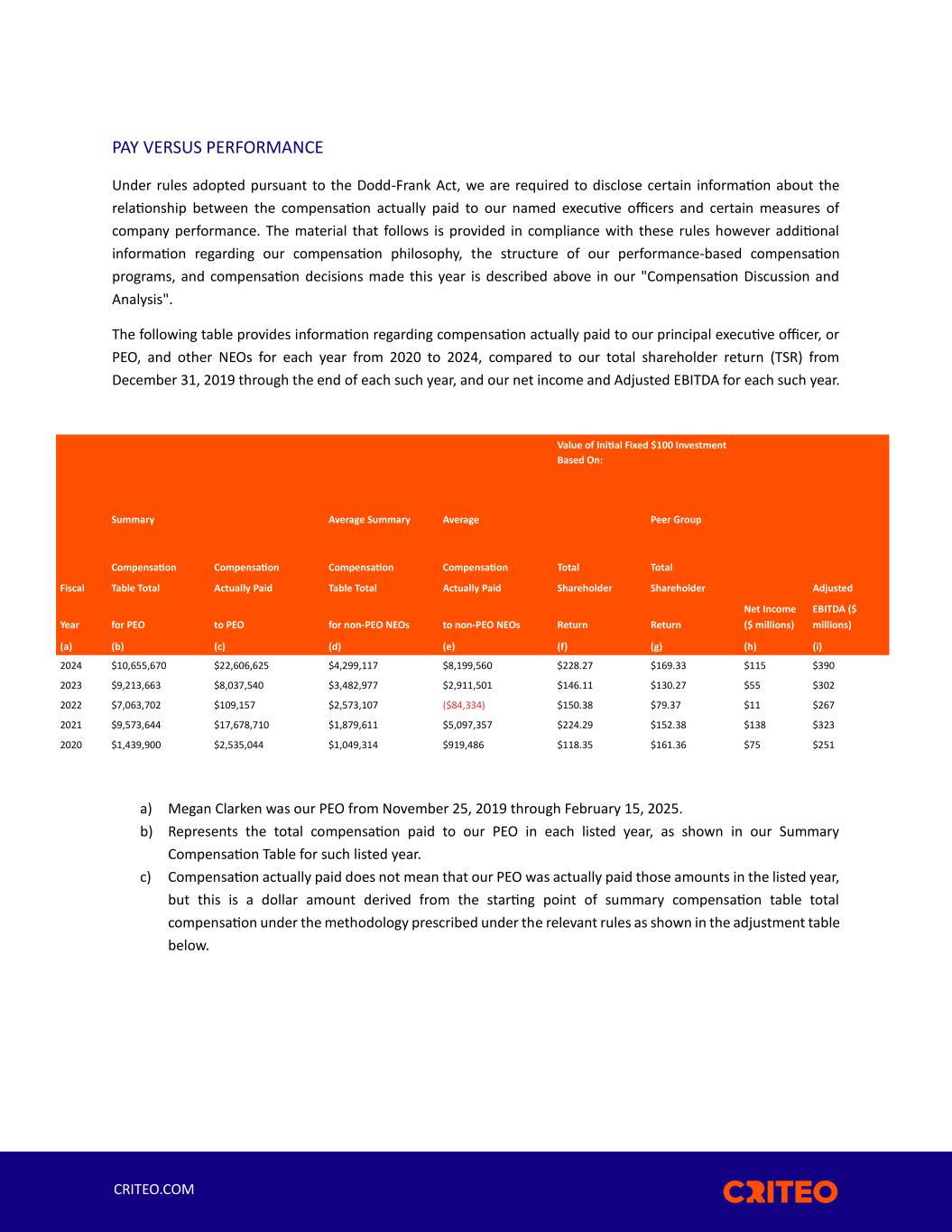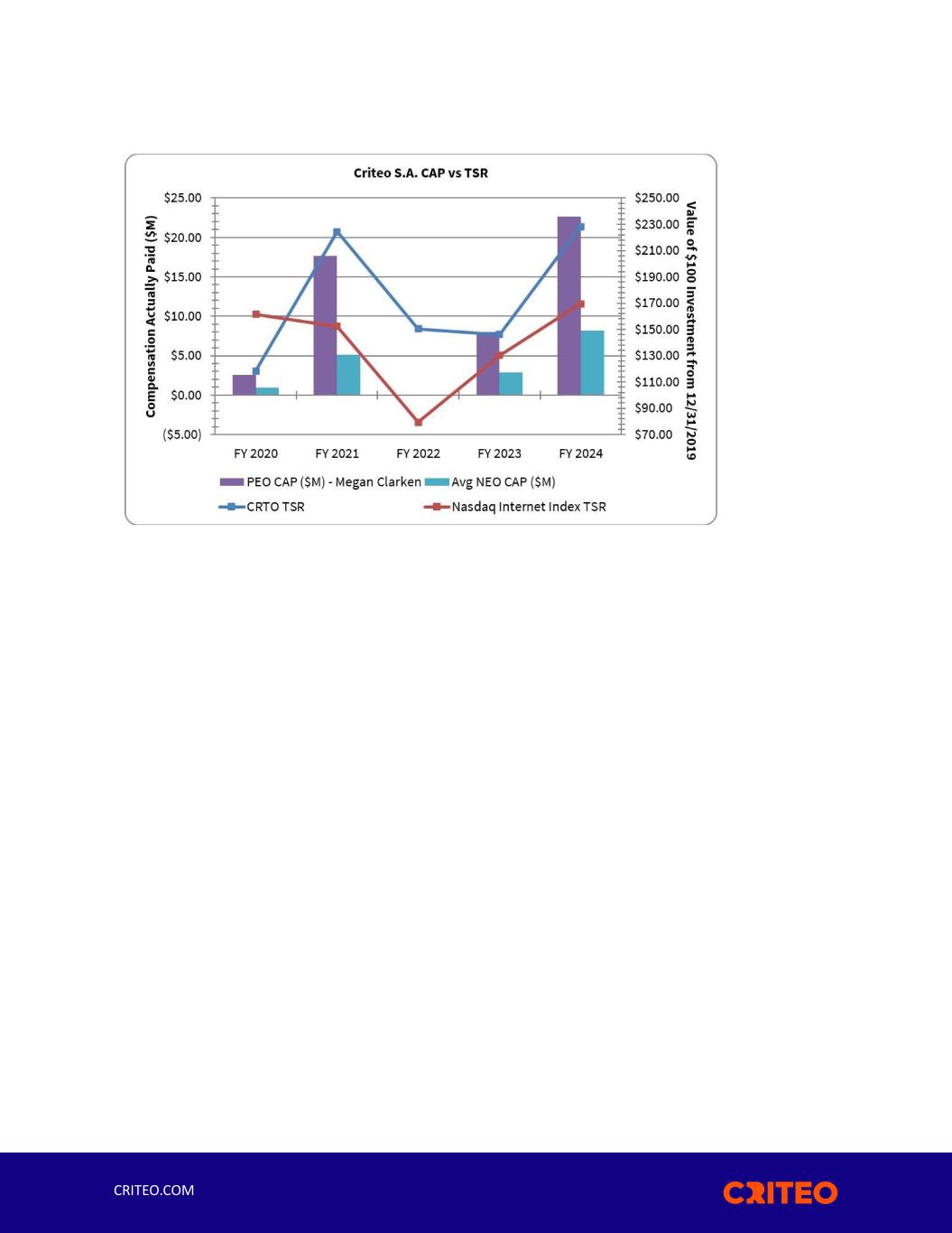 CRITEO.COM PAY VERSUS PERFORMANCE Under rules adopted pursuant to the Dodd-Frank Act, we are required to disclose certain information about the relationship between the compensation actually paid to our named executive officers and certain measures of company performance. The material that follows is provided in compliance with these rules however additional information regarding our compensation philosophy, the structure of our performance-based compensation programs, and compensation decisions made this year is described above in our "Compensation Discussion and Analysis". The following table provides information regarding compensation actually paid to our principal executive officer, or PEO, and other NEOs for each year from 2020 to 2024, compared to our total shareholder return (TSR) from December 31, 2019 through the end of each such year, and our net income and Adjusted EBITDA for each such year. Value of Initial Fixed $100 Investment Based On: Summary Average Summary Average Peer Group Net Income ($ millions) Compensation Compensation Compensation Compensation Total Total Fiscal Table Total Actually Paid Table Total Actually Paid Shareholder Shareholder Adjusted Year for PEO to PEO for non-PEO NEOs to non-PEO NEOs Return Return EBITDA ($ millions) (a) (b) (c) (d) (e) (f) (g) (h) (i) 2024 $10,655,670 $22,606,625 $4,299,117 $8,199,560 $228.27 $169.33 $115 $390 2023 $9,213,663 $8,037,540 $3,482,977 $2,911,501 $146.11 $130.27 $55 $302 2022 $7,063,702 $109,157 $2,573,107 ($84,334) $150.38 $79.37 $11 $267 2021 $9,573,644 $17,678,710 $1,879,611 $5,097,357 $224.29 $152.38 $138 $323 2020 $1,439,900 $2,535,044 $1,049,314 $919,486 $118.35 $161.36 $75 $251 a) Megan Clarken was our PEO from November 25, 2019 through February 15, 2025. b) Represents the total compensation paid to our PEO in each listed year, as shown in our Summary Compensation Table for such listed year. c) Compensation actually paid does not mean that our PEO was actually paid those amounts in the listed year, but this is a dollar amount derived from the starting point of summary compensation table total compensation under the methodology prescribed under the relevant rules as shown in the adjustment table below.