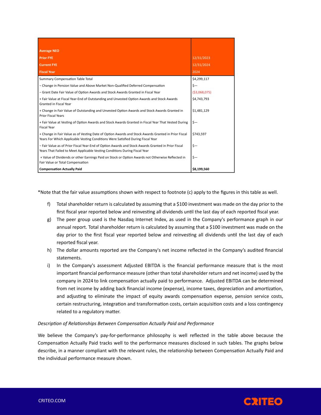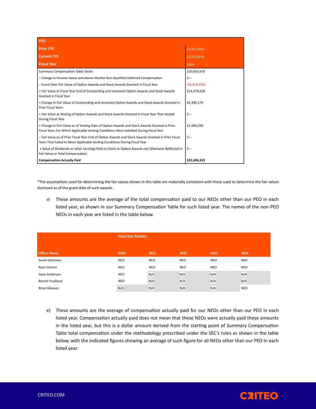 CRITEO.COM PEO Prior FYE 12/31/2023 Current FYE 12/31/2024 Fiscal Year 2024 Summary Compensation Table Totals $10,655,670 − Change in Pension Value and Above Market Non-Qualified Deferred Compensation $— − Grant Date Fair Value of Option Awards and Stock Awards Granted in Fiscal Year ($8,818,593) + Fair Value at Fiscal Year-End of Outstanding and Unvested Option Awards and Stock Awards Granted in Fiscal Year $14,478,639 + Change in Fair Value of Outstanding and Unvested Option Awards and Stock Awards Granted in Prior Fiscal Years $4,390,579 + Fair Value at Vesting of Option Awards and Stock Awards Granted in Fiscal Year That Vested During Fiscal Year $— + Change in Fair Value as of Vesting Date of Option Awards and Stock Awards Granted in Prior Fiscal Years For Which Applicable Vesting Conditions Were Satisfied During Fiscal Year $1,900,330 − Fair Value as of Prior Fiscal Year-End of Option Awards and Stock Awards Granted in Prior Fiscal Years That Failed to Meet Applicable Vesting Conditions During Fiscal Year $— ‘+ Value of Dividends or other Earnings Paid on Stock or Option Awards not Otherwise Reflected in Fair Value or Total Compensation $— Compensation Actually Paid $22,606,625 *The assumptions used for determining the fair values shown in this table are materially consistent with those used to determine the fair values disclosed as of the grant date of such awards. d) These amounts are the average of the total compensation paid to our NEOs other than our PEO in each listed year, as shown in our Summary Compensation Table for such listed year. The names of the non-PEO NEOs in each year are listed in the table below. Fiscal Year Position Officer Name 2020 2021 2022 2023 2024 Sarah Glickman NEO NEO NEO NEO NEO Ryan Damon NEO NEO NEO NEO NEO Dave Anderson NEO N/A N/A N/A N/A Benoit Fouilland NEO N/A N/A N/A N/A Brian Gleason N/A N/A N/A N/A NEO e) These amounts are the average of compensation actually paid for our NEOs other than our PEO in each listed year. Compensation actually paid does not mean that these NEOs were actually paid those amounts in the listed year, but this is a dollar amount derived from the starting point of Summary Compensation Table total compensation under the methodology prescribed under the SEC's rules as shown in the table below, with the indicated figures showing an average of such figure for all NEOs other than our PEO in each listed year.