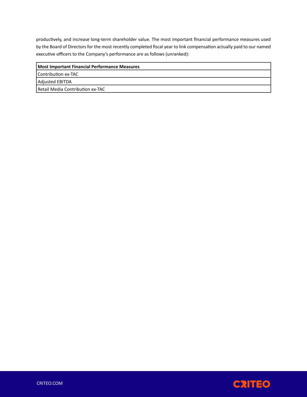 CRITEO.COM productively, and increase long-term shareholder value. The most important financial performance measures used by the Board of Directors for the most recently completed fiscal year to link compensation actually paid to our named executive officers to the Company’s performance are as follows (unranked): Most Important Financial Performance Measures Contribution ex-TAC Adjusted EBITDA Retail Media Contribution ex-TAC