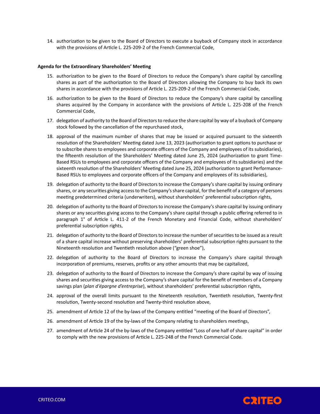 CRITEO.COM 14. authorization to be given to the Board of Directors to execute a buyback of Company stock in accordance with the provisions of Article L. 225-209-2 of the French Commercial Code, Agenda for the Extraordinary Shareholders’ Meeting 15. authorization to be given to the Board of Directors to reduce the Company’s share capital by cancelling shares as part of the authorization to the Board of Directors allowing the Company to buy back its own shares in accordance with the provisions of Article L. 225-209-2 of the French Commercial Code, 16. authorization to be given to the Board of Directors to reduce the Company’s share capital by cancelling shares acquired by the Company in accordance with the provisions of Article L. 225-208 of the French Commercial Code, 17. delegation of authority to the Board of Directors to reduce the share capital by way of a buyback of Company stock followed by the cancellation of the repurchased stock, 18. approval of the maximum number of shares that may be issued or acquired pursuant to the sixteenth resolution of the Shareholders’ Meeting dated June 13, 2023 (authorization to grant options to purchase or to subscribe shares to employees and corporate officers of the Company and employees of its subsidiaries), the fifteenth resolution of the Shareholders’ Meeting dated June 25, 2024 (authorization to grant Time- Based RSUs to employees and corporate officers of the Company and employees of its subsidiaries) and the sixteenth resolution of the Shareholders’ Meeting dated June 25, 2024 (authorization to grant Performance- Based RSUs to employees and corporate officers of the Company and employees of its subsidiaries), 19. delegation of authority to the Board of Directors to increase the Company’s share capital by issuing ordinary shares, or any securities giving access to the Company’s share capital, for the benefit of a category of persons meeting predetermined criteria (underwriters), without shareholders’ preferential subscription rights, 20. delegation of authority to the Board of Directors to increase the Company’s share capital by issuing ordinary shares or any securities giving access to the Company’s share capital through a public offering referred to in paragraph 1° of Article L. 411-2 of the French Monetary and Financial Code, without shareholders’ preferential subscription rights, 21. delegation of authority to the Board of Directors to increase the number of securities to be issued as a result of a share capital increase without preserving shareholders’ preferential subscription rights pursuant to the Nineteenth resolution and Twentieth resolution above (“green shoe”), 22. delegation of authority to the Board of Directors to increase the Company’s share capital through incorporation of premiums, reserves, profits or any other amounts that may be capitalized, 23. delegation of authority to the Board of Directors to increase the Company’s share capital by way of issuing shares and securities giving access to the Company’s share capital for the benefit of members of a Company savings plan (plan d'épargne d’entreprise), without shareholders’ preferential subscription rights, 24. approval of the overall limits pursuant to the Nineteenth resolution, Twentieth resolution, Twenty-first resolution, Twenty-second resolution and Twenty-third resolution above, 25. amendment of Article 12 of the by-laws of the Company entitled “meeting of the Board of Directors”, 26. amendment of Article 19 of the by-laws of the Company relating to shareholders meetings, 27. amendment of Article 24 of the by-laws of the Company entitled “Loss of one half of share capital” in order to comply with the new provisions of Article L. 225-248 of the French Commercial Code.
