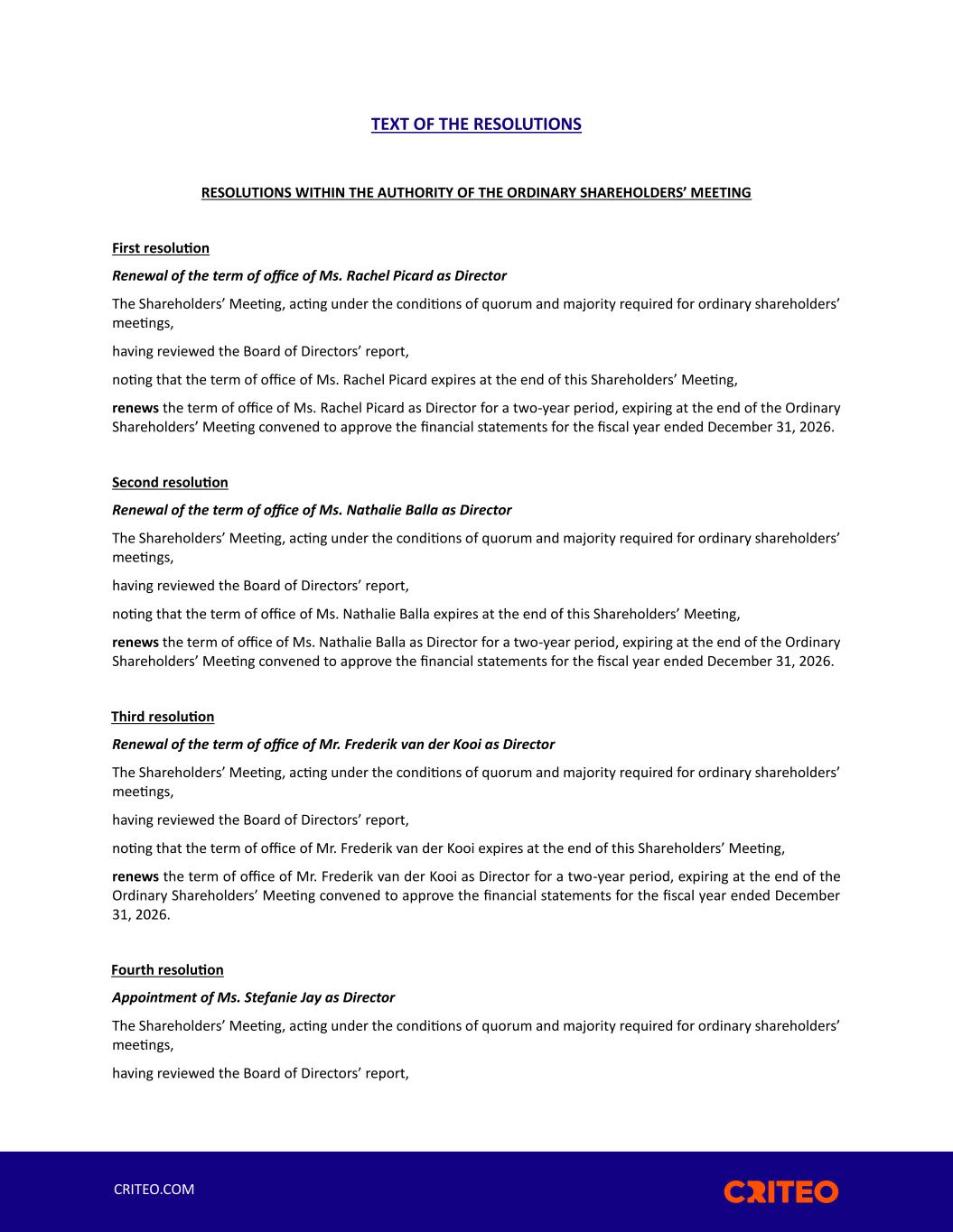CRITEO.COM TEXT OF THE RESOLUTIONS RESOLUTIONS WITHIN THE AUTHORITY OF THE ORDINARY SHAREHOLDERS’ MEETING First resolution Renewal of the term of office of Ms. Rachel Picard as Director The Shareholders’ Meeting, acting under the conditions of quorum and majority required for ordinary shareholders’ meetings, having reviewed the Board of Directors’ report, noting that the term of office of Ms. Rachel Picard expires at the end of this Shareholders’ Meeting, renews the term of office of Ms. Rachel Picard as Director for a two-year period, expiring at the end of the Ordinary Shareholders’ Meeting convened to approve the financial statements for the fiscal year ended December 31, 2026. Second resolution Renewal of the term of office of Ms. Nathalie Balla as Director The Shareholders’ Meeting, acting under the conditions of quorum and majority required for ordinary shareholders’ meetings, having reviewed the Board of Directors’ report, noting that the term of office of Ms. Nathalie Balla expires at the end of this Shareholders’ Meeting, renews the term of office of Ms. Nathalie Balla as Director for a two-year period, expiring at the end of the Ordinary Shareholders’ Meeting convened to approve the financial statements for the fiscal year ended December 31, 2026. Third resolution Renewal of the term of office of Mr. Frederik van der Kooi as Director The Shareholders’ Meeting, acting under the conditions of quorum and majority required for ordinary shareholders’ meetings, having reviewed the Board of Directors’ report, noting that the term of office of Mr. Frederik van der Kooi expires at the end of this Shareholders’ Meeting, renews the term of office of Mr. Frederik van der Kooi as Director for a two-year period, expiring at the end of the Ordinary Shareholders’ Meeting convened to approve the financial statements for the fiscal year ended December 31, 2026. Fourth resolution Appointment of Ms. Stefanie Jay as Director The Shareholders’ Meeting, acting under the conditions of quorum and majority required for ordinary shareholders’ meetings, having reviewed the Board of Directors’ report,