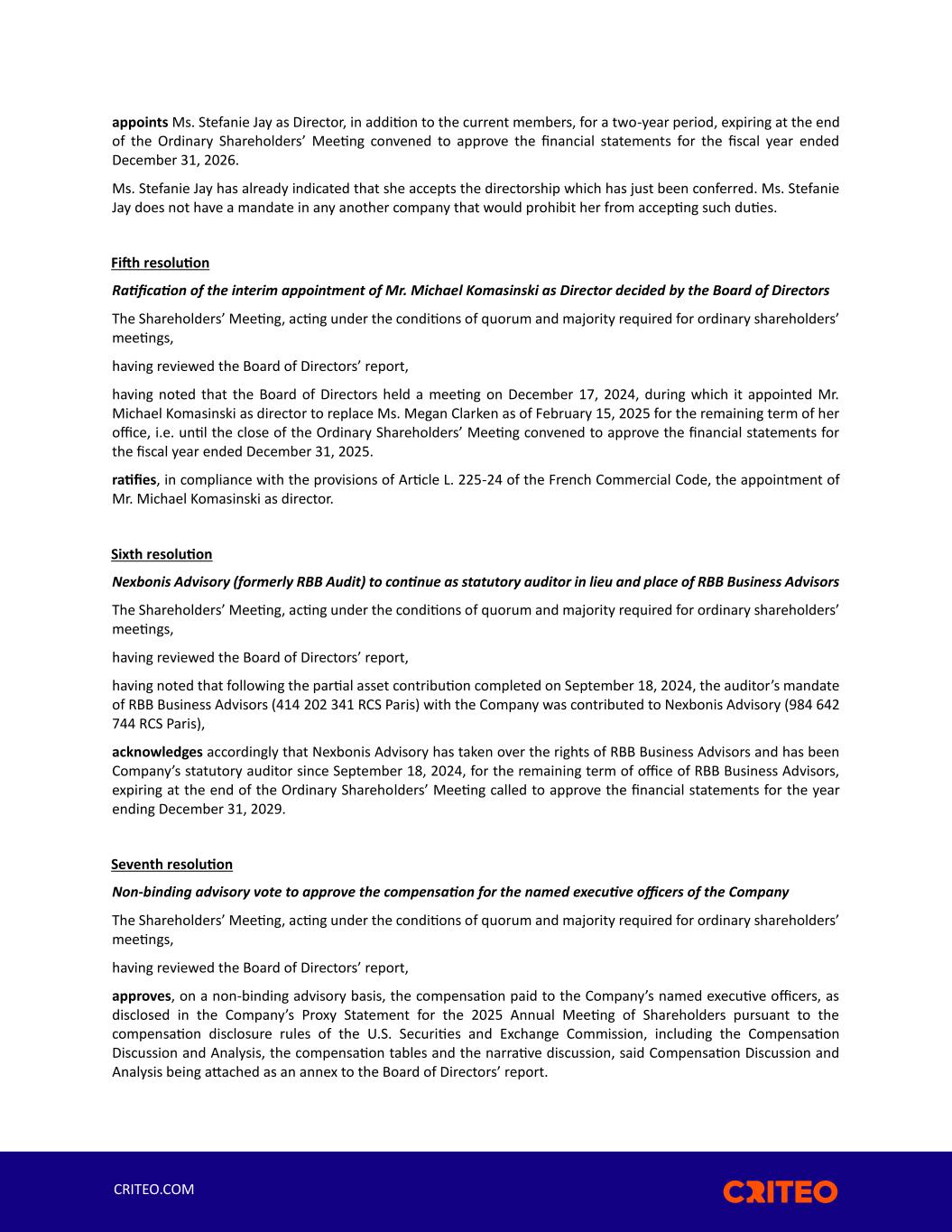 CRITEO.COM appoints Ms. Stefanie Jay as Director, in addition to the current members, for a two-year period, expiring at the end of the Ordinary Shareholders’ Meeting convened to approve the financial statements for the fiscal year ended December 31, 2026. Ms. Stefanie Jay has already indicated that she accepts the directorship which has just been conferred. Ms. Stefanie Jay does not have a mandate in any another company that would prohibit her from accepting such duties. Fifth resolution Ratification of the interim appointment of Mr. Michael Komasinski as Director decided by the Board of Directors The Shareholders’ Meeting, acting under the conditions of quorum and majority required for ordinary shareholders’ meetings, having reviewed the Board of Directors’ report, having noted that the Board of Directors held a meeting on December 17, 2024, during which it appointed Mr. Michael Komasinski as director to replace Ms. Megan Clarken as of February 15, 2025 for the remaining term of her office, i.e. until the close of the Ordinary Shareholders’ Meeting convened to approve the financial statements for the fiscal year ended December 31, 2025. ratifies, in compliance with the provisions of Article L. 225-24 of the French Commercial Code, the appointment of Mr. Michael Komasinski as director. Sixth resolution Nexbonis Advisory (formerly RBB Audit) to continue as statutory auditor in lieu and place of RBB Business Advisors The Shareholders’ Meeting, acting under the conditions of quorum and majority required for ordinary shareholders’ meetings, having reviewed the Board of Directors’ report, having noted that following the partial asset contribution completed on September 18, 2024, the auditor’s mandate of RBB Business Advisors (414 202 341 RCS Paris) with the Company was contributed to Nexbonis Advisory (984 642 744 RCS Paris), acknowledges accordingly that Nexbonis Advisory has taken over the rights of RBB Business Advisors and has been Company’s statutory auditor since September 18, 2024, for the remaining term of office of RBB Business Advisors, expiring at the end of the Ordinary Shareholders’ Meeting called to approve the financial statements for the year ending December 31, 2029. Seventh resolution Non-binding advisory vote to approve the compensation for the named executive officers of the Company The Shareholders’ Meeting, acting under the conditions of quorum and majority required for ordinary shareholders’ meetings, having reviewed the Board of Directors’ report, approves, on a non-binding advisory basis, the compensation paid to the Company’s named executive officers, as disclosed in the Company’s Proxy Statement for the 2025 Annual Meeting of Shareholders pursuant to the compensation disclosure rules of the U.S. Securities and Exchange Commission, including the Compensation Discussion and Analysis, the compensation tables and the narrative discussion, said Compensation Discussion and Analysis being attached as an annex to the Board of Directors’ report.