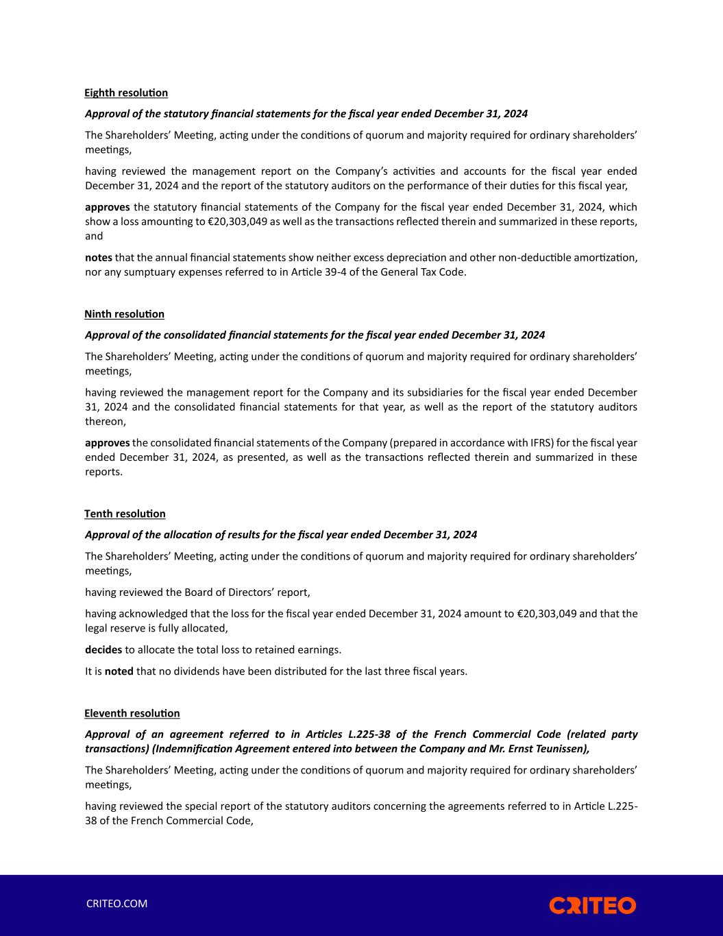 CRITEO.COM Eighth resolution Approval of the statutory financial statements for the fiscal year ended December 31, 2024 The Shareholders’ Meeting, acting under the conditions of quorum and majority required for ordinary shareholders’ meetings, having reviewed the management report on the Company’s activities and accounts for the fiscal year ended December 31, 2024 and the report of the statutory auditors on the performance of their duties for this fiscal year, approves the statutory financial statements of the Company for the fiscal year ended December 31, 2024, which show a loss amounting to €20,303,049 as well as the transactions reflected therein and summarized in these reports, and notes that the annual financial statements show neither excess depreciation and other non-deductible amortization, nor any sumptuary expenses referred to in Article 39-4 of the General Tax Code. Ninth resolution Approval of the consolidated financial statements for the fiscal year ended December 31, 2024 The Shareholders’ Meeting, acting under the conditions of quorum and majority required for ordinary shareholders’ meetings, having reviewed the management report for the Company and its subsidiaries for the fiscal year ended December 31, 2024 and the consolidated financial statements for that year, as well as the report of the statutory auditors thereon, approves the consolidated financial statements of the Company (prepared in accordance with IFRS) for the fiscal year ended December 31, 2024, as presented, as well as the transactions reflected therein and summarized in these reports. Tenth resolution Approval of the allocation of results for the fiscal year ended December 31, 2024 The Shareholders’ Meeting, acting under the conditions of quorum and majority required for ordinary shareholders’ meetings, having reviewed the Board of Directors’ report, having acknowledged that the loss for the fiscal year ended December 31, 2024 amount to €20,303,049 and that the legal reserve is fully allocated, decides to allocate the total loss to retained earnings. It is noted that no dividends have been distributed for the last three fiscal years. Eleventh resolution Approval of an agreement referred to in Articles L.225-38 of the French Commercial Code (related party transactions) (Indemnification Agreement entered into between the Company and Mr. Ernst Teunissen), The Shareholders’ Meeting, acting under the conditions of quorum and majority required for ordinary shareholders’ meetings, having reviewed the special report of the statutory auditors concerning the agreements referred to in Article L.225- 38 of the French Commercial Code,