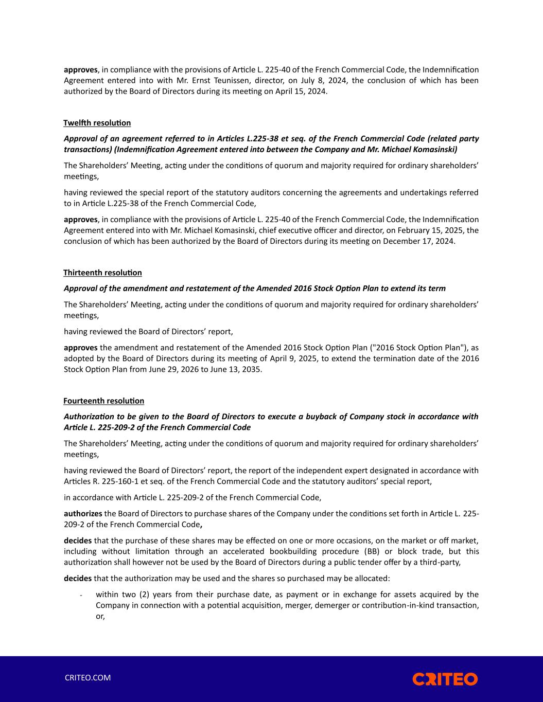 CRITEO.COM approves, in compliance with the provisions of Article L. 225-40 of the French Commercial Code, the Indemnification Agreement entered into with Mr. Ernst Teunissen, director, on July 8, 2024, the conclusion of which has been authorized by the Board of Directors during its meeting on April 15, 2024. Twelfth resolution Approval of an agreement referred to in Articles L.225-38 et seq. of the French Commercial Code (related party transactions) (Indemnification Agreement entered into between the Company and Mr. Michael Komasinski) The Shareholders’ Meeting, acting under the conditions of quorum and majority required for ordinary shareholders’ meetings, having reviewed the special report of the statutory auditors concerning the agreements and undertakings referred to in Article L.225-38 of the French Commercial Code, approves, in compliance with the provisions of Article L. 225-40 of the French Commercial Code, the Indemnification Agreement entered into with Mr. Michael Komasinski, chief executive officer and director, on February 15, 2025, the conclusion of which has been authorized by the Board of Directors during its meeting on December 17, 2024. Thirteenth resolution Approval of the amendment and restatement of the Amended 2016 Stock Option Plan to extend its term The Shareholders’ Meeting, acting under the conditions of quorum and majority required for ordinary shareholders’ meetings, having reviewed the Board of Directors’ report, approves the amendment and restatement of the Amended 2016 Stock Option Plan ("2016 Stock Option Plan"), as adopted by the Board of Directors during its meeting of April 9, 2025, to extend the termination date of the 2016 Stock Option Plan from June 29, 2026 to June 13, 2035. Fourteenth resolution Authorization to be given to the Board of Directors to execute a buyback of Company stock in accordance with Article L. 225-209-2 of the French Commercial Code The Shareholders’ Meeting, acting under the conditions of quorum and majority required for ordinary shareholders’ meetings, having reviewed the Board of Directors’ report, the report of the independent expert designated in accordance with Articles R. 225-160-1 et seq. of the French Commercial Code and the statutory auditors’ special report, in accordance with Article L. 225-209-2 of the French Commercial Code, authorizes the Board of Directors to purchase shares of the Company under the conditions set forth in Article L. 225- 209-2 of the French Commercial Code, decides that the purchase of these shares may be effected on one or more occasions, on the market or off market, including without limitation through an accelerated bookbuilding procedure (BB) or block trade, but this authorization shall however not be used by the Board of Directors during a public tender offer by a third-party, decides that the authorization may be used and the shares so purchased may be allocated: - within two (2) years from their purchase date, as payment or in exchange for assets acquired by the Company in connection with a potential acquisition, merger, demerger or contribution-in-kind transaction, or,