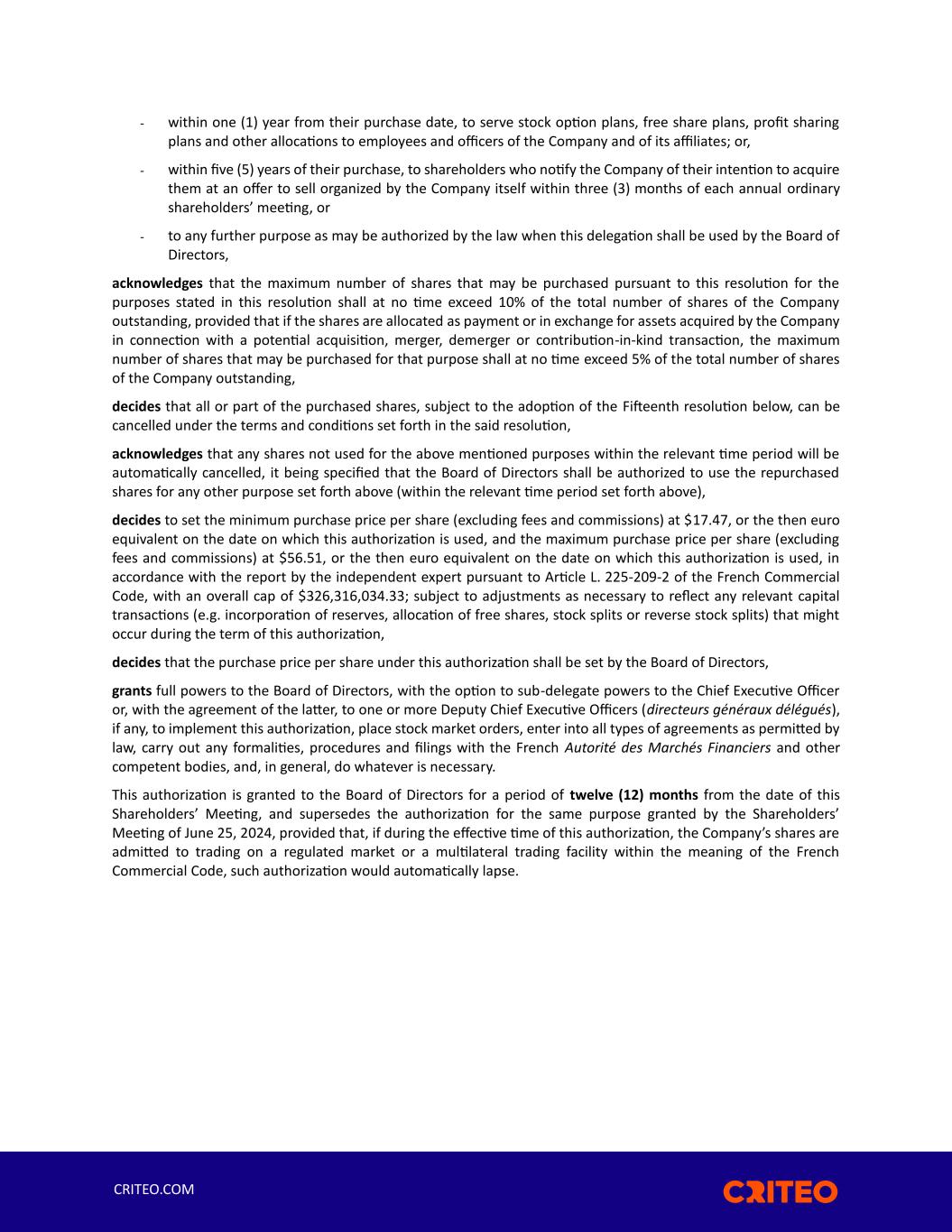 CRITEO.COM - within one (1) year from their purchase date, to serve stock option plans, free share plans, profit sharing plans and other allocations to employees and officers of the Company and of its affiliates; or, - within five (5) years of their purchase, to shareholders who notify the Company of their intention to acquire them at an offer to sell organized by the Company itself within three (3) months of each annual ordinary shareholders’ meeting, or - to any further purpose as may be authorized by the law when this delegation shall be used by the Board of Directors, acknowledges that the maximum number of shares that may be purchased pursuant to this resolution for the purposes stated in this resolution shall at no time exceed 10% of the total number of shares of the Company outstanding, provided that if the shares are allocated as payment or in exchange for assets acquired by the Company in connection with a potential acquisition, merger, demerger or contribution-in-kind transaction, the maximum number of shares that may be purchased for that purpose shall at no time exceed 5% of the total number of shares of the Company outstanding, decides that all or part of the purchased shares, subject to the adoption of the Fifteenth resolution below, can be cancelled under the terms and conditions set forth in the said resolution, acknowledges that any shares not used for the above mentioned purposes within the relevant time period will be automatically cancelled, it being specified that the Board of Directors shall be authorized to use the repurchased shares for any other purpose set forth above (within the relevant time period set forth above), decides to set the minimum purchase price per share (excluding fees and commissions) at $17.47, or the then euro equivalent on the date on which this authorization is used, and the maximum purchase price per share (excluding fees and commissions) at $56.51, or the then euro equivalent on the date on which this authorization is used, in accordance with the report by the independent expert pursuant to Article L. 225-209-2 of the French Commercial Code, with an overall cap of $326,316,034.33; subject to adjustments as necessary to reflect any relevant capital transactions (e.g. incorporation of reserves, allocation of free shares, stock splits or reverse stock splits) that might occur during the term of this authorization, decides that the purchase price per share under this authorization shall be set by the Board of Directors, grants full powers to the Board of Directors, with the option to sub-delegate powers to the Chief Executive Officer or, with the agreement of the latter, to one or more Deputy Chief Executive Officers (directeurs généraux délégués), if any, to implement this authorization, place stock market orders, enter into all types of agreements as permitted by law, carry out any formalities, procedures and filings with the French Autorité des Marchés Financiers and other competent bodies, and, in general, do whatever is necessary. This authorization is granted to the Board of Directors for a period of twelve (12) months from the date of this Shareholders’ Meeting, and supersedes the authorization for the same purpose granted by the Shareholders’ Meeting of June 25, 2024, provided that, if during the effective time of this authorization, the Company’s shares are admitted to trading on a regulated market or a multilateral trading facility within the meaning of the French Commercial Code, such authorization would automatically lapse.