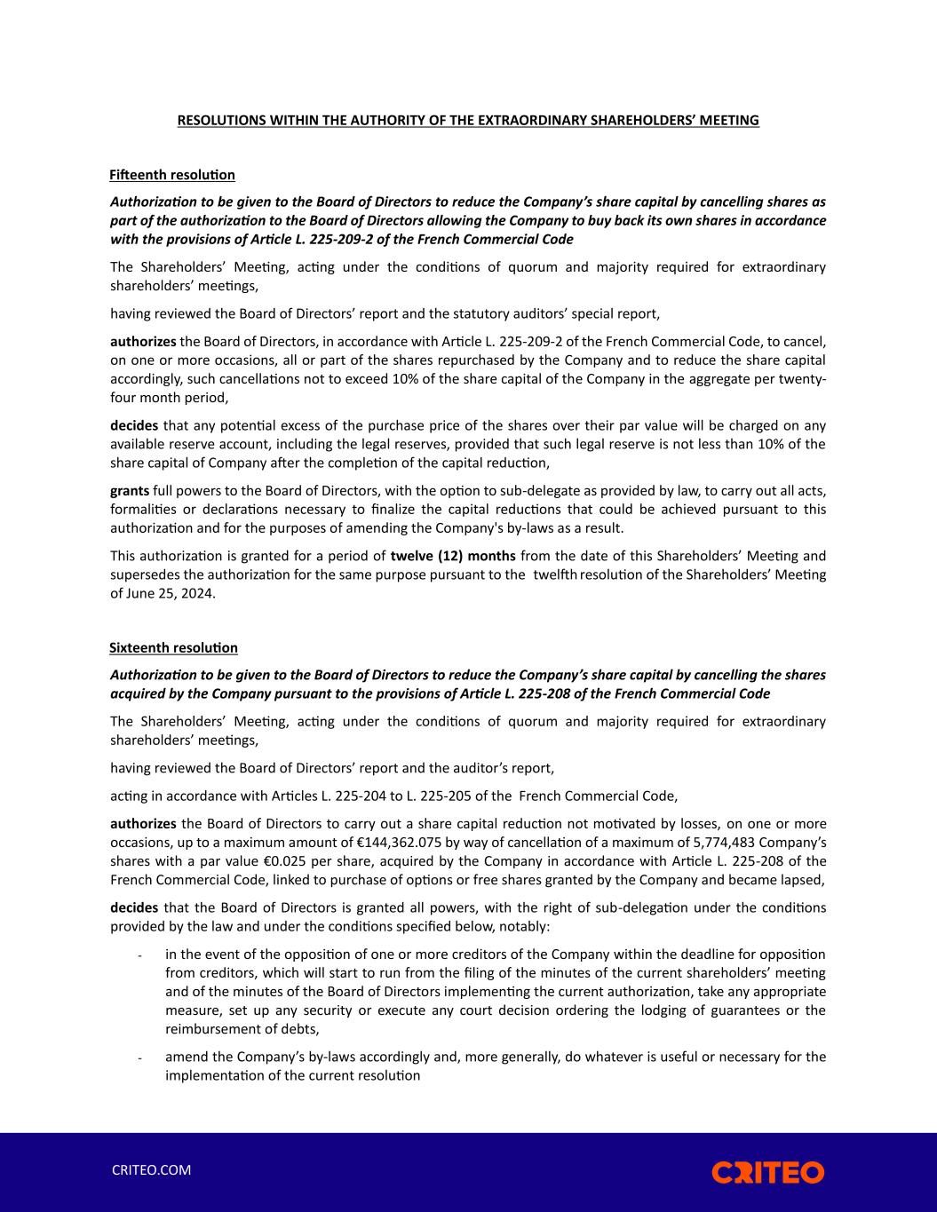 CRITEO.COM RESOLUTIONS WITHIN THE AUTHORITY OF THE EXTRAORDINARY SHAREHOLDERS’ MEETING Fifteenth resolution Authorization to be given to the Board of Directors to reduce the Company’s share capital by cancelling shares as part of the authorization to the Board of Directors allowing the Company to buy back its own shares in accordance with the provisions of Article L. 225-209-2 of the French Commercial Code The Shareholders’ Meeting, acting under the conditions of quorum and majority required for extraordinary shareholders’ meetings, having reviewed the Board of Directors’ report and the statutory auditors’ special report, authorizes the Board of Directors, in accordance with Article L. 225-209-2 of the French Commercial Code, to cancel, on one or more occasions, all or part of the shares repurchased by the Company and to reduce the share capital accordingly, such cancellations not to exceed 10% of the share capital of the Company in the aggregate per twenty- four month period, decides that any potential excess of the purchase price of the shares over their par value will be charged on any available reserve account, including the legal reserves, provided that such legal reserve is not less than 10% of the share capital of Company after the completion of the capital reduction, grants full powers to the Board of Directors, with the option to sub-delegate as provided by law, to carry out all acts, formalities or declarations necessary to finalize the capital reductions that could be achieved pursuant to this authorization and for the purposes of amending the Company's by-laws as a result. This authorization is granted for a period of twelve (12) months from the date of this Shareholders’ Meeting and supersedes the authorization for the same purpose pursuant to the twelfth resolution of the Shareholders’ Meeting of June 25, 2024. Sixteenth resolution Authorization to be given to the Board of Directors to reduce the Company’s share capital by cancelling the shares acquired by the Company pursuant to the provisions of Article L. 225-208 of the French Commercial Code The Shareholders’ Meeting, acting under the conditions of quorum and majority required for extraordinary shareholders’ meetings, having reviewed the Board of Directors’ report and the auditor’s report, acting in accordance with Articles L. 225-204 to L. 225-205 of the French Commercial Code, authorizes the Board of Directors to carry out a share capital reduction not motivated by losses, on one or more occasions, up to a maximum amount of €144,362.075 by way of cancellation of a maximum of 5,774,483 Company’s shares with a par value €0.025 per share, acquired by the Company in accordance with Article L. 225-208 of the French Commercial Code, linked to purchase of options or free shares granted by the Company and became lapsed, decides that the Board of Directors is granted all powers, with the right of sub-delegation under the conditions provided by the law and under the conditions specified below, notably: - in the event of the opposition of one or more creditors of the Company within the deadline for opposition from creditors, which will start to run from the filing of the minutes of the current shareholders’ meeting and of the minutes of the Board of Directors implementing the current authorization, take any appropriate measure, set up any security or execute any court decision ordering the lodging of guarantees or the reimbursement of debts, - amend the Company’s by-laws accordingly and, more generally, do whatever is useful or necessary for the implementation of the current resolution