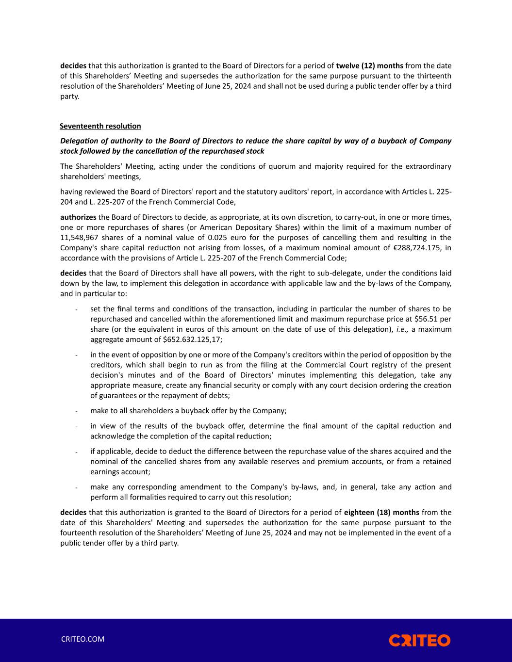 CRITEO.COM decides that this authorization is granted to the Board of Directors for a period of twelve (12) months from the date of this Shareholders’ Meeting and supersedes the authorization for the same purpose pursuant to the thirteenth resolution of the Shareholders’ Meeting of June 25, 2024 and shall not be used during a public tender offer by a third party. Seventeenth resolution Delegation of authority to the Board of Directors to reduce the share capital by way of a buyback of Company stock followed by the cancellation of the repurchased stock The Shareholders' Meeting, acting under the conditions of quorum and majority required for the extraordinary shareholders' meetings, having reviewed the Board of Directors' report and the statutory auditors' report, in accordance with Articles L. 225- 204 and L. 225-207 of the French Commercial Code, authorizes the Board of Directors to decide, as appropriate, at its own discretion, to carry-out, in one or more times, one or more repurchases of shares (or American Depositary Shares) within the limit of a maximum number of 11,548,967 shares of a nominal value of 0.025 euro for the purposes of cancelling them and resulting in the Company's share capital reduction not arising from losses, of a maximum nominal amount of €288,724.175, in accordance with the provisions of Article L. 225-207 of the French Commercial Code; decides that the Board of Directors shall have all powers, with the right to sub-delegate, under the conditions laid down by the law, to implement this delegation in accordance with applicable law and the by-laws of the Company, and in particular to: - set the final terms and conditions of the transaction, including in particular the number of shares to be repurchased and cancelled within the aforementioned limit and maximum repurchase price at $56.51 per share (or the equivalent in euros of this amount on the date of use of this delegation), i.e., a maximum aggregate amount of $652.632.125,17; - in the event of opposition by one or more of the Company's creditors within the period of opposition by the creditors, which shall begin to run as from the filing at the Commercial Court registry of the present decision's minutes and of the Board of Directors' minutes implementing this delegation, take any appropriate measure, create any financial security or comply with any court decision ordering the creation of guarantees or the repayment of debts; - make to all shareholders a buyback offer by the Company; - in view of the results of the buyback offer, determine the final amount of the capital reduction and acknowledge the completion of the capital reduction; - if applicable, decide to deduct the difference between the repurchase value of the shares acquired and the nominal of the cancelled shares from any available reserves and premium accounts, or from a retained earnings account; - make any corresponding amendment to the Company's by-laws, and, in general, take any action and perform all formalities required to carry out this resolution; decides that this authorization is granted to the Board of Directors for a period of eighteen (18) months from the date of this Shareholders' Meeting and supersedes the authorization for the same purpose pursuant to the fourteenth resolution of the Shareholders’ Meeting of June 25, 2024 and may not be implemented in the event of a public tender offer by a third party.