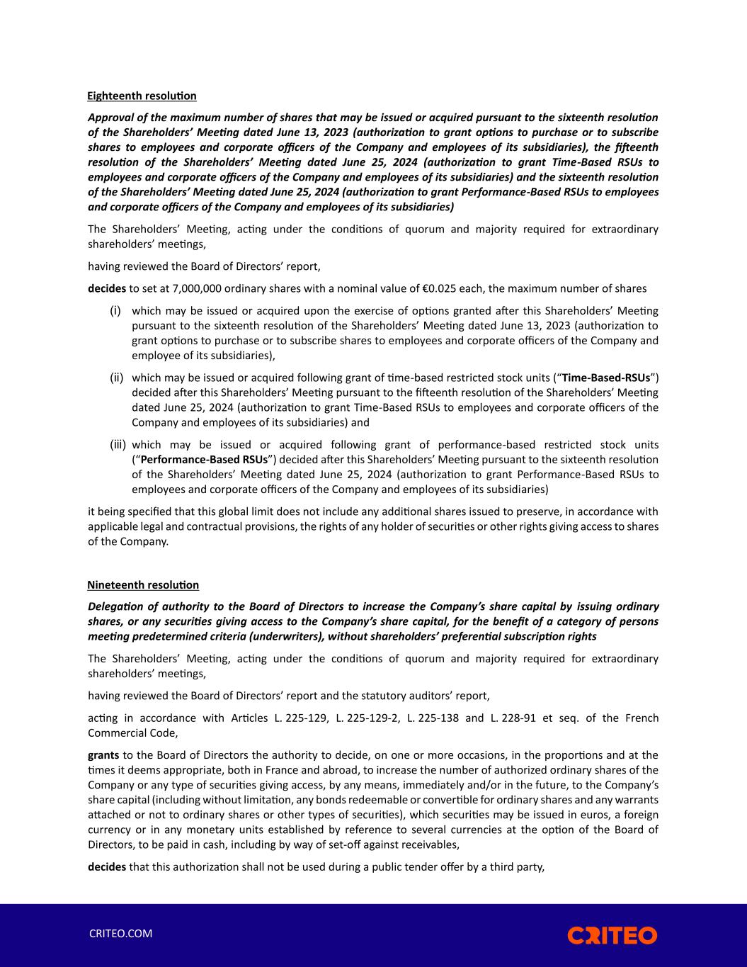 CRITEO.COM Eighteenth resolution Approval of the maximum number of shares that may be issued or acquired pursuant to the sixteenth resolution of the Shareholders’ Meeting dated June 13, 2023 (authorization to grant options to purchase or to subscribe shares to employees and corporate officers of the Company and employees of its subsidiaries), the fifteenth resolution of the Shareholders’ Meeting dated June 25, 2024 (authorization to grant Time-Based RSUs to employees and corporate officers of the Company and employees of its subsidiaries) and the sixteenth resolution of the Shareholders’ Meeting dated June 25, 2024 (authorization to grant Performance-Based RSUs to employees and corporate officers of the Company and employees of its subsidiaries) The Shareholders’ Meeting, acting under the conditions of quorum and majority required for extraordinary shareholders’ meetings, having reviewed the Board of Directors’ report, decides to set at 7,000,000 ordinary shares with a nominal value of €0.025 each, the maximum number of shares (i) which may be issued or acquired upon the exercise of options granted after this Shareholders’ Meeting pursuant to the sixteenth resolution of the Shareholders’ Meeting dated June 13, 2023 (authorization to grant options to purchase or to subscribe shares to employees and corporate officers of the Company and employee of its subsidiaries), (ii) which may be issued or acquired following grant of time-based restricted stock units (“Time-Based-RSUs”) decided after this Shareholders’ Meeting pursuant to the fifteenth resolution of the Shareholders’ Meeting dated June 25, 2024 (authorization to grant Time-Based RSUs to employees and corporate officers of the Company and employees of its subsidiaries) and (iii) which may be issued or acquired following grant of performance-based restricted stock units (“Performance-Based RSUs”) decided after this Shareholders’ Meeting pursuant to the sixteenth resolution of the Shareholders’ Meeting dated June 25, 2024 (authorization to grant Performance-Based RSUs to employees and corporate officers of the Company and employees of its subsidiaries) it being specified that this global limit does not include any additional shares issued to preserve, in accordance with applicable legal and contractual provisions, the rights of any holder of securities or other rights giving access to shares of the Company. Nineteenth resolution Delegation of authority to the Board of Directors to increase the Company’s share capital by issuing ordinary shares, or any securities giving access to the Company’s share capital, for the benefit of a category of persons meeting predetermined criteria (underwriters), without shareholders’ preferential subscription rights The Shareholders’ Meeting, acting under the conditions of quorum and majority required for extraordinary shareholders’ meetings, having reviewed the Board of Directors’ report and the statutory auditors’ report, acting in accordance with Articles L. 225-129, L. 225-129-2, L. 225-138 and L. 228-91 et seq. of the French Commercial Code, grants to the Board of Directors the authority to decide, on one or more occasions, in the proportions and at the times it deems appropriate, both in France and abroad, to increase the number of authorized ordinary shares of the Company or any type of securities giving access, by any means, immediately and/or in the future, to the Company’s share capital (including without limitation, any bonds redeemable or convertible for ordinary shares and any warrants attached or not to ordinary shares or other types of securities), which securities may be issued in euros, a foreign currency or in any monetary units established by reference to several currencies at the option of the Board of Directors, to be paid in cash, including by way of set-off against receivables, decides that this authorization shall not be used during a public tender offer by a third party,