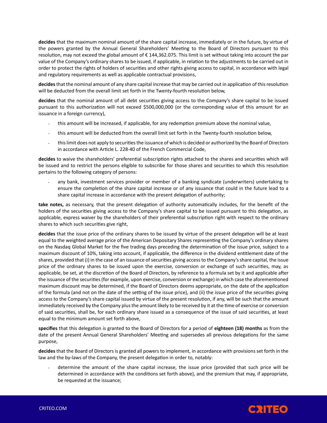 CRITEO.COM decides that the maximum nominal amount of the share capital increase, immediately or in the future, by virtue of the powers granted by the Annual General Shareholders’ Meeting to the Board of Directors pursuant to this resolution, may not exceed the global amount of € 144,362.075. This limit is set without taking into account the par value of the Company’s ordinary shares to be issued, if applicable, in relation to the adjustments to be carried out in order to protect the rights of holders of securities and other rights giving access to capital, in accordance with legal and regulatory requirements as well as applicable contractual provisions, decides that the nominal amount of any share capital increase that may be carried out in application of this resolution will be deducted from the overall limit set forth in the Twenty-fourth resolution below, decides that the nominal amount of all debt securities giving access to the Company’s share capital to be issued pursuant to this authorization will not exceed $500,000,000 (or the corresponding value of this amount for an issuance in a foreign currency), - this amount will be increased, if applicable, for any redemption premium above the nominal value, - this amount will be deducted from the overall limit set forth in the Twenty-fourth resolution below, - this limit does not apply to securities the issuance of which is decided or authorized by the Board of Directors in accordance with Article L. 228-40 of the French Commercial Code, decides to waive the shareholders’ preferential subscription rights attached to the shares and securities which will be issued and to restrict the persons eligible to subscribe for those shares and securities to which this resolution pertains to the following category of persons: - any bank, investment services provider or member of a banking syndicate (underwriters) undertaking to ensure the completion of the share capital increase or of any issuance that could in the future lead to a share capital increase in accordance with the present delegation of authority; take notes, as necessary, that the present delegation of authority automatically includes, for the benefit of the holders of the securities giving access to the Company’s share capital to be issued pursuant to this delegation, as applicable, express waiver by the shareholders of their preferential subscription right with respect to the ordinary shares to which such securities give right, decides that the issue price of the ordinary shares to be issued by virtue of the present delegation will be at least equal to the weighted average price of the American Depositary Shares representing the Company’s ordinary shares on the Nasdaq Global Market for the five trading days preceding the determination of the issue price, subject to a maximum discount of 10%, taking into account, if applicable, the difference in the dividend entitlement date of the shares, provided that (i) in the case of an issuance of securities giving access to the Company’s share capital, the issue price of the ordinary shares to be issued upon the exercise, conversion or exchange of such securities, may, as applicable, be set, at the discretion of the Board of Directors, by reference to a formula set by it and applicable after the issuance of the securities (for example, upon exercise, conversion or exchange) in which case the aforementioned maximum discount may be determined, if the Board of Directors deems appropriate, on the date of the application of the formula (and not on the date of the setting of the issue price), and (ii) the issue price of the securities giving access to the Company’s share capital issued by virtue of the present resolution, if any, will be such that the amount immediately received by the Company plus the amount likely to be received by it at the time of exercise or conversion of said securities, shall be, for each ordinary share issued as a consequence of the issue of said securities, at least equal to the minimum amount set forth above, specifies that this delegation is granted to the Board of Directors for a period of eighteen (18) months as from the date of the present Annual General Shareholders’ Meeting and supersedes all previous delegations for the same purpose, decides that the Board of Directors is granted all powers to implement, in accordance with provisions set forth in the law and the by-laws of the Company, the present delegation in order to, notably: - determine the amount of the share capital increase, the issue price (provided that such price will be determined in accordance with the conditions set forth above), and the premium that may, if appropriate, be requested at the issuance;