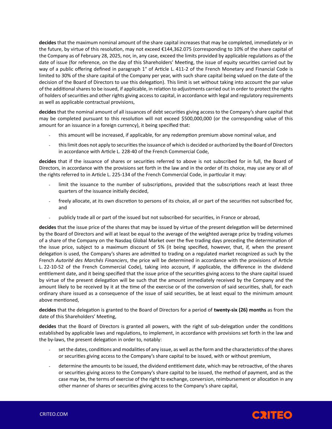 CRITEO.COM decides that the maximum nominal amount of the share capital increases that may be completed, immediately or in the future, by virtue of this resolution, may not exceed €144,362.075 (corresponding to 10% of the share capital of the Company as of February 28, 2025, nor, in, any case, exceed the limits provided by applicable regulations as of the date of issue (for reference, on the day of this Shareholders’ Meeting, the issue of equity securities carried out by way of a public offering defined in paragraph 1° of Article L. 411-2 of the French Monetary and Financial Code is limited to 30% of the share capital of the Company per year, with such share capital being valued on the date of the decision of the Board of Directors to use this delegation). This limit is set without taking into account the par value of the additional shares to be issued, if applicable, in relation to adjustments carried out in order to protect the rights of holders of securities and other rights giving access to capital, in accordance with legal and regulatory requirements as well as applicable contractual provisions, decides that the nominal amount of all issuances of debt securities giving access to the Company’s share capital that may be completed pursuant to this resolution will not exceed $500,000,000 (or the corresponding value of this amount for an issuance in a foreign currency), it being specified that: - this amount will be increased, if applicable, for any redemption premium above nominal value, and - this limit does not apply to securities the issuance of which is decided or authorized by the Board of Directors in accordance with Article L. 228-40 of the French Commercial Code, decides that if the issuance of shares or securities referred to above is not subscribed for in full, the Board of Directors, in accordance with the provisions set forth in the law and in the order of its choice, may use any or all of the rights referred to in Article L. 225-134 of the French Commercial Code, in particular it may: - limit the issuance to the number of subscriptions, provided that the subscriptions reach at least three quarters of the issuance initially decided, - freely allocate, at its own discretion to persons of its choice, all or part of the securities not subscribed for, and - publicly trade all or part of the issued but not subscribed-for securities, in France or abroad, decides that the issue price of the shares that may be issued by virtue of the present delegation will be determined by the Board of Directors and will at least be equal to the average of the weighted average price by trading volumes of a share of the Company on the Nasdaq Global Market over the five trading days preceding the determination of the issue price, subject to a maximum discount of 5% (it being specified, however, that, if, when the present delegation is used, the Company’s shares are admitted to trading on a regulated market recognized as such by the French Autorité des Marchés Financiers, the price will be determined in accordance with the provisions of Article L. 22-10-52 of the French Commercial Code), taking into account, if applicable, the difference in the dividend entitlement date, and it being specified that the issue price of the securities giving access to the share capital issued by virtue of the present delegation will be such that the amount immediately received by the Company and the amount likely to be received by it at the time of the exercise or of the conversion of said securities, shall, for each ordinary share issued as a consequence of the issue of said securities, be at least equal to the minimum amount above mentioned, decides that the delegation is granted to the Board of Directors for a period of twenty-six (26) months as from the date of this Shareholders’ Meeting, decides that the Board of Directors is granted all powers, with the right of sub-delegation under the conditions established by applicable laws and regulations, to implement, in accordance with provisions set forth in the law and the by-laws, the present delegation in order to, notably: - set the dates, conditions and modalities of any issue, as well as the form and the characteristics of the shares or securities giving access to the Company’s share capital to be issued, with or without premium, - determine the amounts to be issued, the dividend entitlement date, which may be retroactive, of the shares or securities giving access to the Company’s share capital to be issued, the method of payment, and as the case may be, the terms of exercise of the right to exchange, conversion, reimbursement or allocation in any other manner of shares or securities giving access to the Company’s share capital,