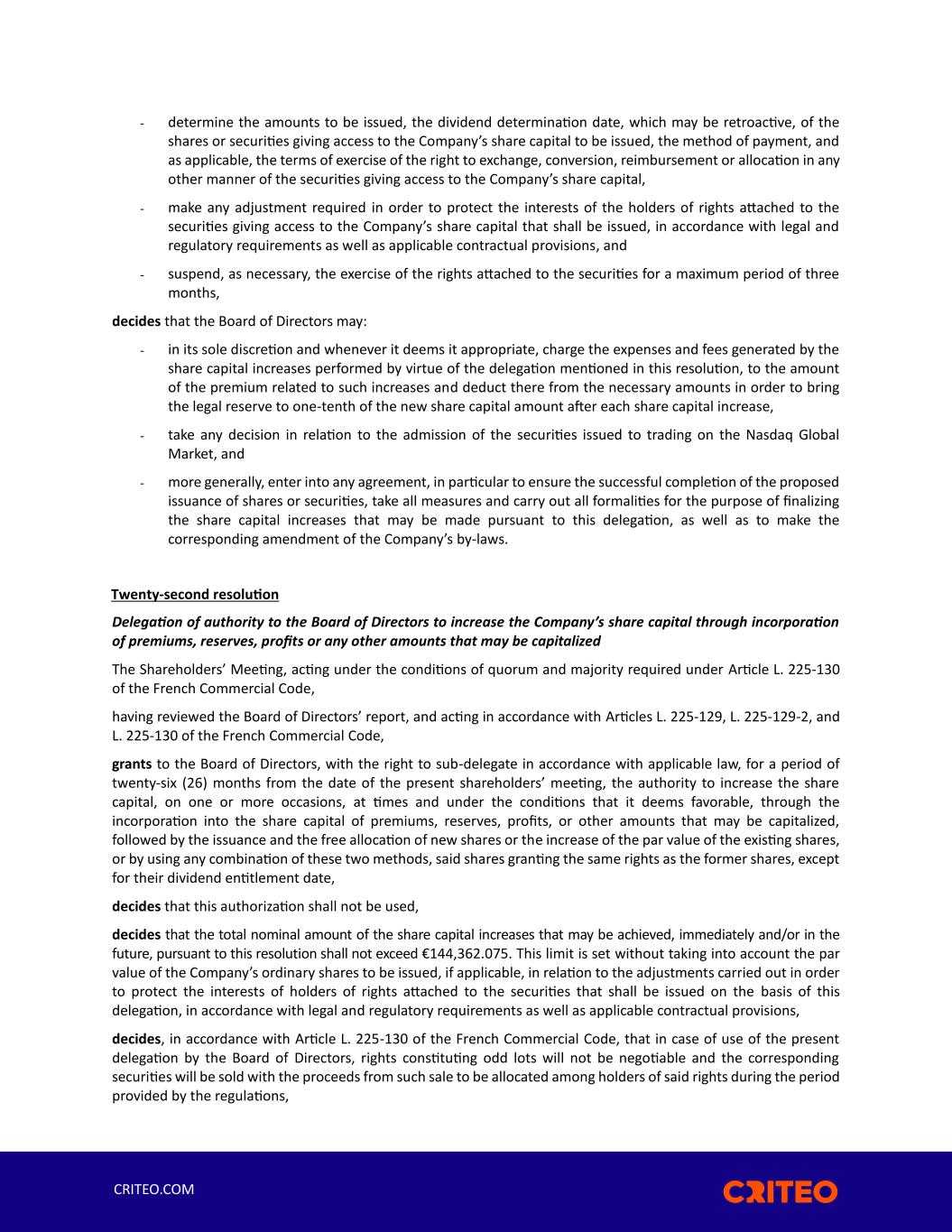 CRITEO.COM - determine the amounts to be issued, the dividend determination date, which may be retroactive, of the shares or securities giving access to the Company’s share capital to be issued, the method of payment, and as applicable, the terms of exercise of the right to exchange, conversion, reimbursement or allocation in any other manner of the securities giving access to the Company’s share capital, - make any adjustment required in order to protect the interests of the holders of rights attached to the securities giving access to the Company’s share capital that shall be issued, in accordance with legal and regulatory requirements as well as applicable contractual provisions, and - suspend, as necessary, the exercise of the rights attached to the securities for a maximum period of three months, decides that the Board of Directors may: - in its sole discretion and whenever it deems it appropriate, charge the expenses and fees generated by the share capital increases performed by virtue of the delegation mentioned in this resolution, to the amount of the premium related to such increases and deduct there from the necessary amounts in order to bring the legal reserve to one-tenth of the new share capital amount after each share capital increase, - take any decision in relation to the admission of the securities issued to trading on the Nasdaq Global Market, and - more generally, enter into any agreement, in particular to ensure the successful completion of the proposed issuance of shares or securities, take all measures and carry out all formalities for the purpose of finalizing the share capital increases that may be made pursuant to this delegation, as well as to make the corresponding amendment of the Company’s by-laws. Twenty-second resolution Delegation of authority to the Board of Directors to increase the Company’s share capital through incorporation of premiums, reserves, profits or any other amounts that may be capitalized The Shareholders’ Meeting, acting under the conditions of quorum and majority required under Article L. 225-130 of the French Commercial Code, having reviewed the Board of Directors’ report, and acting in accordance with Articles L. 225-129, L. 225-129-2, and L. 225-130 of the French Commercial Code, grants to the Board of Directors, with the right to sub-delegate in accordance with applicable law, for a period of twenty-six (26) months from the date of the present shareholders’ meeting, the authority to increase the share capital, on one or more occasions, at times and under the conditions that it deems favorable, through the incorporation into the share capital of premiums, reserves, profits, or other amounts that may be capitalized, followed by the issuance and the free allocation of new shares or the increase of the par value of the existing shares, or by using any combination of these two methods, said shares granting the same rights as the former shares, except for their dividend entitlement date, decides that this authorization shall not be used, decides that the total nominal amount of the share capital increases that may be achieved, immediately and/or in the future, pursuant to this resolution shall not exceed €144,362.075. This limit is set without taking into account the par value of the Company’s ordinary shares to be issued, if applicable, in relation to the adjustments carried out in order to protect the interests of holders of rights attached to the securities that shall be issued on the basis of this delegation, in accordance with legal and regulatory requirements as well as applicable contractual provisions, decides, in accordance with Article L. 225-130 of the French Commercial Code, that in case of use of the present delegation by the Board of Directors, rights constituting odd lots will not be negotiable and the corresponding securities will be sold with the proceeds from such sale to be allocated among holders of said rights during the period provided by the regulations,