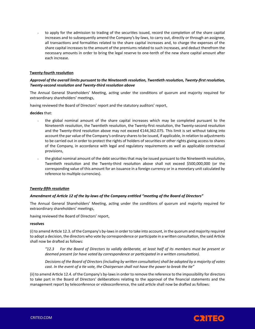 CRITEO.COM - to apply for the admission to trading of the securities issued, record the completion of the share capital increases and to subsequently amend the Company’s by-laws, to carry out, directly or through an assignee, all transactions and formalities related to the share capital increases and, to charge the expenses of the share capital increases to the amount of the premiums related to such increases, and deduct therefrom the necessary amounts in order to bring the legal reserve to one-tenth of the new share capital amount after each increase. Twenty-fourth resolution Approval of the overall limits pursuant to the Nineteenth resolution, Twentieth resolution, Twenty-first resolution, Twenty-second resolution and Twenty-third resolution above The Annual General Shareholders’ Meeting, acting under the conditions of quorum and majority required for extraordinary shareholders’ meetings, having reviewed the Board of Directors’ report and the statutory auditors’ report, decides that: - the global nominal amount of the share capital increases which may be completed pursuant to the Nineteenth resolution, the Twentieth resolution, the Twenty-first resolution, the Twenty-second resolution and the Twenty-third resolution above may not exceed €144,362.075. This limit is set without taking into account the par value of the Company’s ordinary shares to be issued, if applicable, in relation to adjustments to be carried out in order to protect the rights of holders of securities or other rights giving access to shares of the Company, in accordance with legal and regulatory requirements as well as applicable contractual provisions, - the global nominal amount of the debt securities that may be issued pursuant to the Nineteenth resolution, Twentieth resolution and the Twenty-third resolution above shall not exceed $500,000,000 (or the corresponding value of this amount for an issuance in a foreign currency or in a monetary unit calculated by reference to multiple currencies). Twenty-fifth resolution Amendment of Article 12 of the by-laws of the Company entitled “meeting of the Board of Directors” The Annual General Shareholders’ Meeting, acting under the conditions of quorum and majority required for extraordinary shareholders’ meetings, having reviewed the Board of Directors’ report, resolves (i) to amend Article 12.3. of the Company's by-laws in order to take into account, in the quorum and majority required to adopt a decision, the directors who vote by correspondence or participate in a written consultation, the said Article shall now be drafted as follows: “12.3 For the Board of Directors to validly deliberate, at least half of its members must be present or deemed present (or have voted by correspondence or participated in a written consultation). Decisions of the Board of Directors (including by written consultation) shall be adopted by a majority of votes cast. In the event of a tie vote, the Chairperson shall not have the power to break the tie” (ii) to amend Article 12.4. of the Company's by-laws in order to remove the reference to the impossibility for directors to take part in the Board of Directors' deliberations relating to the approval of the financial statements and the management report by teleconference or videoconference, the said article shall now be drafted as follows: