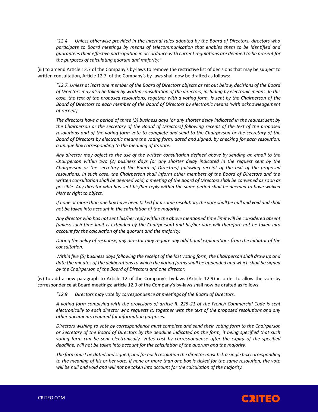 CRITEO.COM “12.4 Unless otherwise provided in the internal rules adopted by the Board of Directors, directors who participate to Board meetings by means of telecommunication that enables them to be identified and guarantees their effective participation in accordance with current regulations are deemed to be present for the purposes of calculating quorum and majority.” (iii) to amend Article 12.7 of the Company's by-laws to remove the restrictive list of decisions that may be subject to written consultation, Article 12.7. of the Company’s by-laws shall now be drafted as follows: “12.7. Unless at least one member of the Board of Directors objects as set out below, decisions of the Board of Directors may also be taken by written consultation of the directors, including by electronic means. In this case, the text of the proposed resolutions, together with a voting form, is sent by the Chairperson of the Board of Directors to each member of the Board of Directors by electronic means (with acknowledgement of receipt). The directors have a period of three (3) business days (or any shorter delay indicated in the request sent by the Chairperson or the secretary of the Board of Directors) following receipt of the text of the proposed resolutions and of the voting form vote to complete and send to the Chairperson or the secretary of the Board of Directors by electronic means the voting form, dated and signed, by checking for each resolution, a unique box corresponding to the meaning of its vote. Any director may object to the use of the written consultation defined above by sending an email to the Chairperson within two (2) business days (or any shorter delay indicated in the request sent by the Chairperson or the secretary of the Board of Directors) following receipt of the text of the proposed resolutions. In such case, the Chairperson shall inform other members of the Board of Directors and the written consultation shall be deemed void; a meeting of the Board of Directors shall be convened as soon as possible. Any director who has sent his/her reply within the same period shall be deemed to have waived his/her right to object. If none or more than one box have been ticked for a same resolution, the vote shall be null and void and shall not be taken into account in the calculation of the majority. Any director who has not sent his/her reply within the above mentioned time limit will be considered absent (unless such time limit is extended by the Chairperson) and his/her vote will therefore not be taken into account for the calculation of the quorum and the majority. During the delay of response, any director may require any additional explanations from the initiator of the consultation. Within five (5) business days following the receipt of the last voting form, the Chairperson shall draw up and date the minutes of the deliberations to which the voting forms shall be appended and which shall be signed by the Chairperson of the Board of Directors and one director. (iv) to add a new paragraph to Article 12 of the Company’s by-laws (Article 12.9) in order to allow the vote by correspondence at Board meetings; article 12.9 of the Company’s by-laws shall now be drafted as follows: “12.9 Directors may vote by correspondence at meetings of the Board of Directors. A voting form complying with the provisions of article R. 225-21 of the French Commercial Code is sent electronically to each director who requests it, together with the text of the proposed resolutions and any other documents required for information purposes. Directors wishing to vote by correspondence must complete and send their voting form to the Chairperson or Secretary of the Board of Directors by the deadline indicated on the form, it being specified that such voting form can be sent electronically. Votes cast by correspondence after the expiry of the specified deadline, will not be taken into account for the calculation of the quorum and the majority. The form must be dated and signed, and for each resolution the director must tick a single box corresponding to the meaning of his or her vote. If none or more than one box is ticked for the same resolution, the vote will be null and void and will not be taken into account for the calculation of the majority.