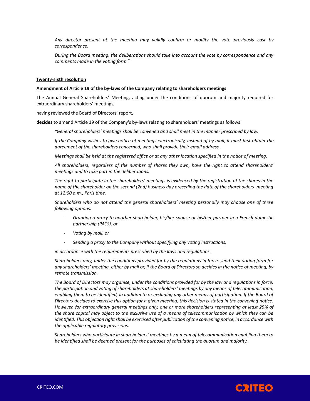 CRITEO.COM Any director present at the meeting may validly confirm or modify the vote previously cast by correspondence. During the Board meeting, the deliberations should take into account the vote by correspondence and any comments made in the voting form.” Twenty-sixth resolution Amendment of Article 19 of the by-laws of the Company relating to shareholders meetings The Annual General Shareholders’ Meeting, acting under the conditions of quorum and majority required for extraordinary shareholders’ meetings, having reviewed the Board of Directors’ report, decides to amend Article 19 of the Company's by-laws relating to shareholders' meetings as follows: “General shareholders’ meetings shall be convened and shall meet in the manner prescribed by law. If the Company wishes to give notice of meetings electronically, instead of by mail, it must first obtain the agreement of the shareholders concerned, who shall provide their email address. Meetings shall be held at the registered office or at any other location specified in the notice of meeting. All shareholders, regardless of the number of shares they own, have the right to attend shareholders’ meetings and to take part in the deliberations. The right to participate in the shareholders’ meetings is evidenced by the registration of the shares in the name of the shareholder on the second (2nd) business day preceding the date of the shareholders’ meeting at 12:00 a.m., Paris time. Shareholders who do not attend the general shareholders’ meeting personally may choose one of three following options: - Granting a proxy to another shareholder, his/her spouse or his/her partner in a French domestic partnership (PACS), or - Voting by mail, or - Sending a proxy to the Company without specifying any voting instructions, in accordance with the requirements prescribed by the laws and regulations. Shareholders may, under the conditions provided for by the regulations in force, send their voting form for any shareholders’ meeting, either by mail or, if the Board of Directors so decides in the notice of meeting, by remote transmission. The Board of Directors may organise, under the conditions provided for by the law and regulations in force, the participation and voting of shareholders at shareholders’ meetings by any means of telecommunication, enabling them to be identified, in addition to or excluding any other means of participation. If the Board of Directors decides to exercise this option for a given meeting, this decision is stated in the convening notice. However, for extraordinary general meetings only, one or more shareholders representing at least 25% of the share capital may object to the exclusive use of a means of telecommunication by which they can be identified. This objection right shall be exercised after publication of the convening notice, in accordance with the applicable regulatory provisions. Shareholders who participate in shareholders’ meetings by a mean of telecommunication enabling them to be identified shall be deemed present for the purposes of calculating the quorum and majority.