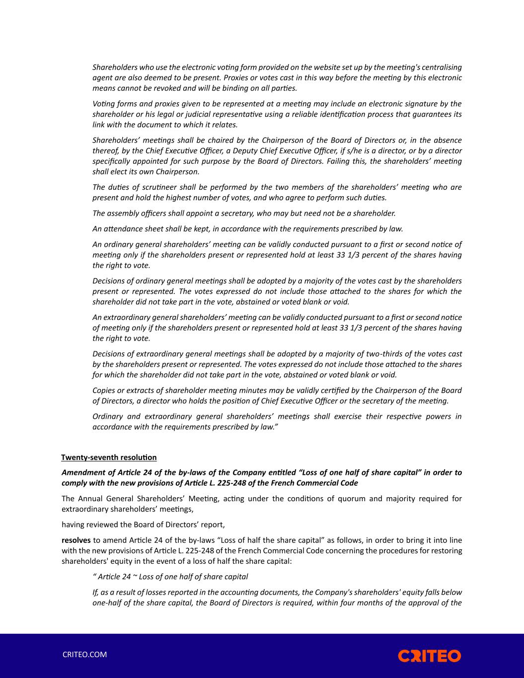 CRITEO.COM Shareholders who use the electronic voting form provided on the website set up by the meeting's centralising agent are also deemed to be present. Proxies or votes cast in this way before the meeting by this electronic means cannot be revoked and will be binding on all parties. Voting forms and proxies given to be represented at a meeting may include an electronic signature by the shareholder or his legal or judicial representative using a reliable identification process that guarantees its link with the document to which it relates. Shareholders’ meetings shall be chaired by the Chairperson of the Board of Directors or, in the absence thereof, by the Chief Executive Officer, a Deputy Chief Executive Officer, if s/he is a director, or by a director specifically appointed for such purpose by the Board of Directors. Failing this, the shareholders’ meeting shall elect its own Chairperson. The duties of scrutineer shall be performed by the two members of the shareholders’ meeting who are present and hold the highest number of votes, and who agree to perform such duties. The assembly officers shall appoint a secretary, who may but need not be a shareholder. An attendance sheet shall be kept, in accordance with the requirements prescribed by law. An ordinary general shareholders’ meeting can be validly conducted pursuant to a first or second notice of meeting only if the shareholders present or represented hold at least 33 1/3 percent of the shares having the right to vote. Decisions of ordinary general meetings shall be adopted by a majority of the votes cast by the shareholders present or represented. The votes expressed do not include those attached to the shares for which the shareholder did not take part in the vote, abstained or voted blank or void. An extraordinary general shareholders’ meeting can be validly conducted pursuant to a first or second notice of meeting only if the shareholders present or represented hold at least 33 1/3 percent of the shares having the right to vote. Decisions of extraordinary general meetings shall be adopted by a majority of two-thirds of the votes cast by the shareholders present or represented. The votes expressed do not include those attached to the shares for which the shareholder did not take part in the vote, abstained or voted blank or void. Copies or extracts of shareholder meeting minutes may be validly certified by the Chairperson of the Board of Directors, a director who holds the position of Chief Executive Officer or the secretary of the meeting. Ordinary and extraordinary general shareholders’ meetings shall exercise their respective powers in accordance with the requirements prescribed by law.” Twenty-seventh resolution Amendment of Article 24 of the by-laws of the Company entitled “Loss of one half of share capital” in order to comply with the new provisions of Article L. 225-248 of the French Commercial Code The Annual General Shareholders’ Meeting, acting under the conditions of quorum and majority required for extraordinary shareholders’ meetings, having reviewed the Board of Directors’ report, resolves to amend Article 24 of the by-laws “Loss of half the share capital” as follows, in order to bring it into line with the new provisions of Article L. 225-248 of the French Commercial Code concerning the procedures for restoring shareholders' equity in the event of a loss of half the share capital: “ Article 24 ~ Loss of one half of share capital If, as a result of losses reported in the accounting documents, the Company's shareholders' equity falls below one-half of the share capital, the Board of Directors is required, within four months of the approval of the
